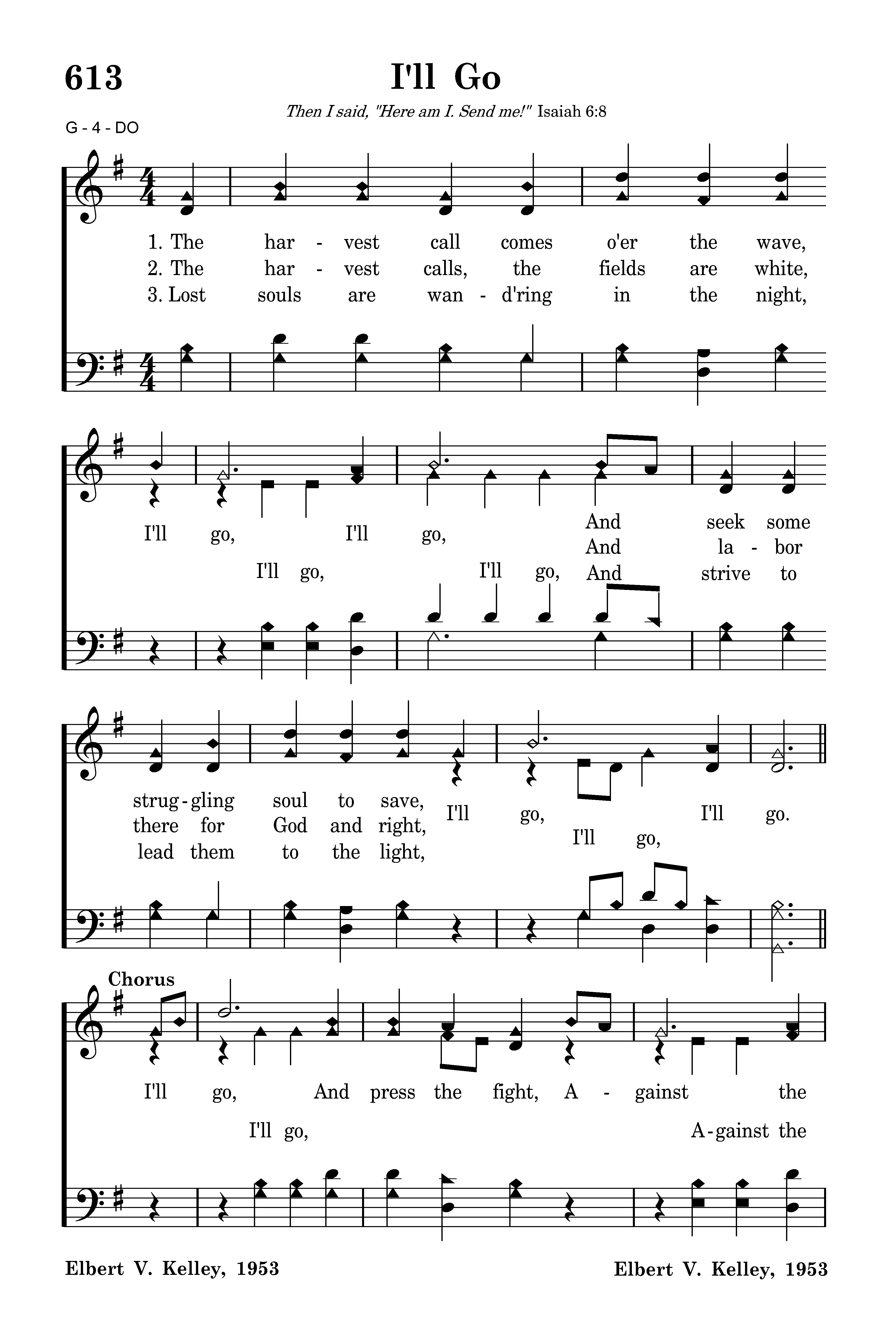 The harvest call comes o'er the wave, I'll go, I'll go, And seek some struggling soul to save, I'll go, I'll go.