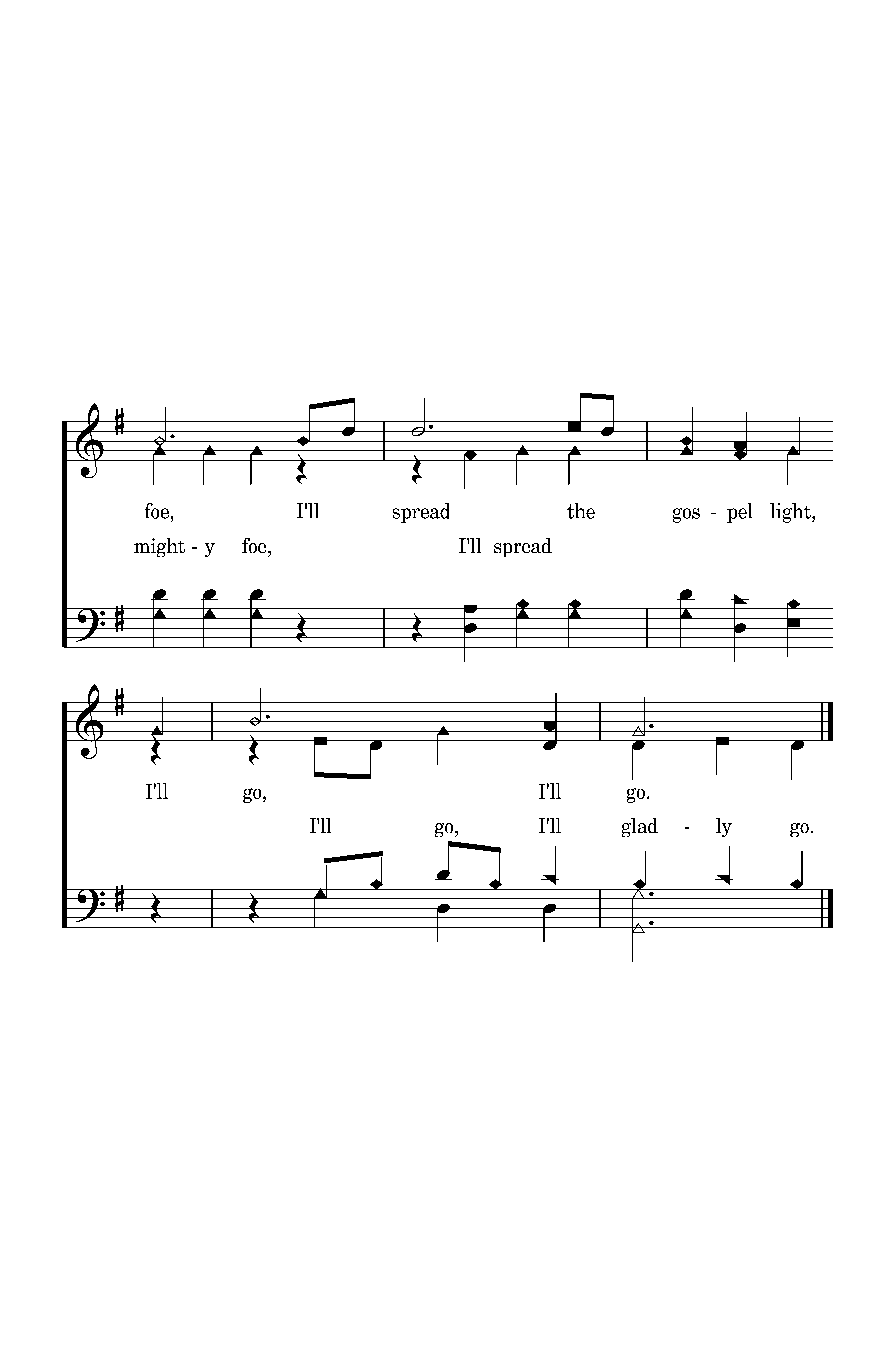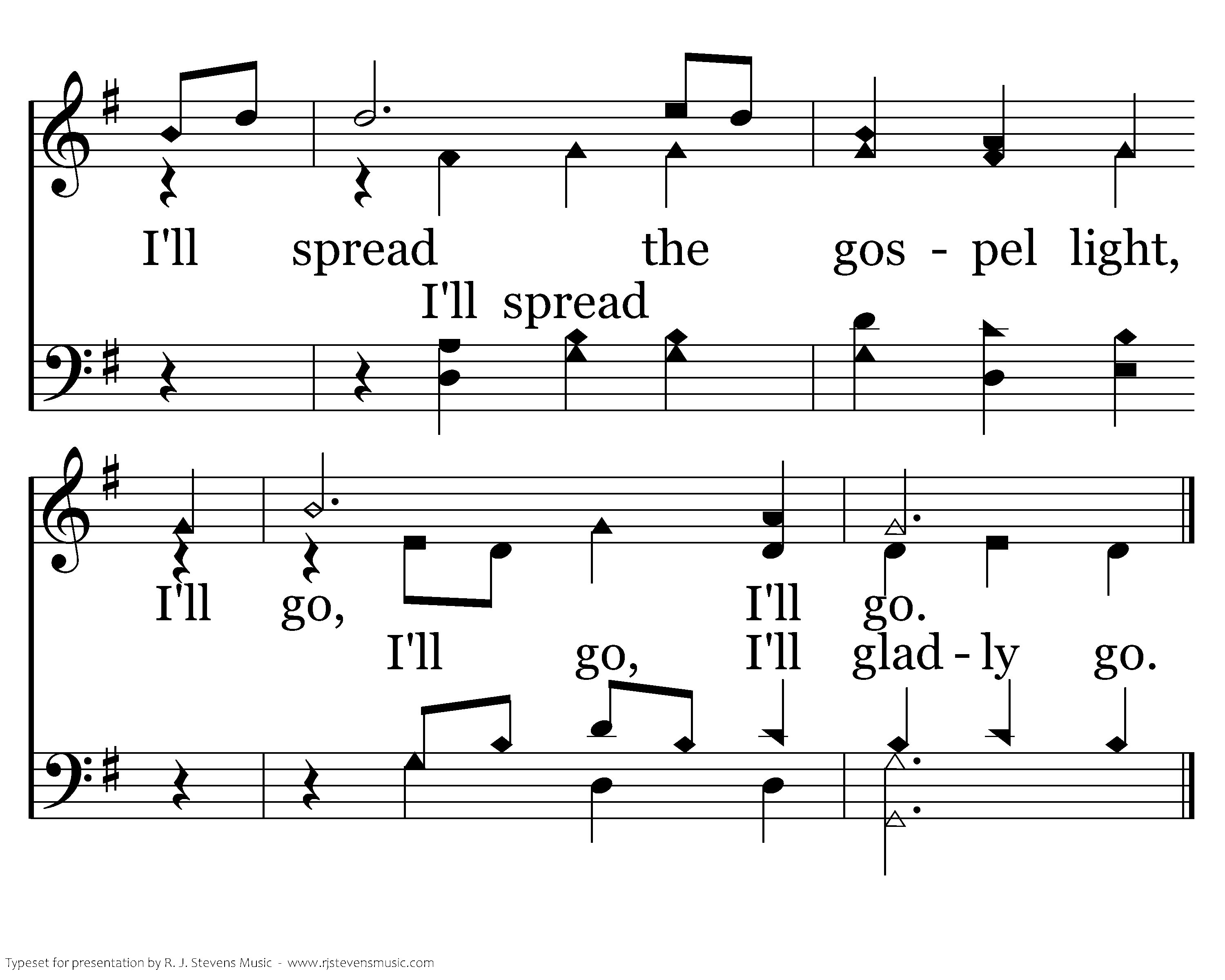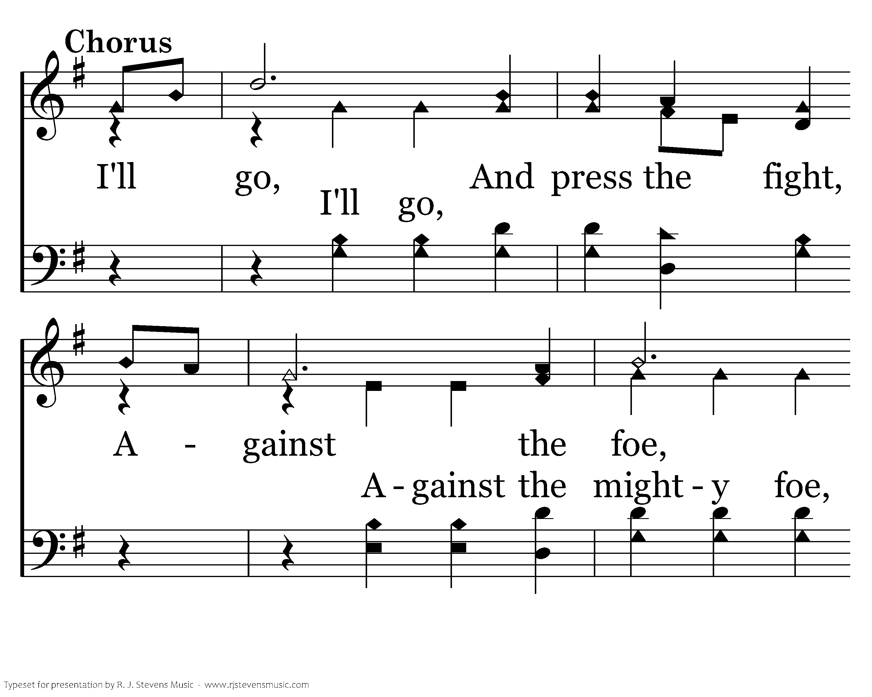 I'll go, and press the fight, Against the foe, I'll spread the gospel light, I'll go, I'll go.
