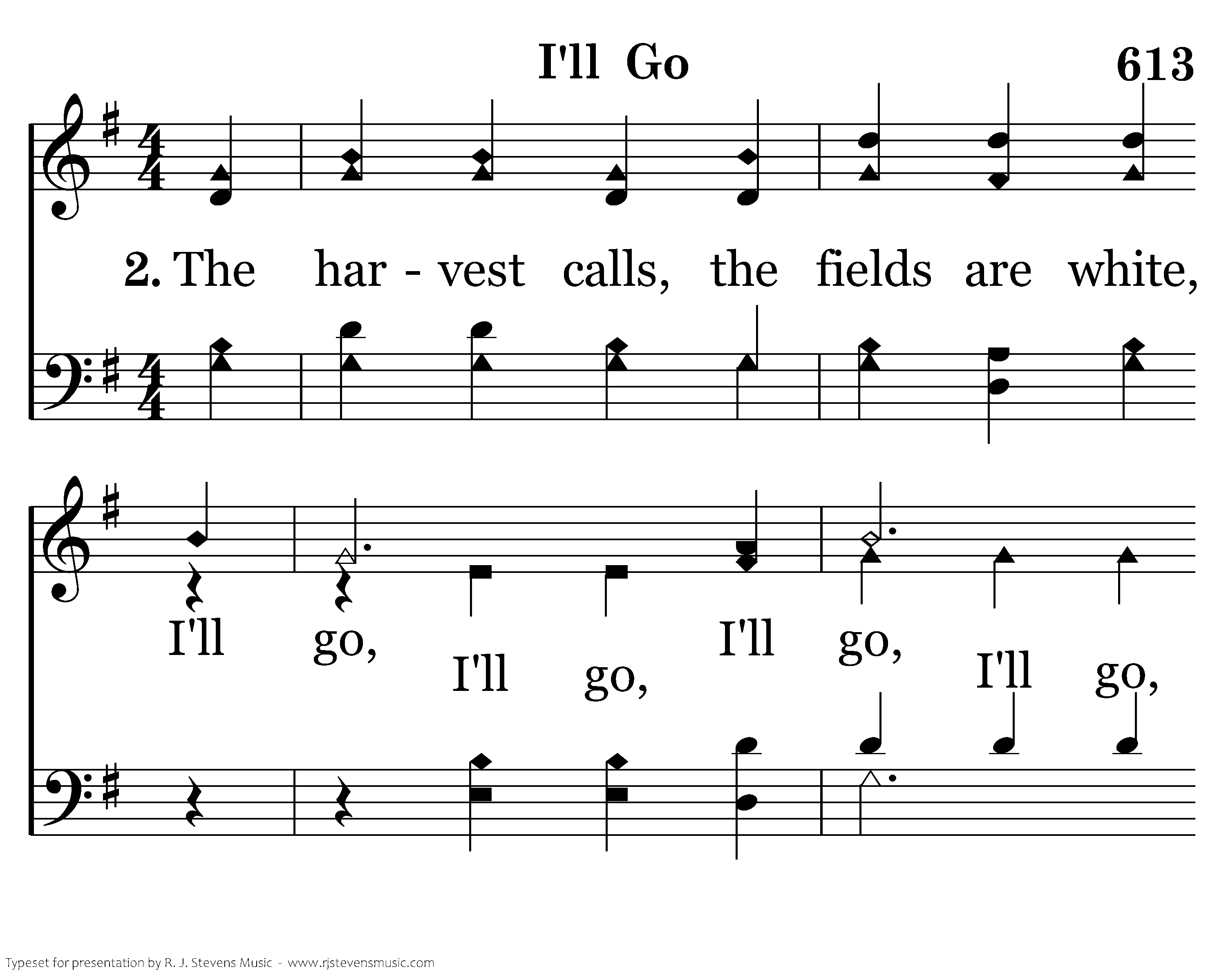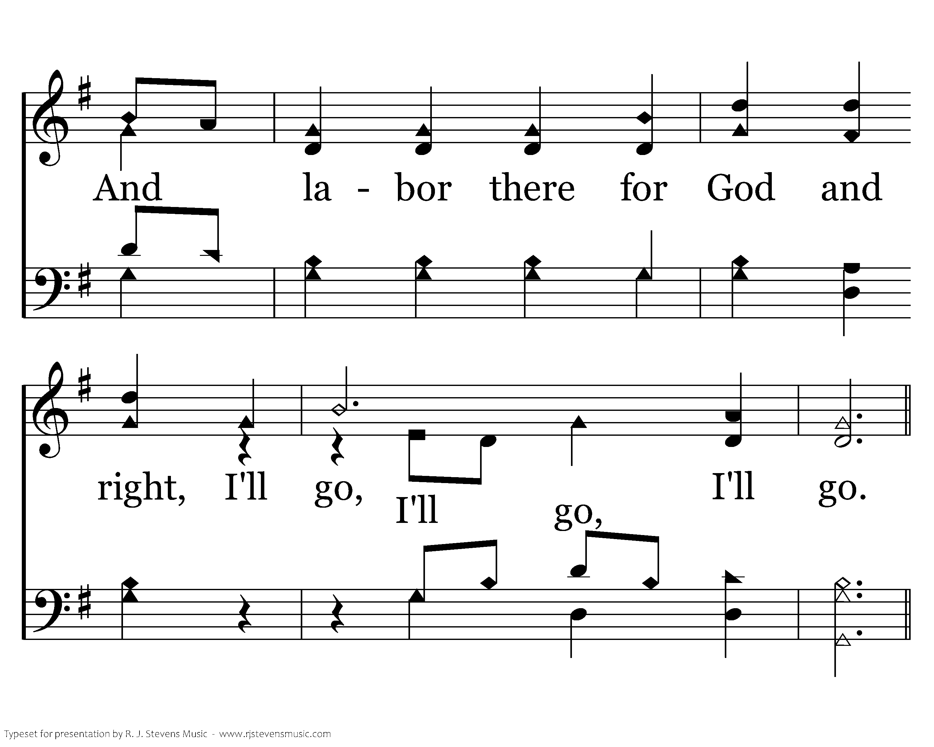 The harvest calls, the fields are white, I'll go, I'll go, And labor there for God and right, I'll go, I'll go.