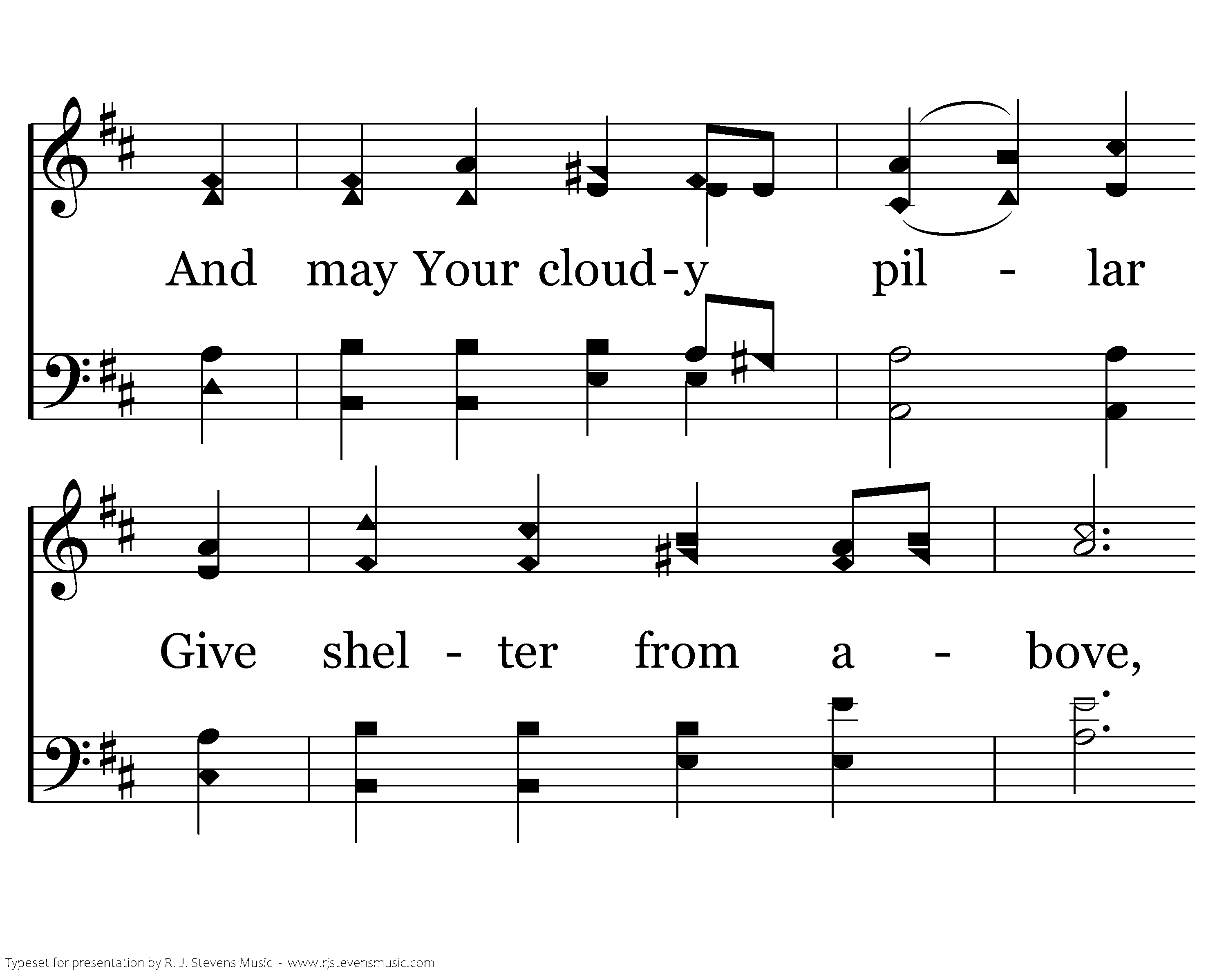 May fire from law and precept Be lit within our hearts, A flame of faith and purpose From words that You impart. And may Your cloudly pillar Give shelter from a bove, A canopy of glory, Of holiness, and love.