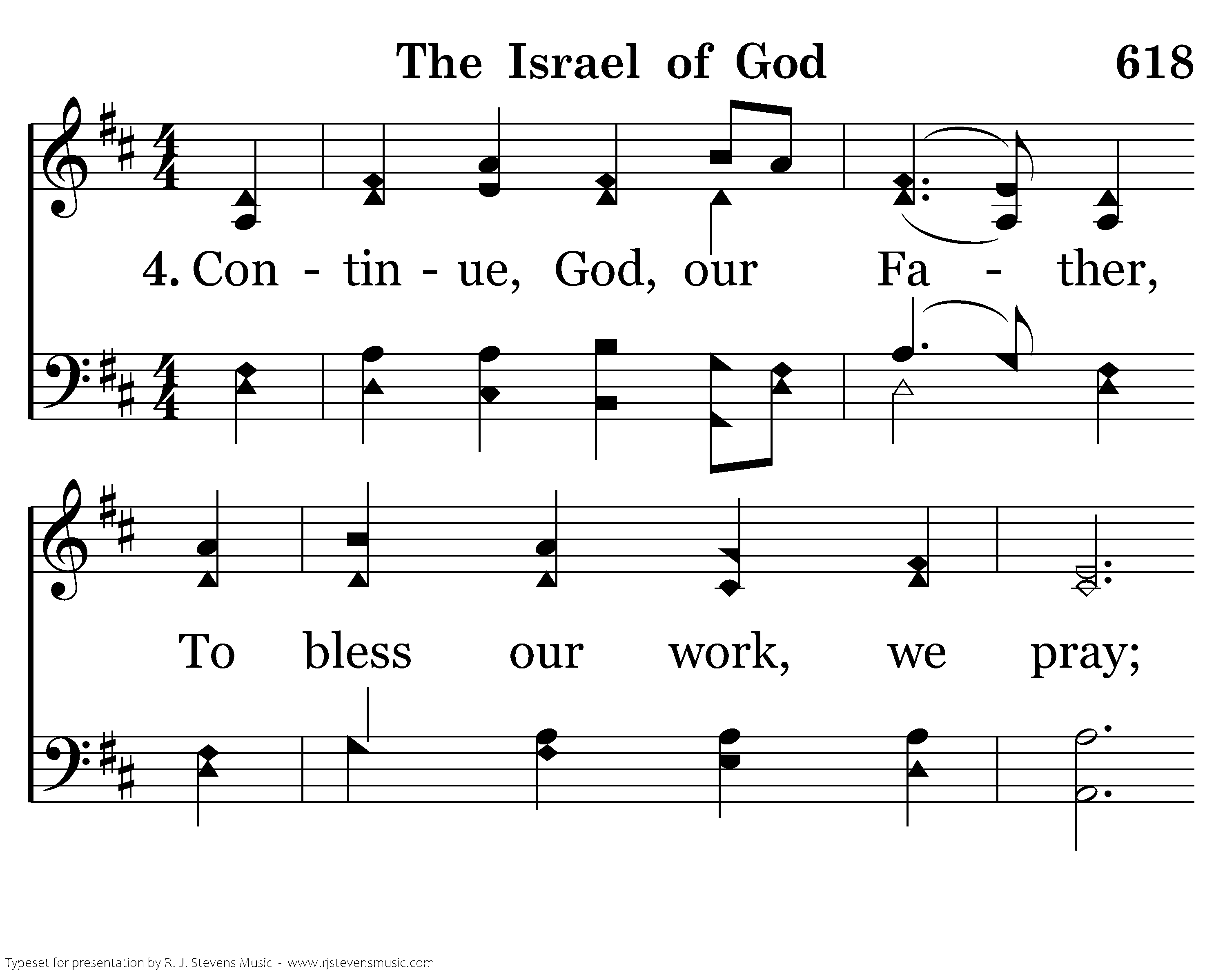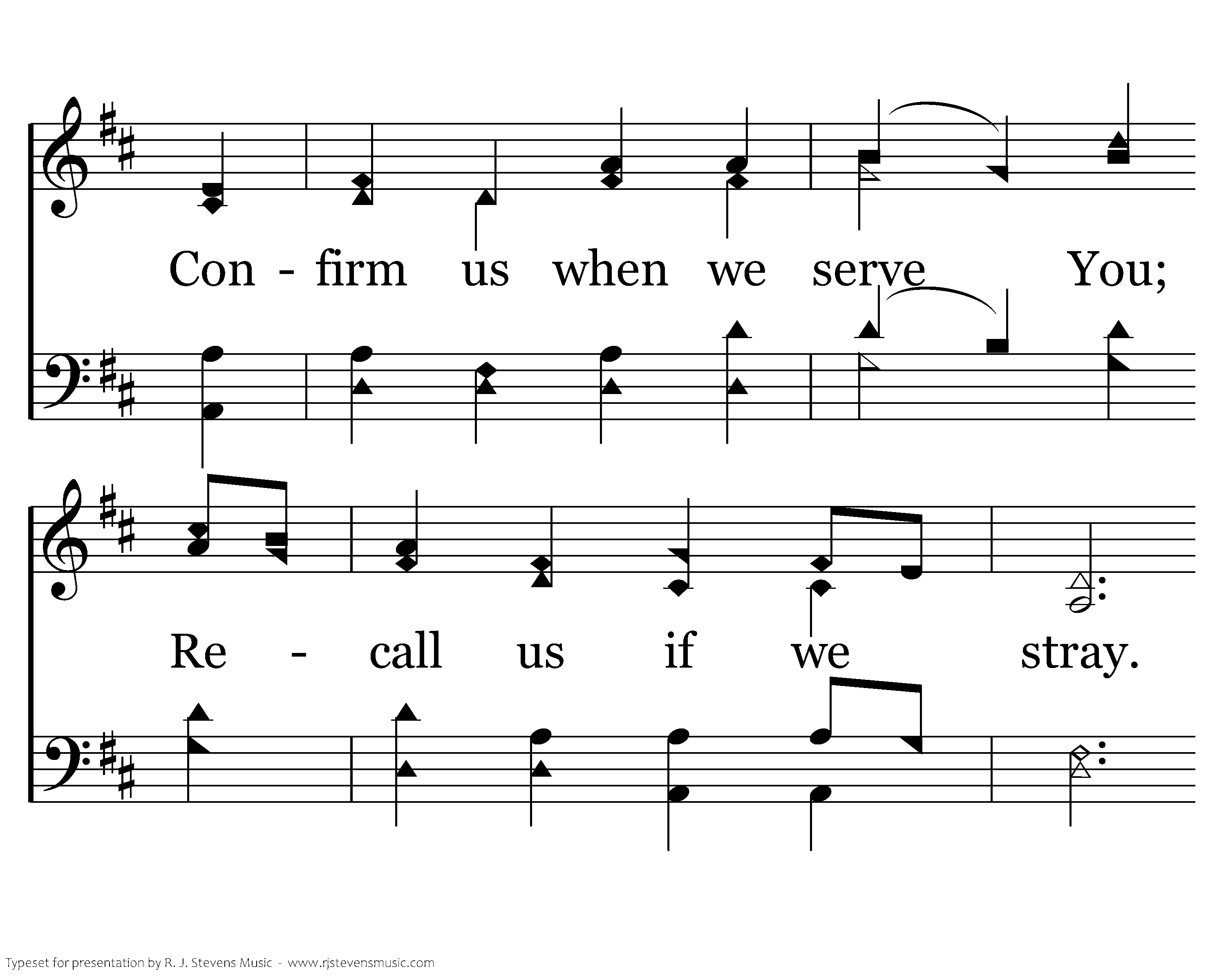 Continue, God, our Father, To bless our work, we pray; Confirm us when we serve You; Recall us If we stray. For we are Yours, though feeble, And wish to serve, though flawed; We are Your only people, And you, our only God.