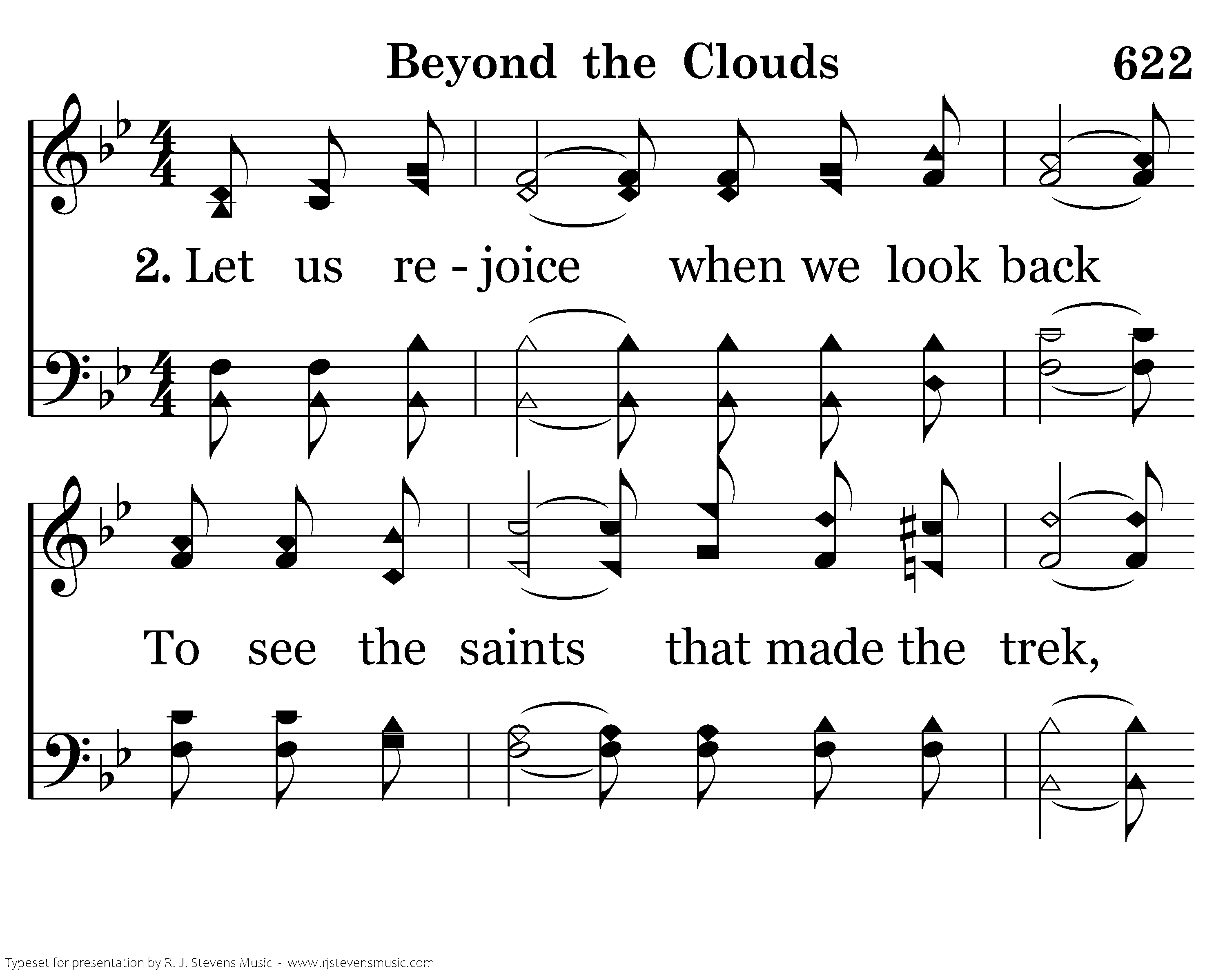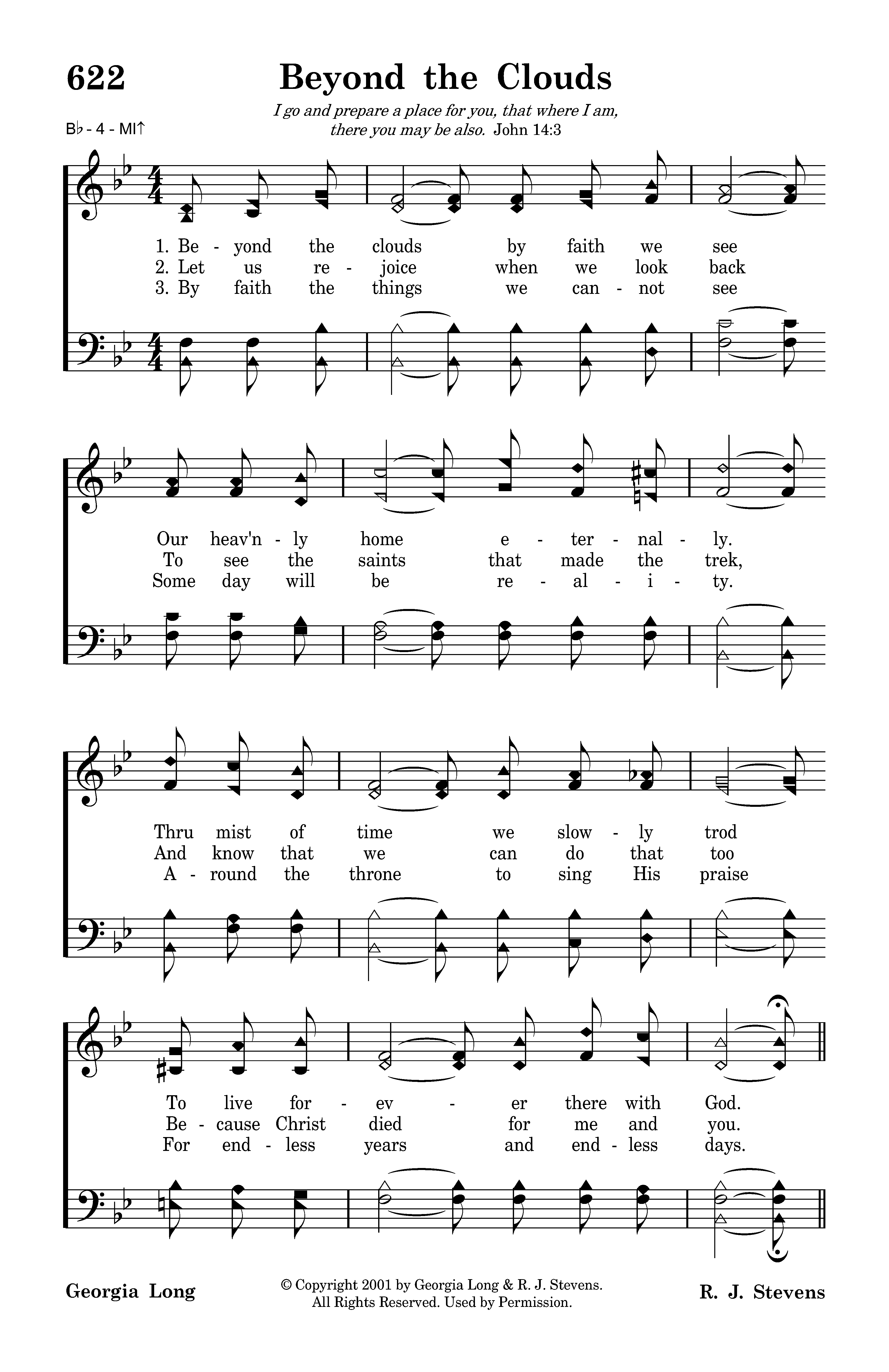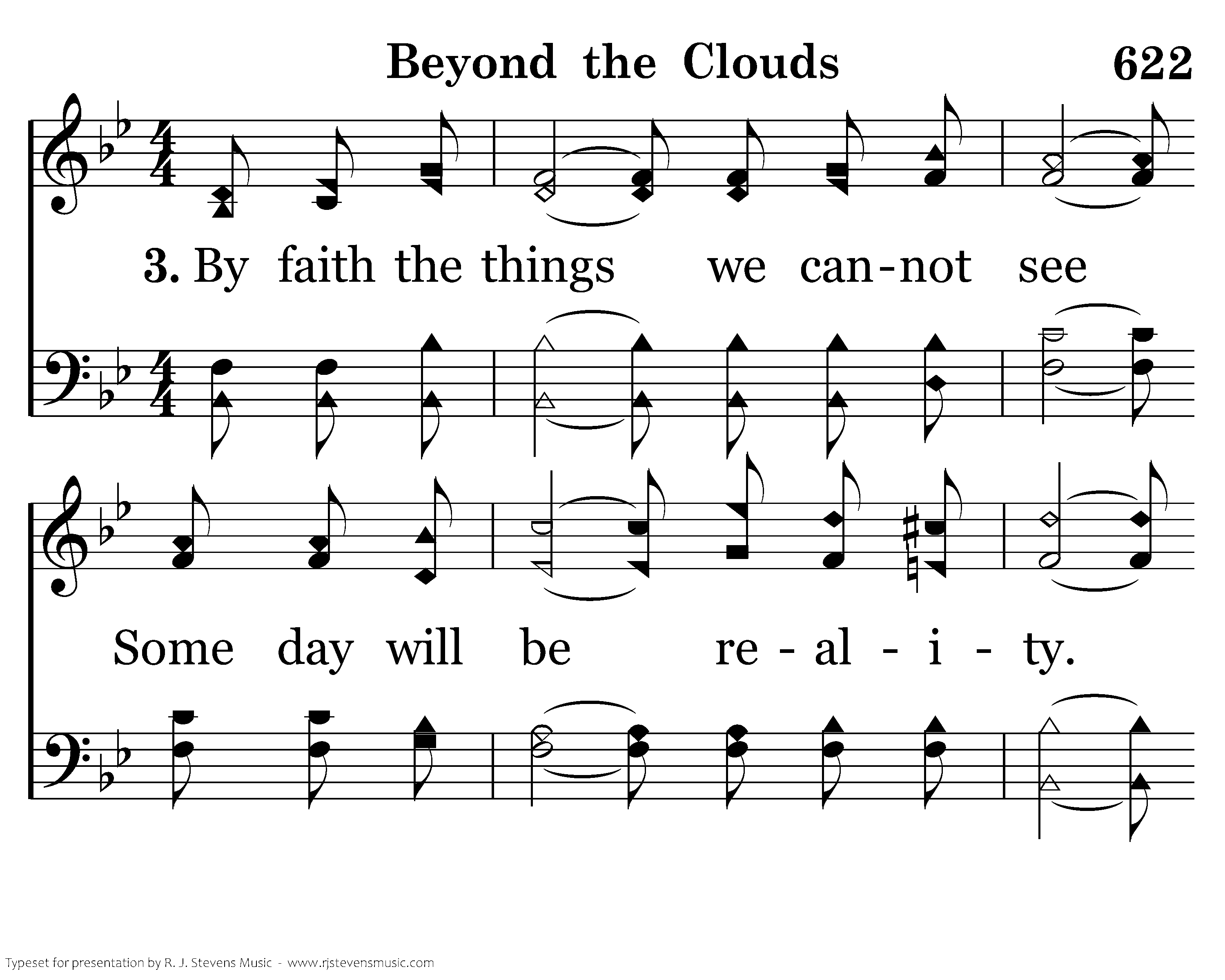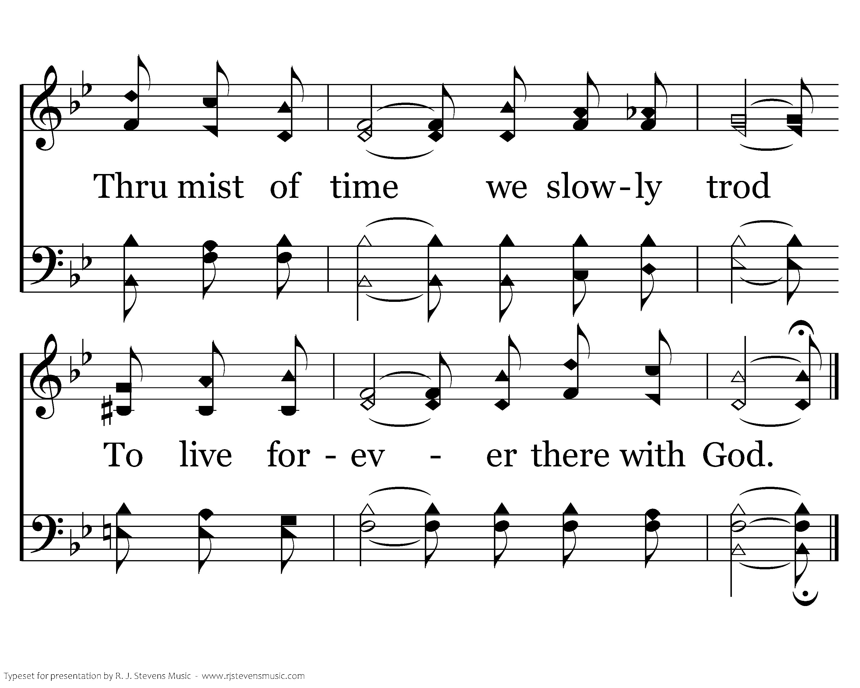 Beyond the clouds by faith we see Our heav'nly home eternally. Thru mist of time we slowly trod To live forever there with God.
