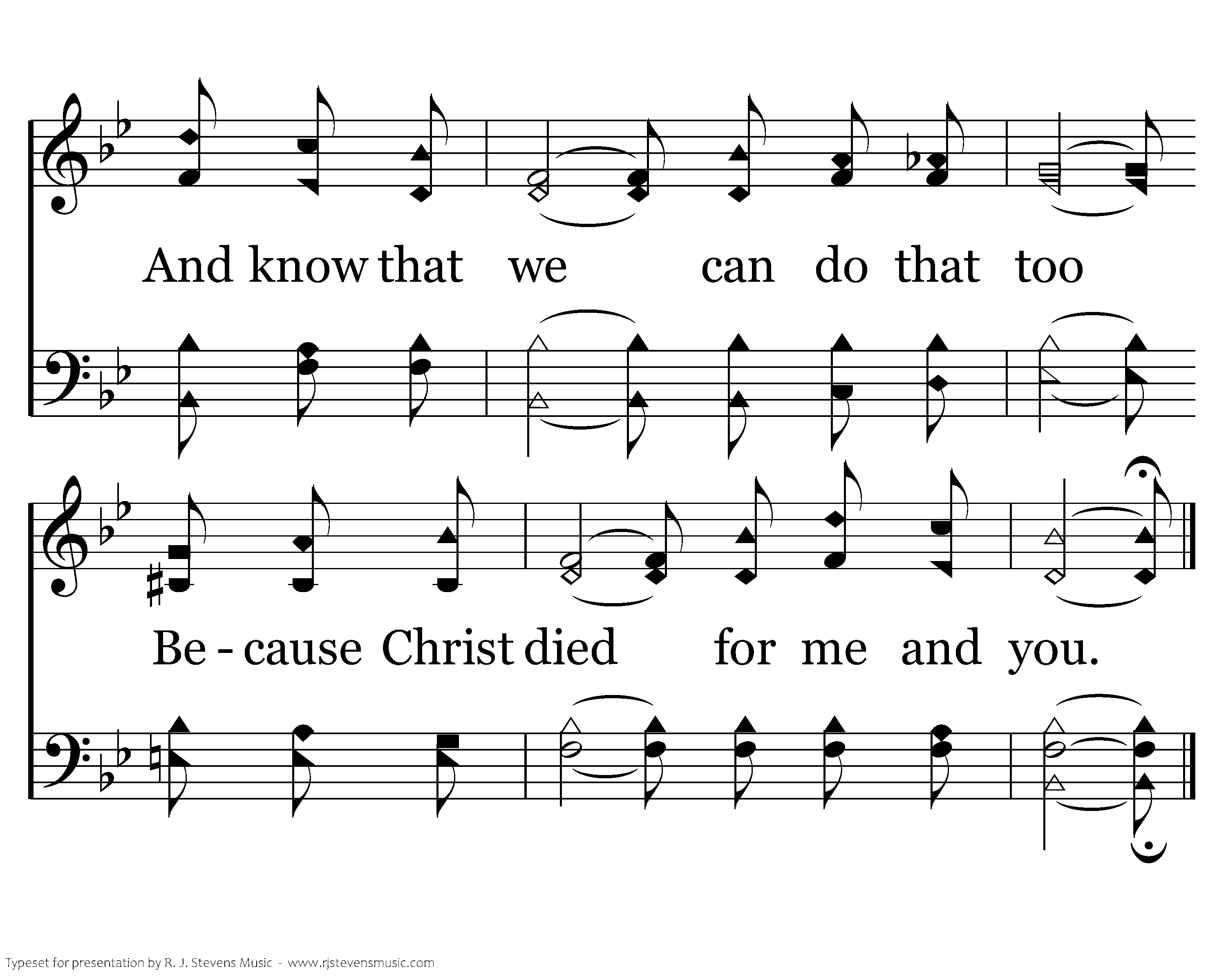 Let us rejoice when we look back To see the saints that made the trek, And know that we can do that too Because Christ died for me and you.