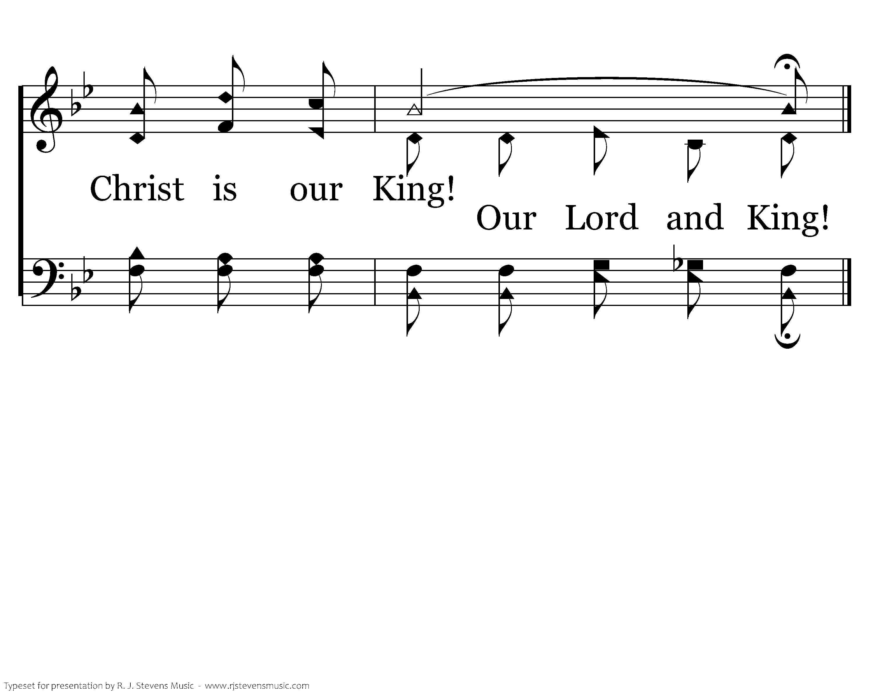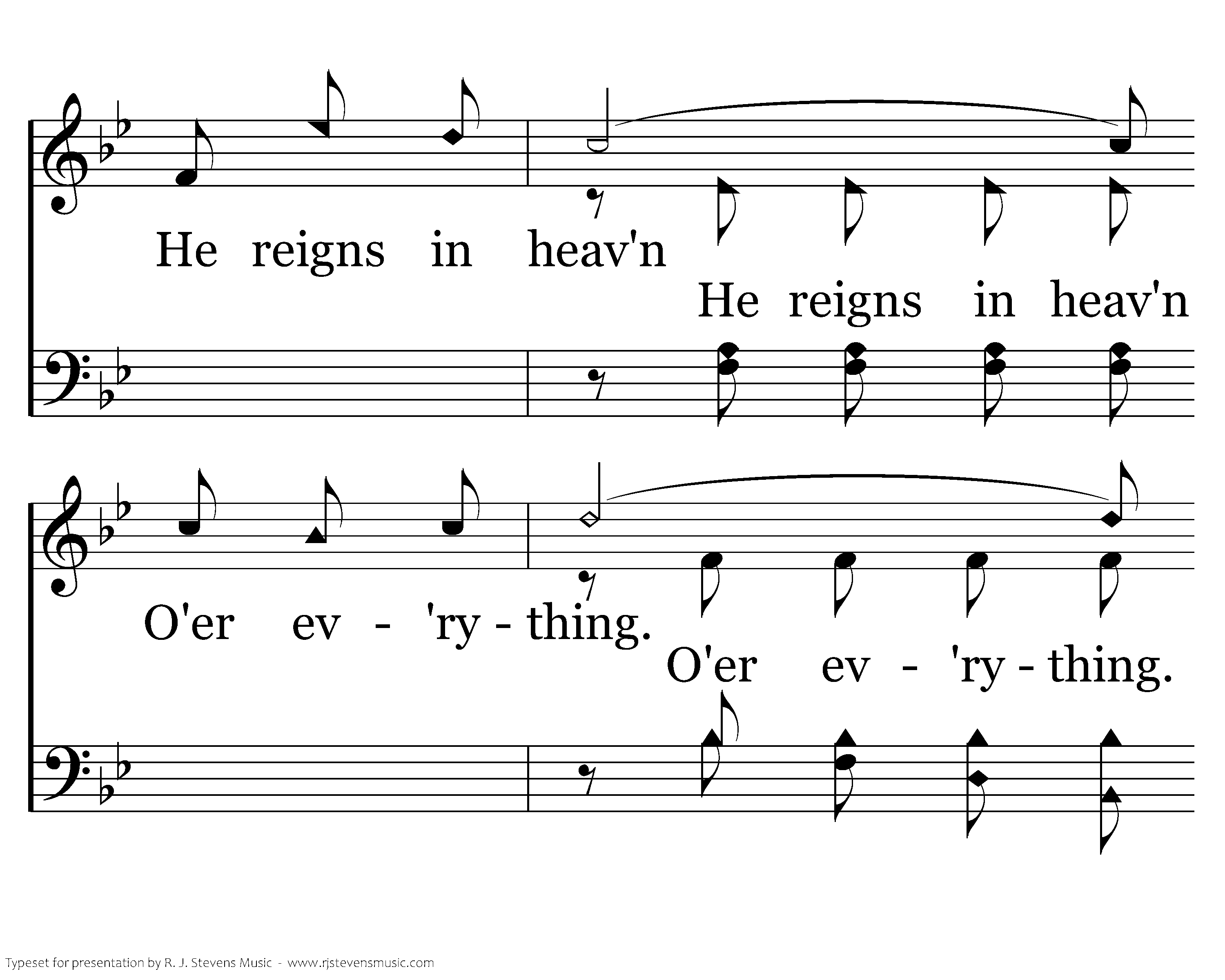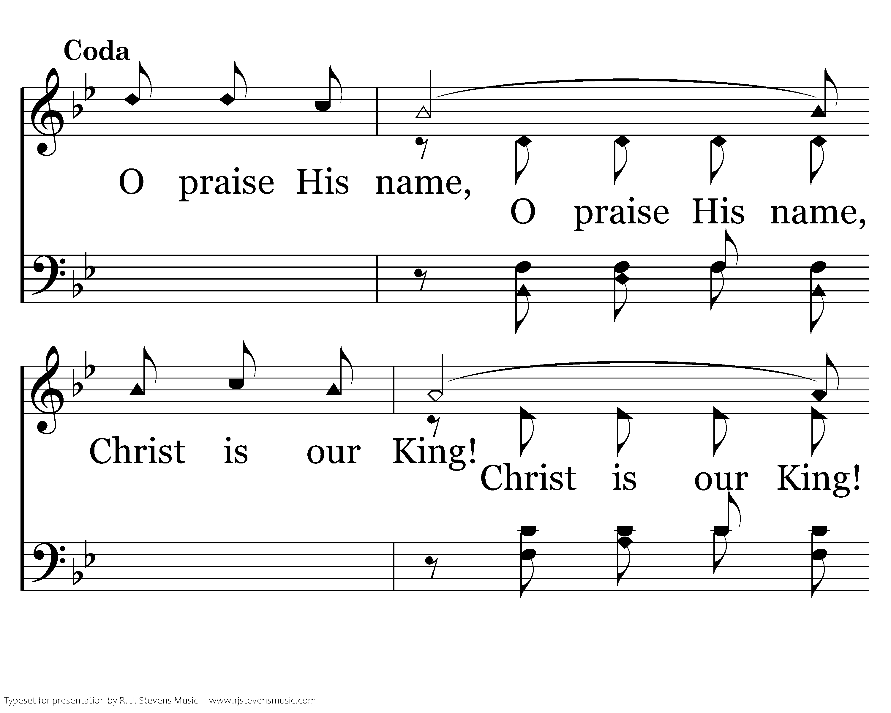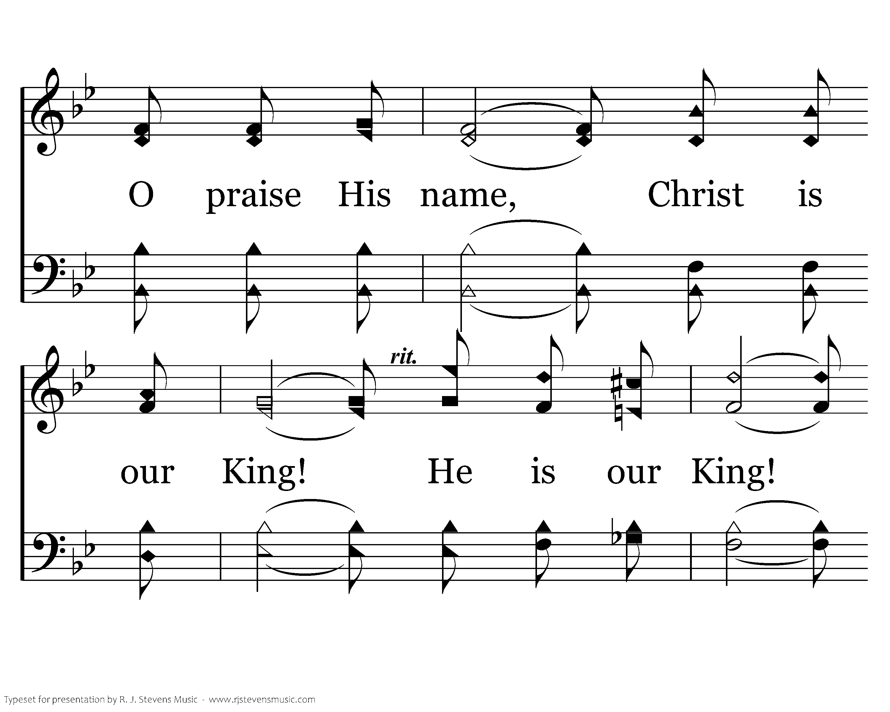 O, praise His name, Christ is our King! He reigns in heav'n O'er ev'rything. O, praise His name, Christ is our King! He is our King! Christ is our King!