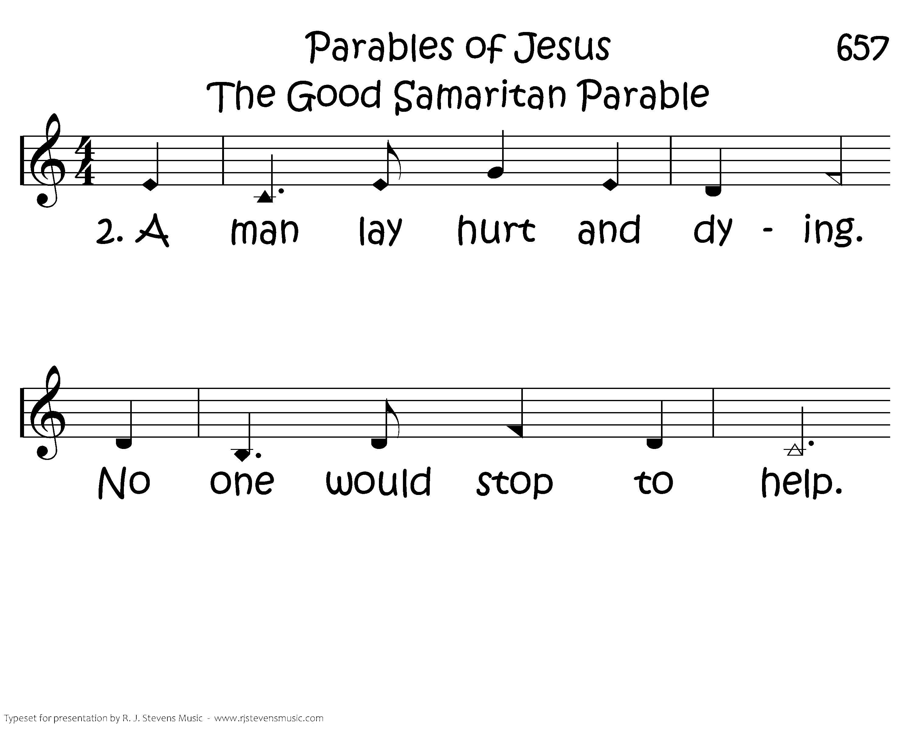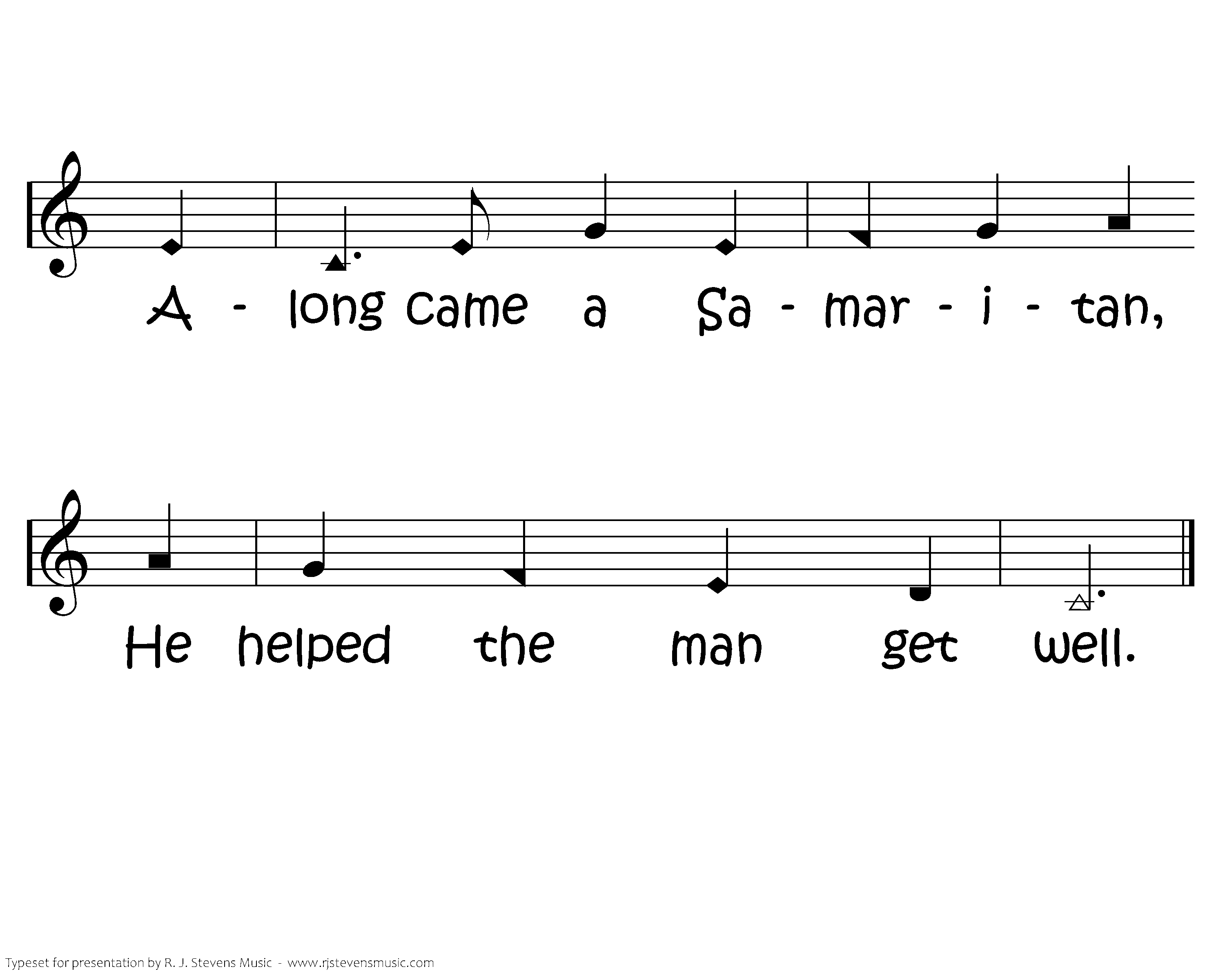 A man lay hurt and dying. No one would stop to help. Along came a Samaritan, He helped the man get well.