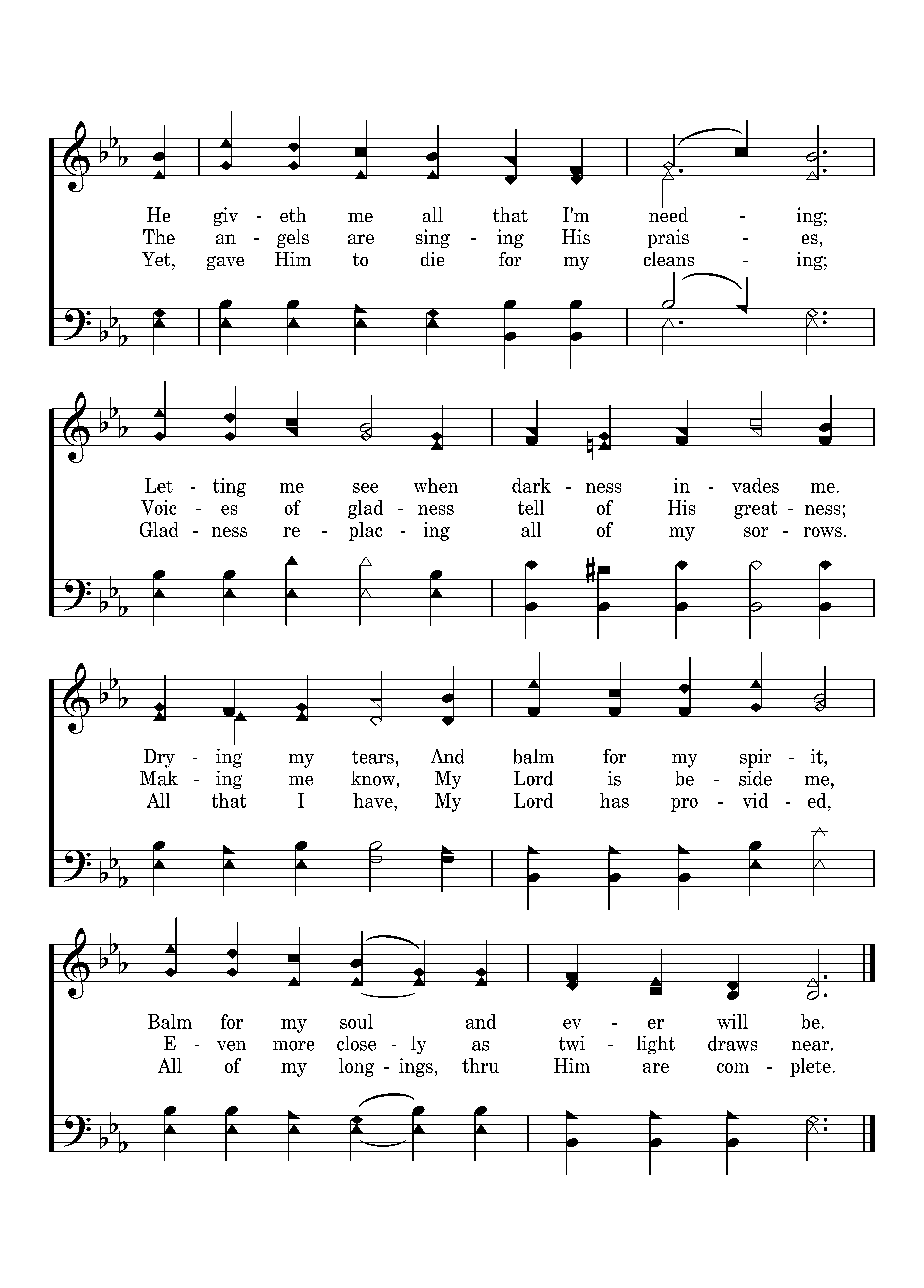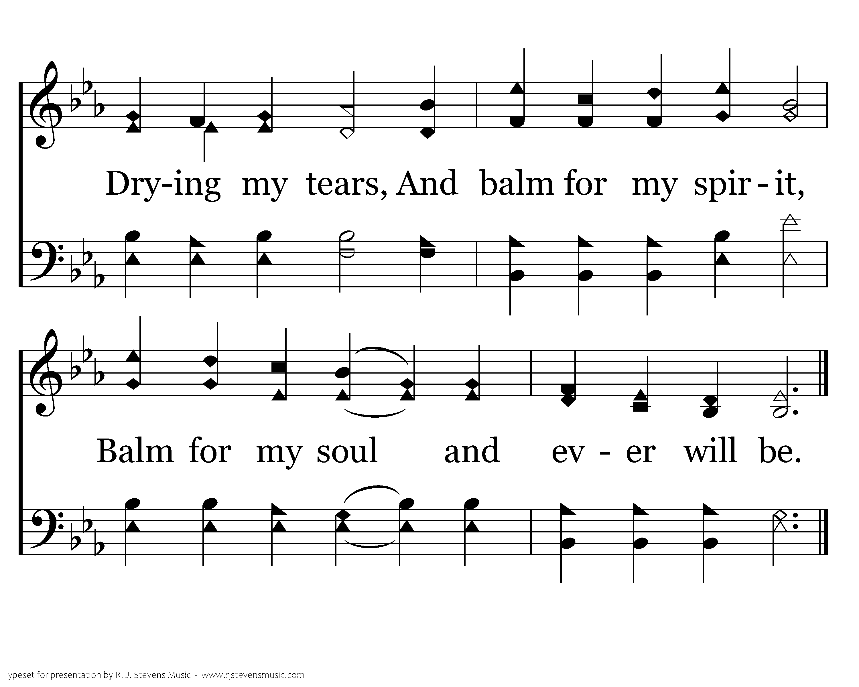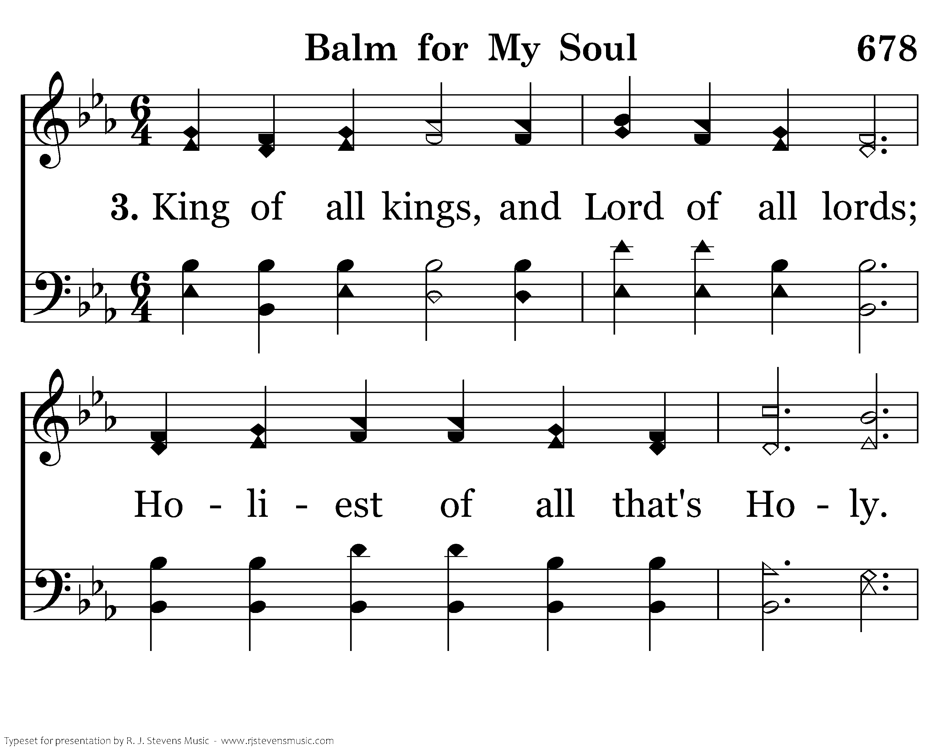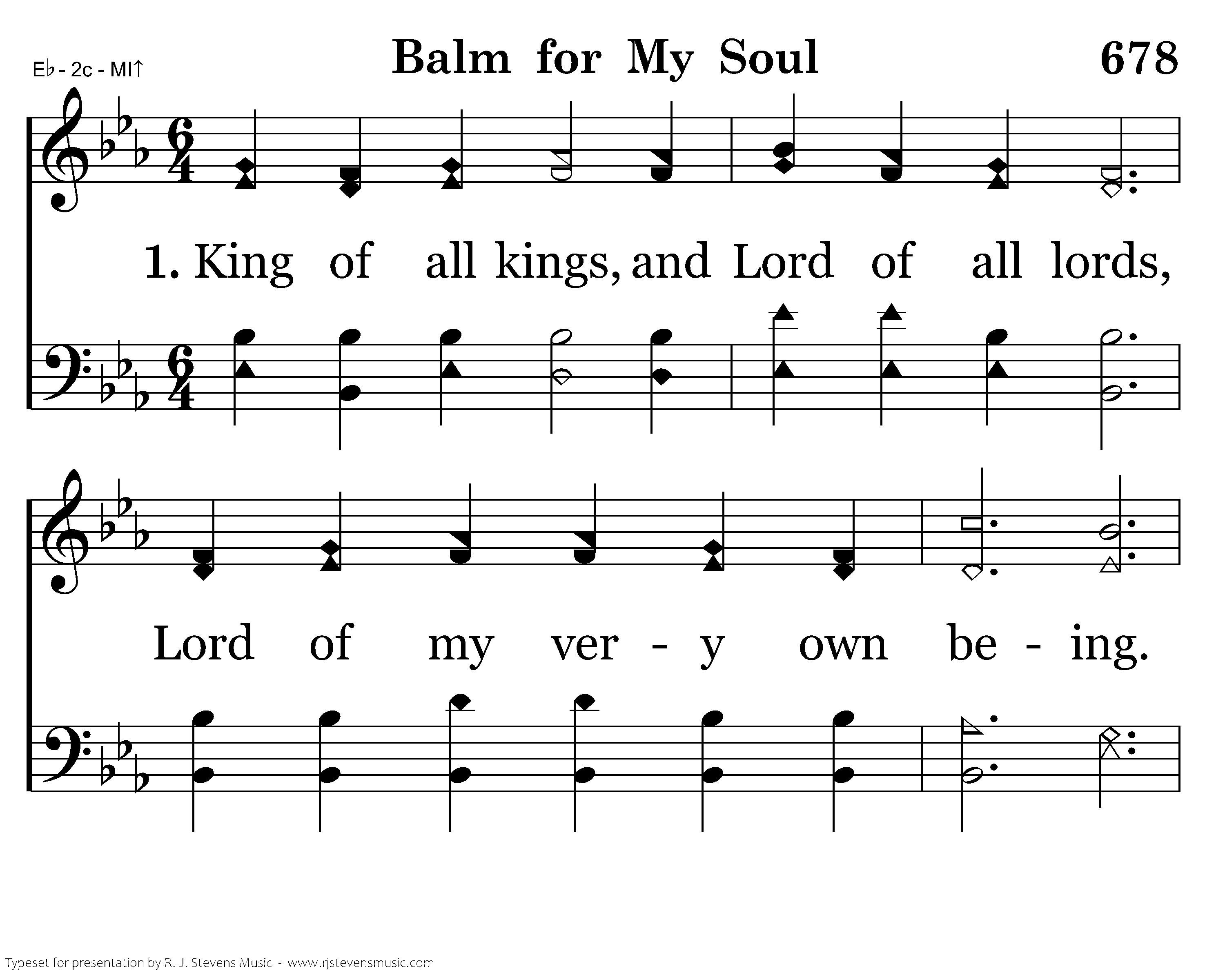 King of all kings, and Lord of all lords, Lord of my very own being. Knowing my heart and knowing my soul, With all of His graces revealing. He giveth me all that I'm needing; Letting me see when darkness invades me. Drying my tears, And balm for my spirit, Balm for my soul and ever will be.
