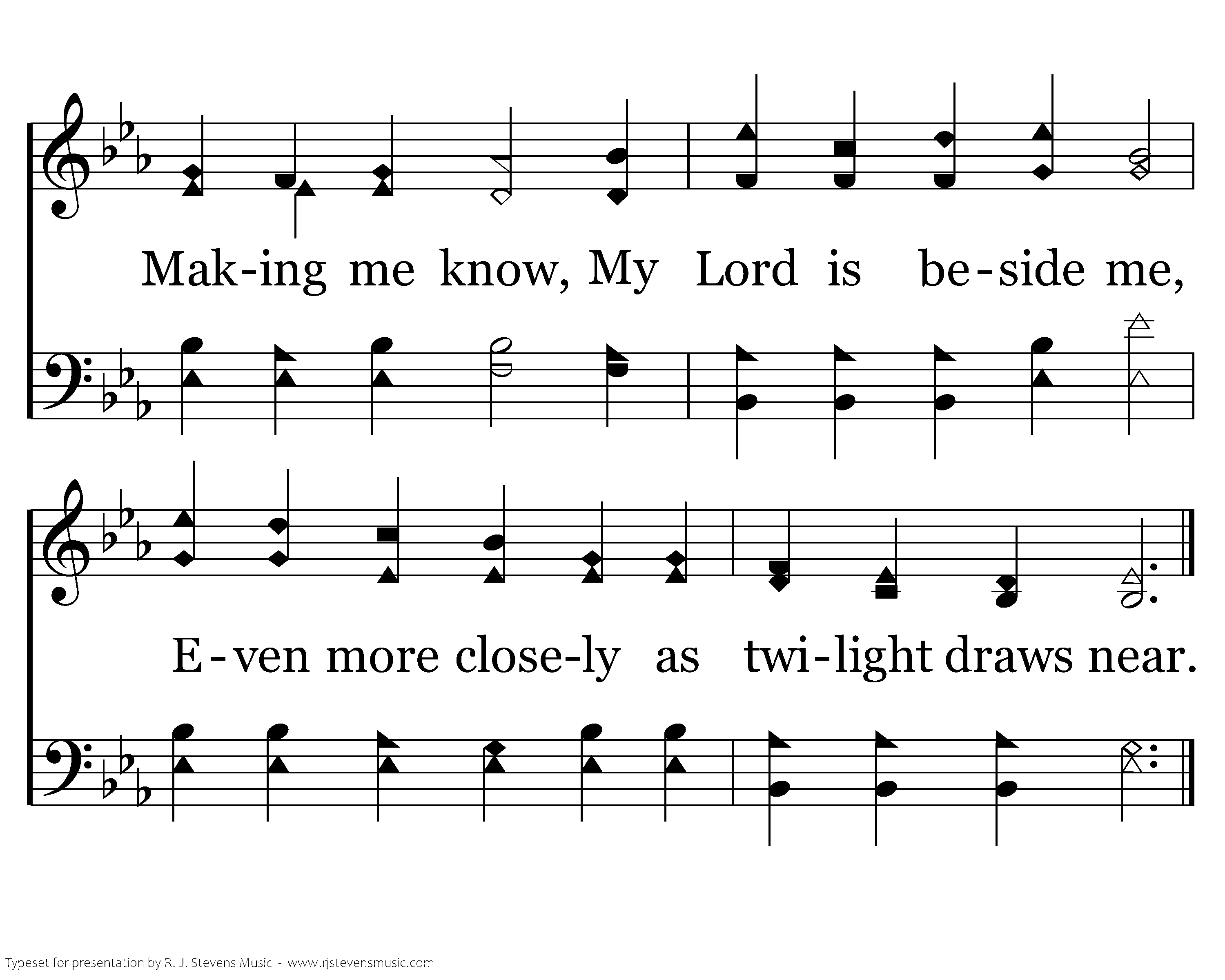 King of all kings, how great is His name; Greatest that ever was spoken. Greater than all that ever was known, Enough to mend all that I've broken. The angels are singing His praises, Voices of gladness tell of His greatness; Making me know, My Lord is beside me, Even more closely as twilight draws near.