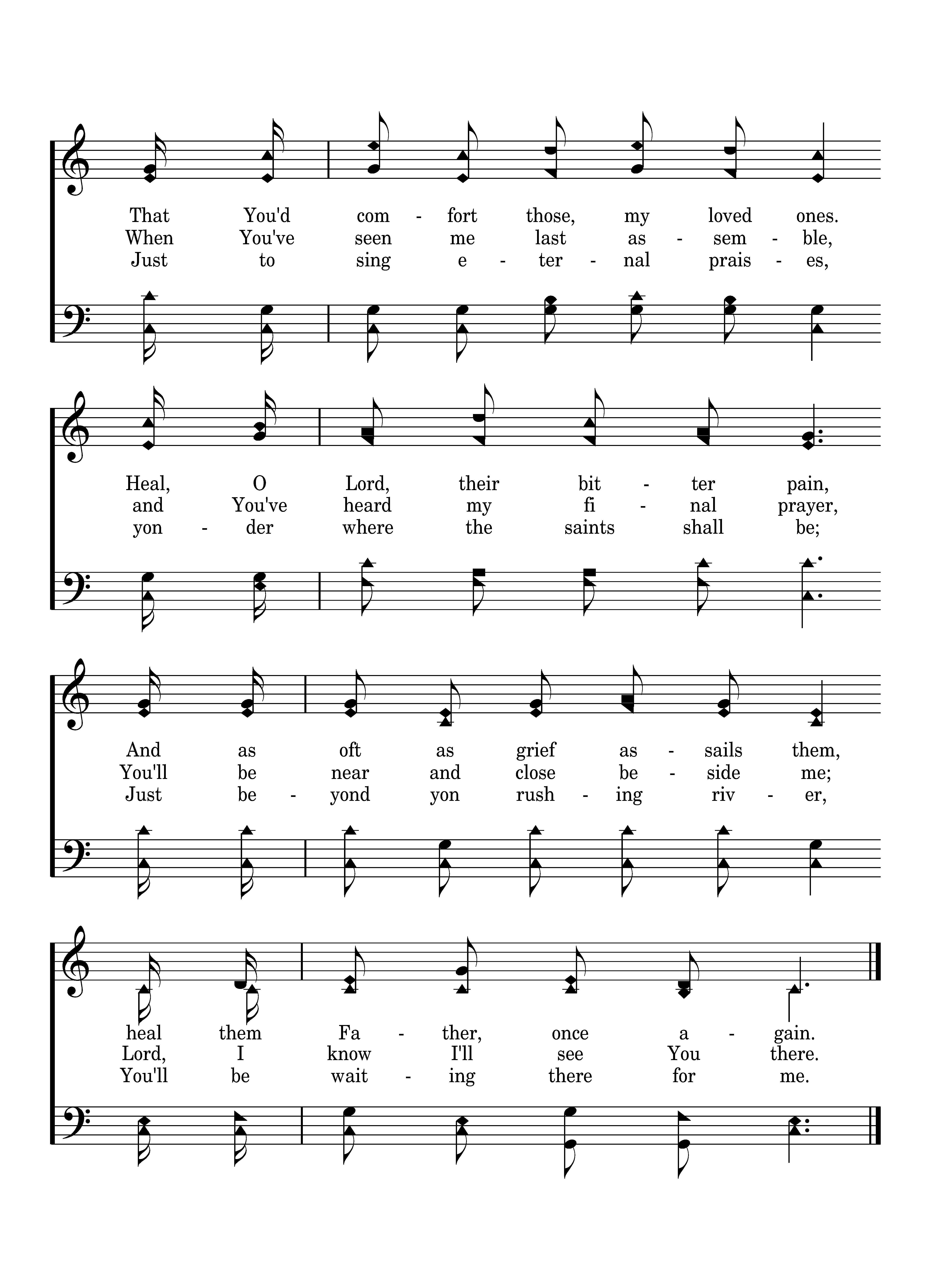 When You've heard my last petition and You've dried my final tear, Pray,m y soul, You'll bear o'er yonder, hold my weary spirit dear. That you'd comfort those, my loved ones. Heal, O Lord, their bitter pain, And as oft as grief assails them, heal them Father, once again.