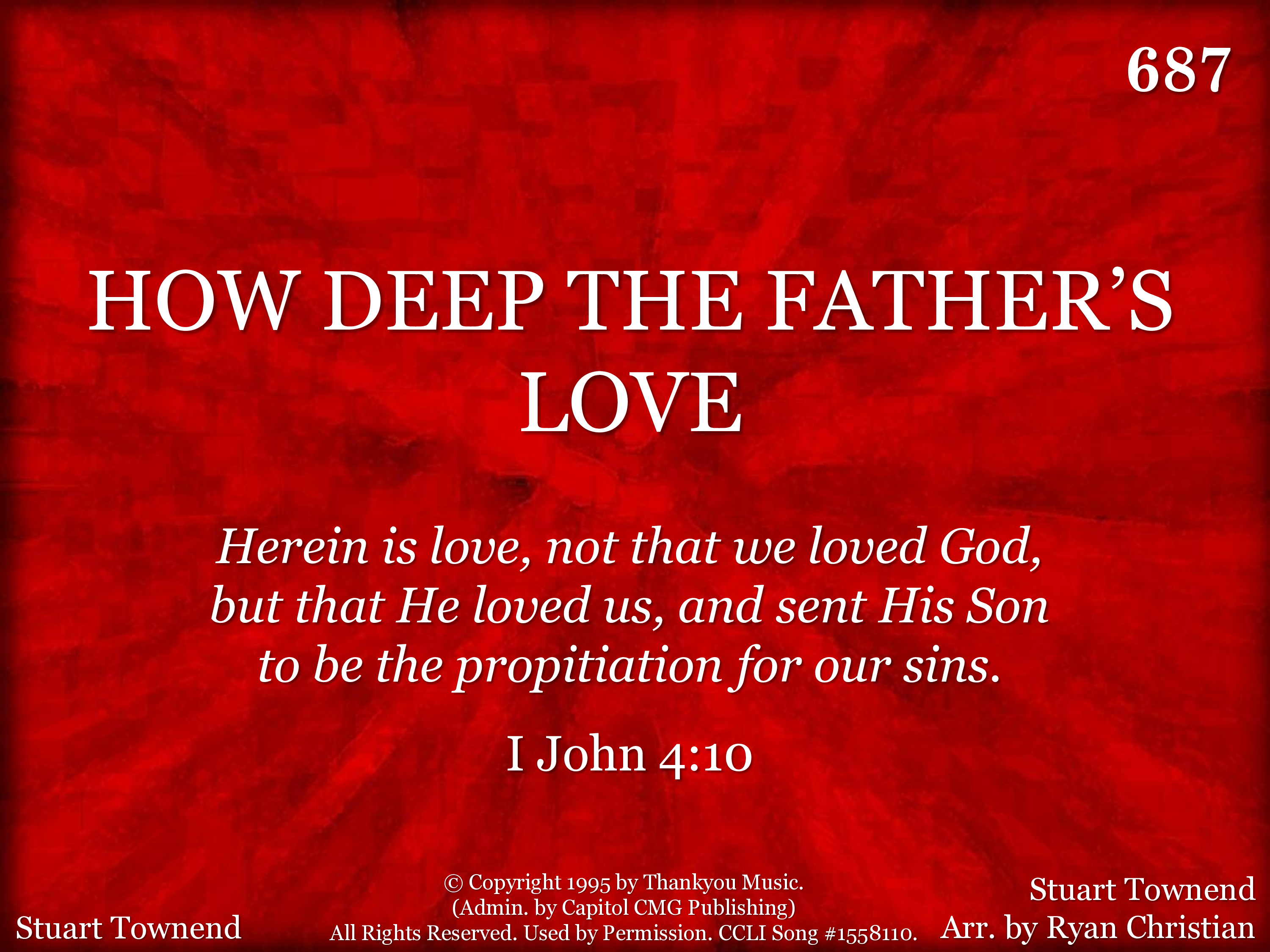How deep the Father's love for us! How vast beyond all measure! That He should give His only Son to make a wretch His treasure! How great the pain of searing loss! The Father turns His face away As wounds which are the Chosen One bring many sons to glory.