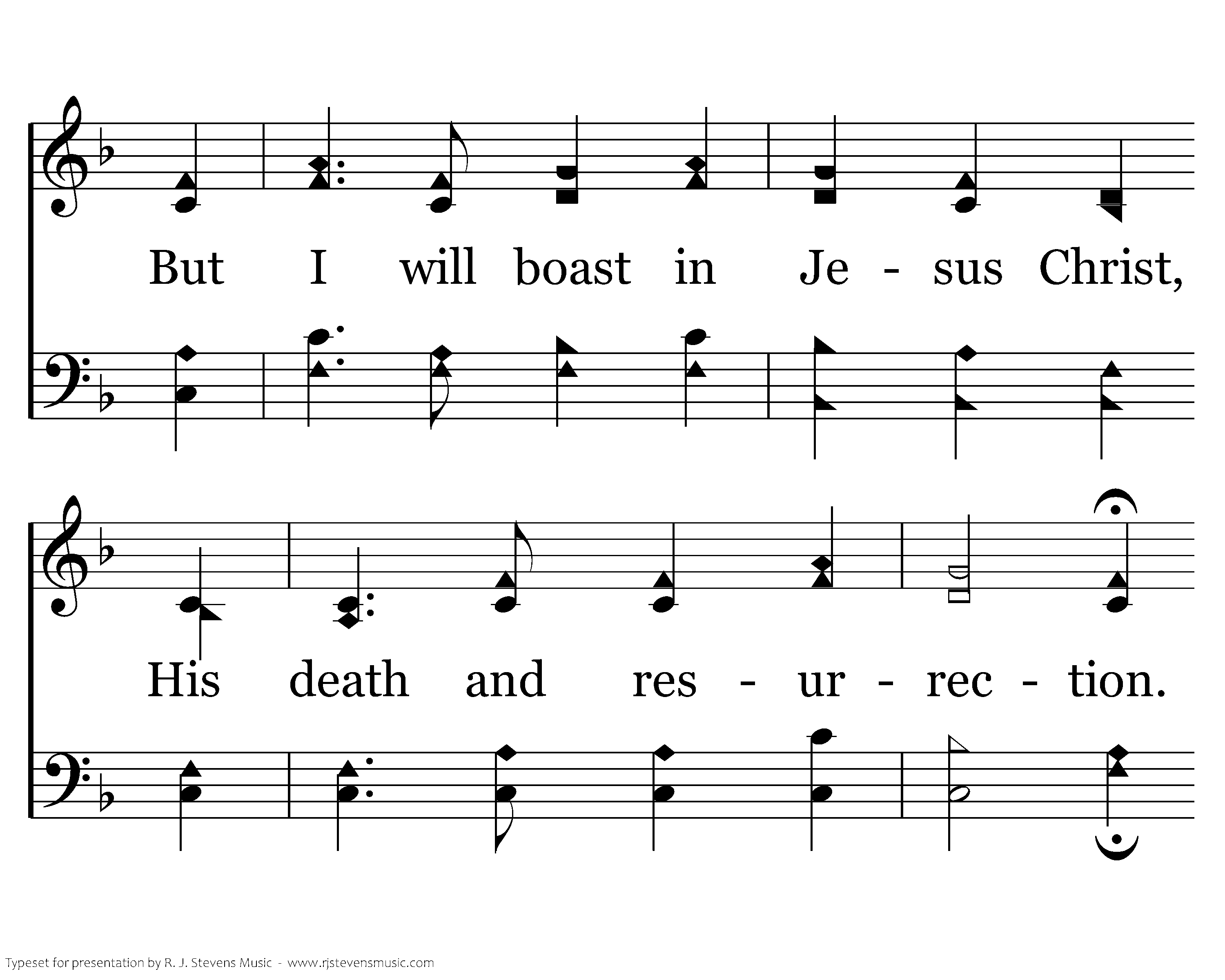 I will not boast in anything: No gifts, no pow'r, no wisdom; But I will boast in Jesus Christ, His death and resurrection. Why should I gain from His reward? I cannot give an answer. But this I know with all my heart His wounds have paid my ransom.