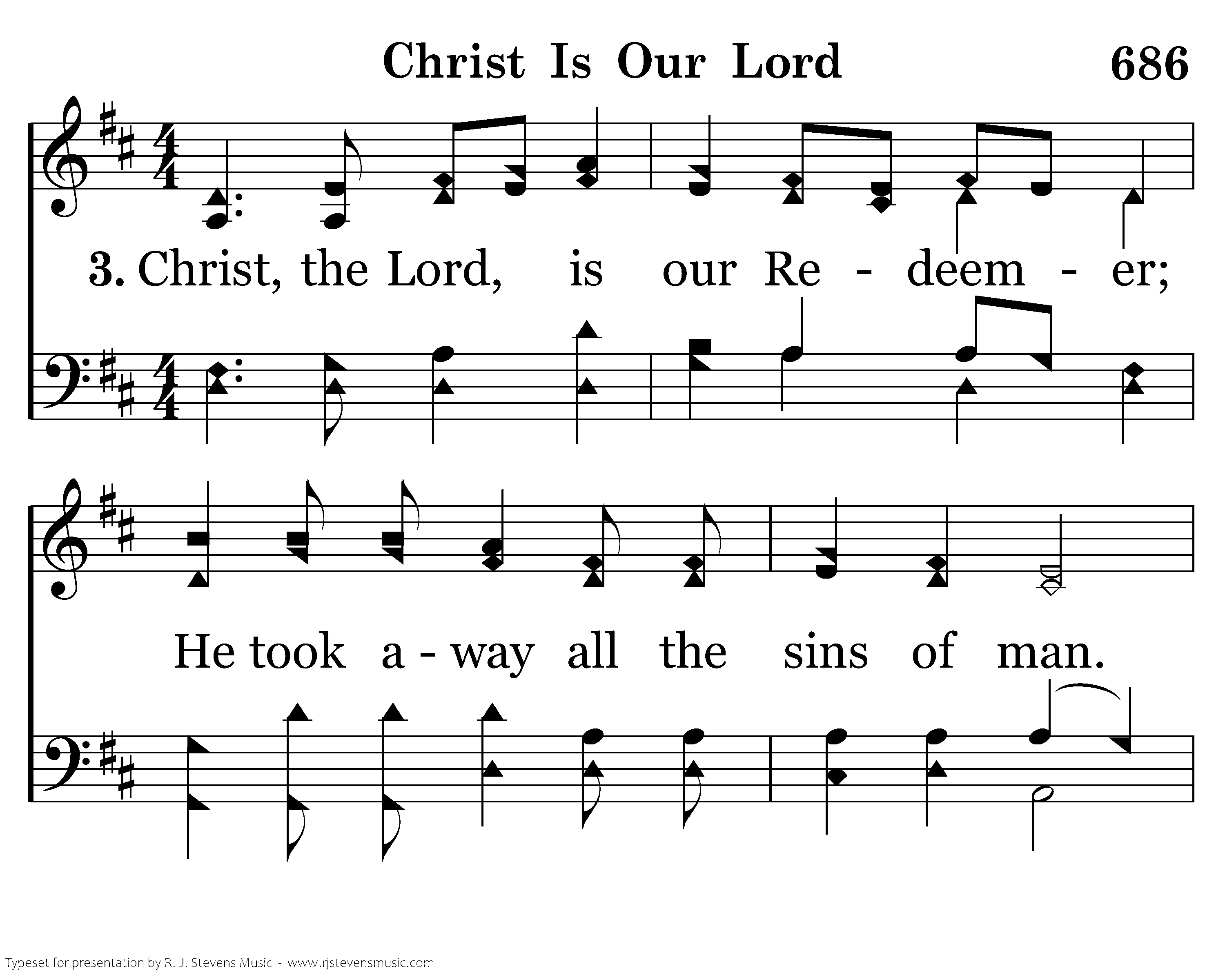 Christ, the Lord is our Redemer, He took away all the sins of man. 'Tween two theives Jesus died on Calv'ry; Rose from the grave to live again.