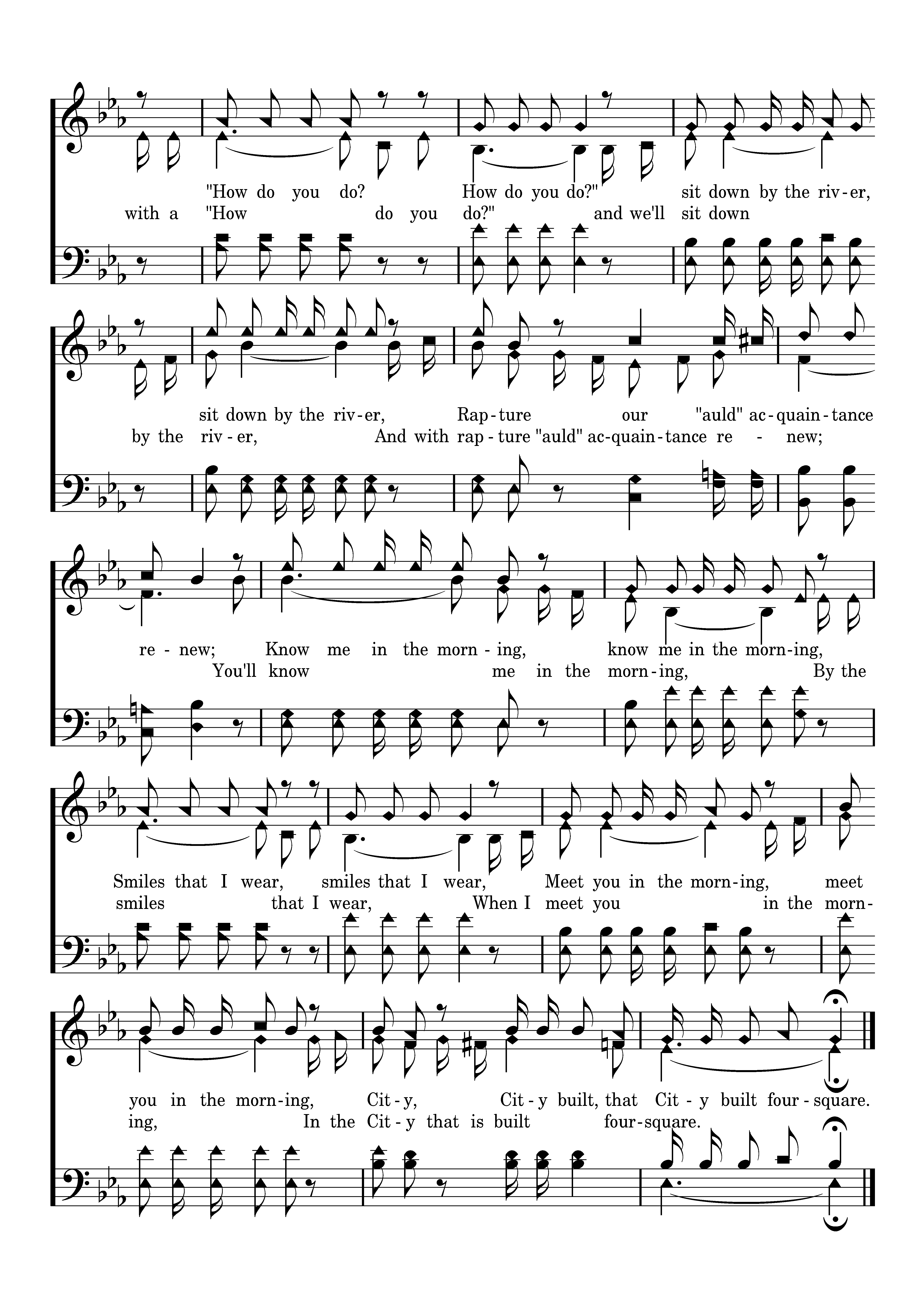I'll meet you in the morning, with a "How do you do?" and we'll sit down by the river, And with rapture "auld" acquaintance renew; You'll know me in the morning, By the smiles that I wear, When I meet you in the morning, In the City that is built foursquare.