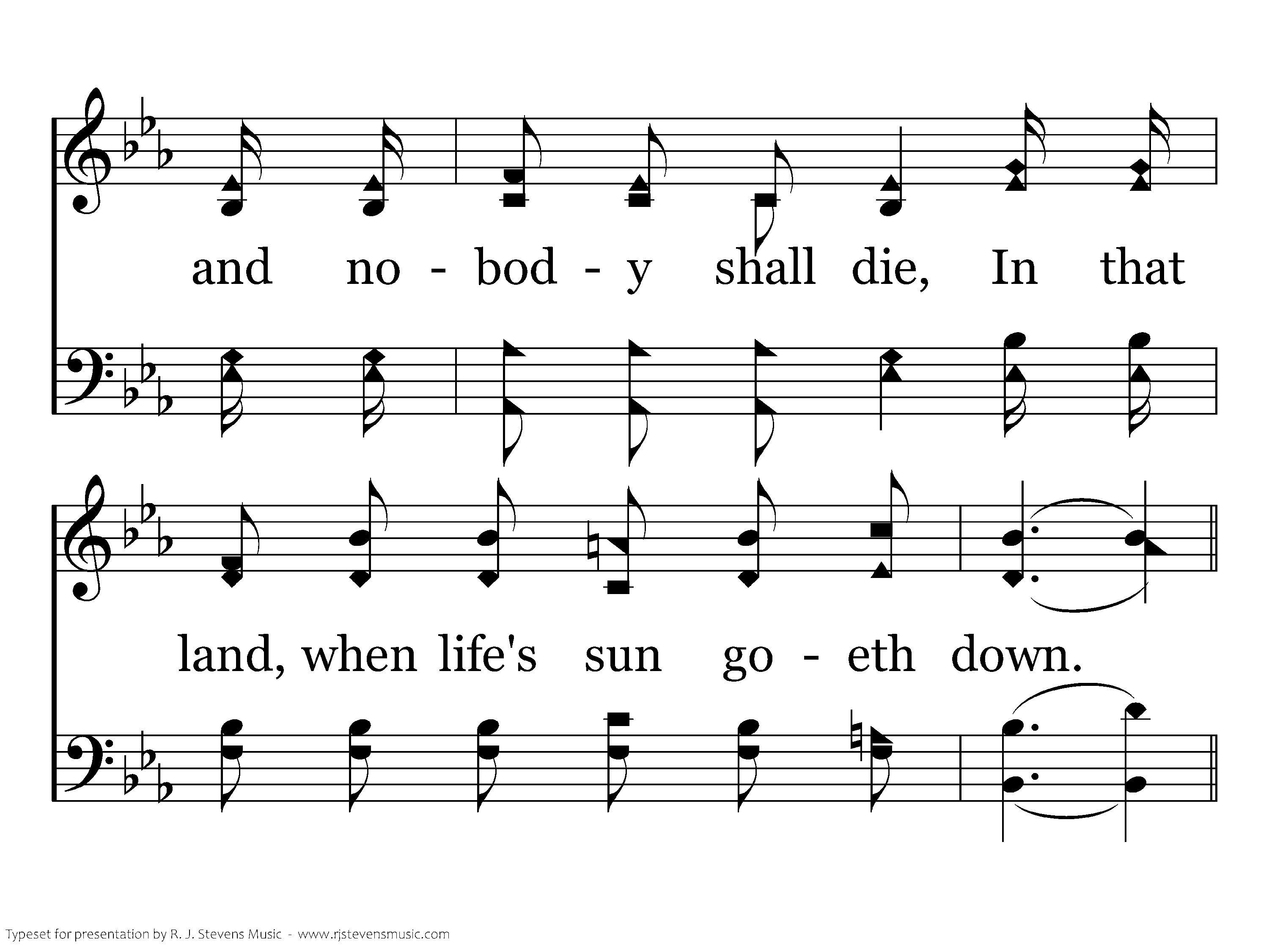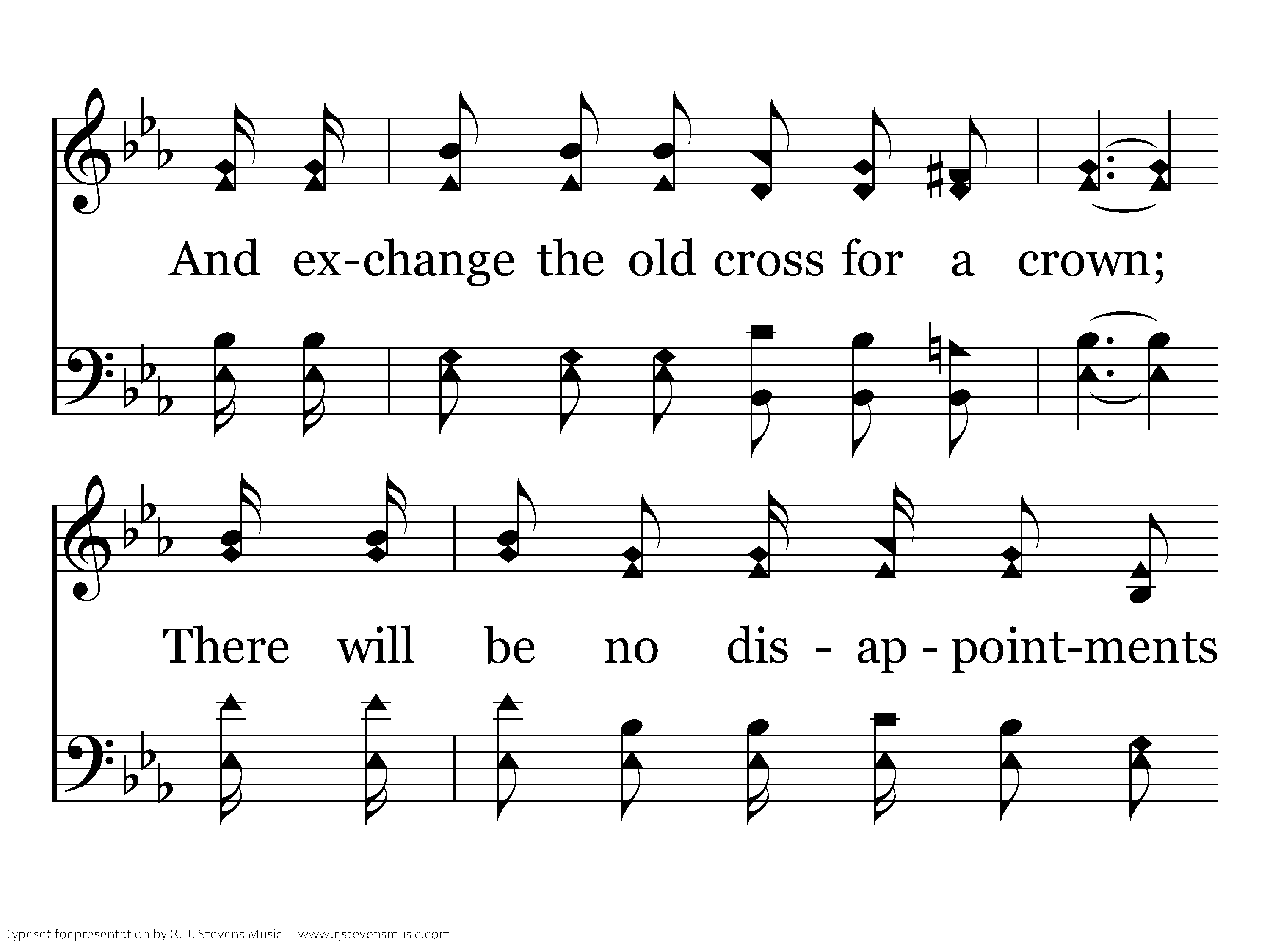 I will meet you in the morning, in the sweet by and by, And exchange the old cross for a crown; There will be no disappointments and nobody shall die, In that land, when life's sun goeth down.