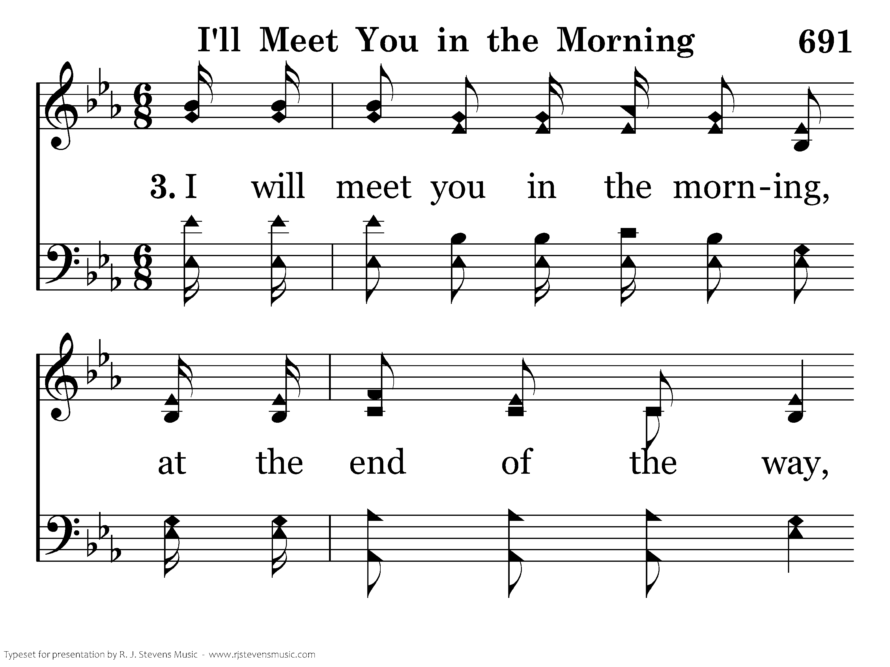 I will meet you in the morning, by the bright river side, When all sorrow has drifted away; I'll be standing at the portals, when the gates open wide, At the close of life's long, dreary day.