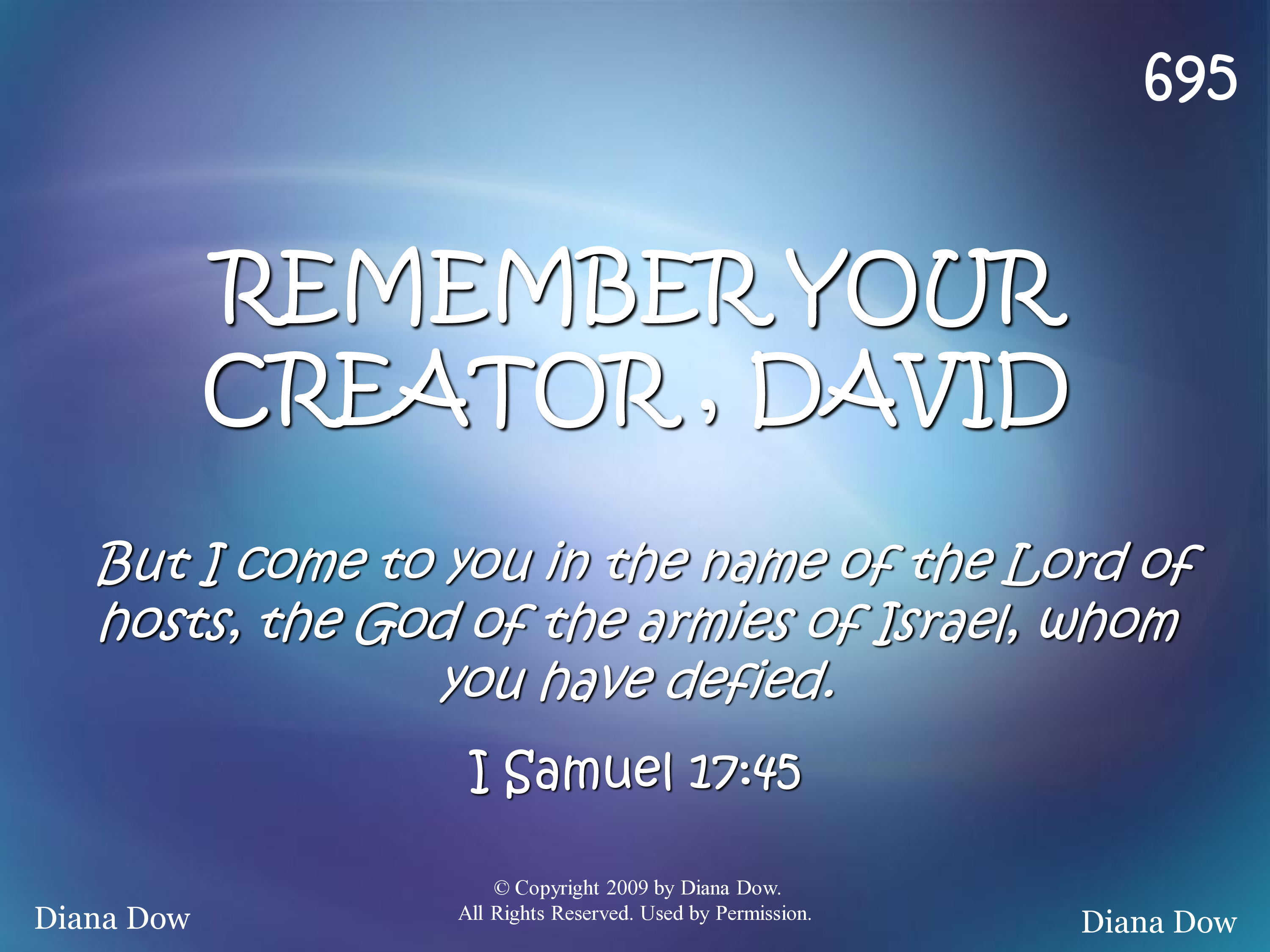 David remembered his Creator in the days of his youth. David remembered his Creator in the days of his youth. He did not fear the giant big and tall but trusted God would make him fall, and God made him the great king over Israel.