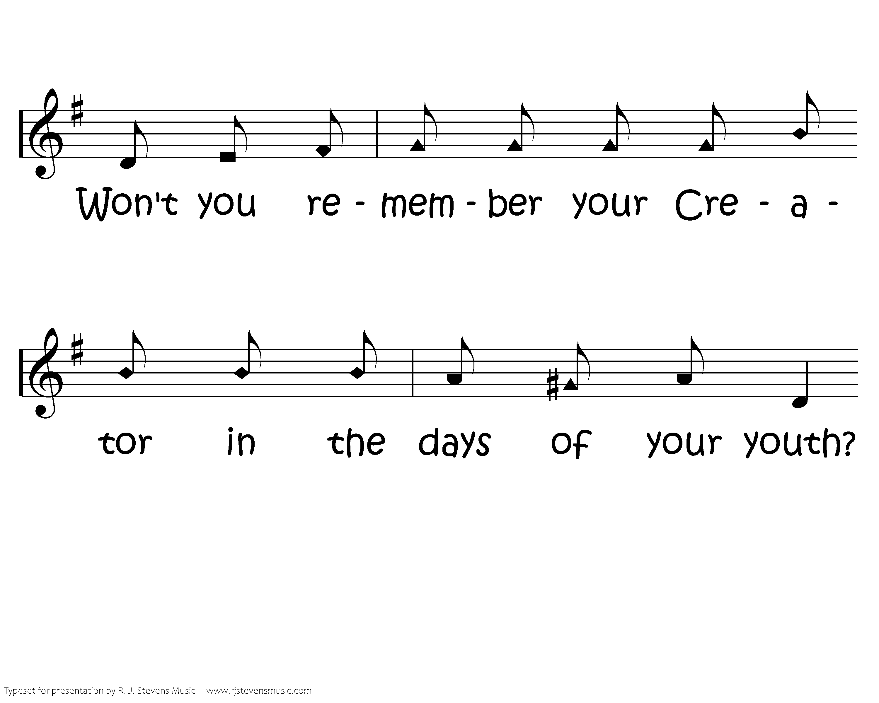 Won't you remember your Creator in the days of your youth? Won't you remember your Creator in the days of your youth? If you remember Him before you're grown, He'll bless you more than you can know. Remember your Creator in the days of your youth.