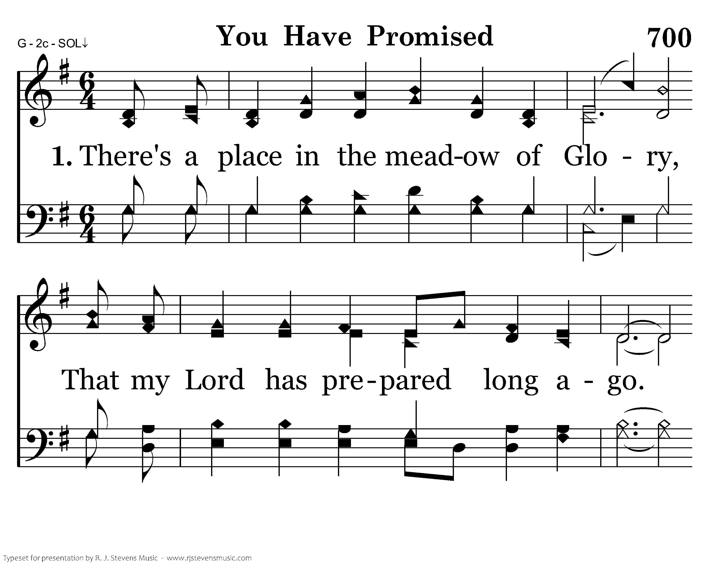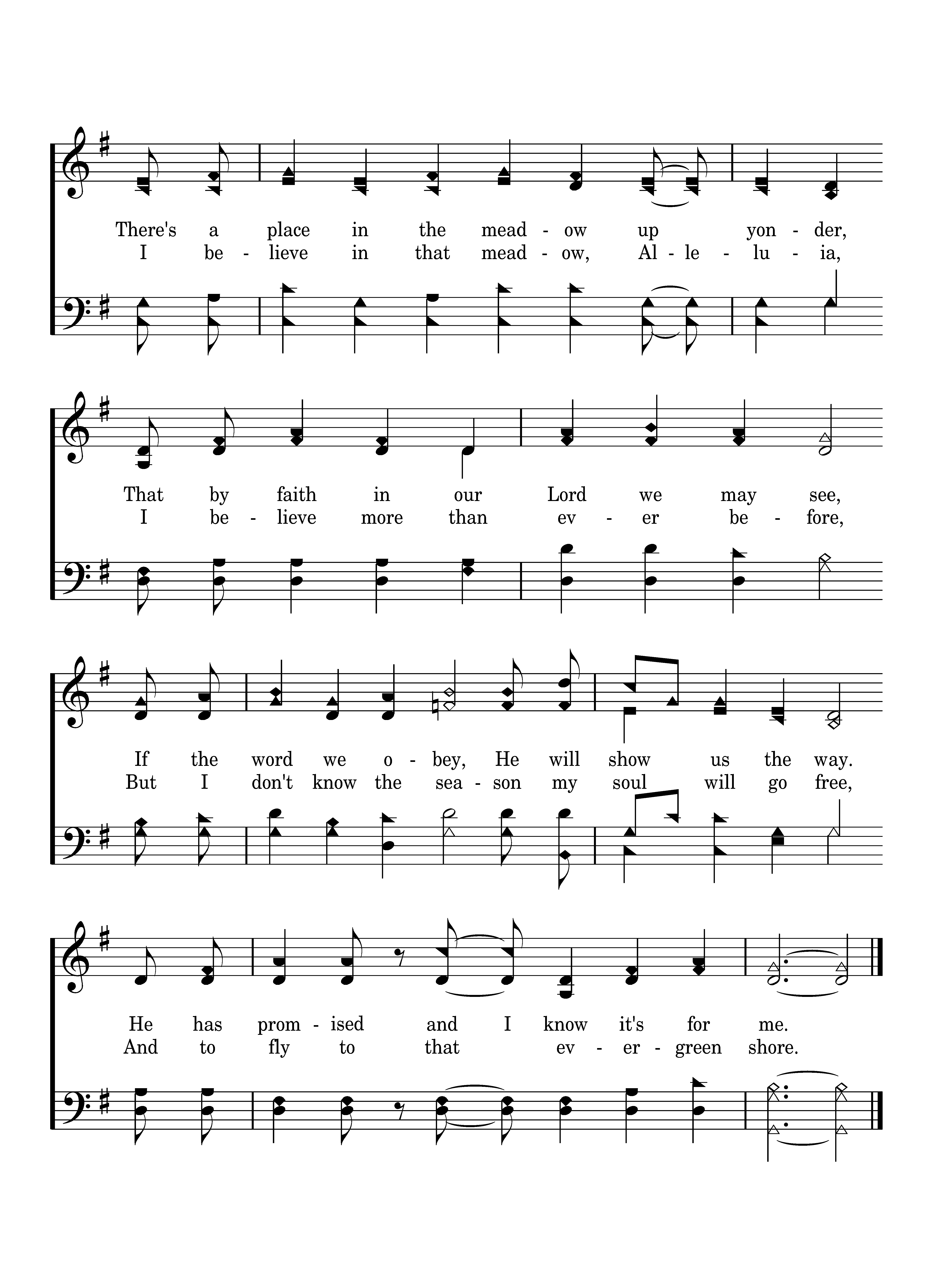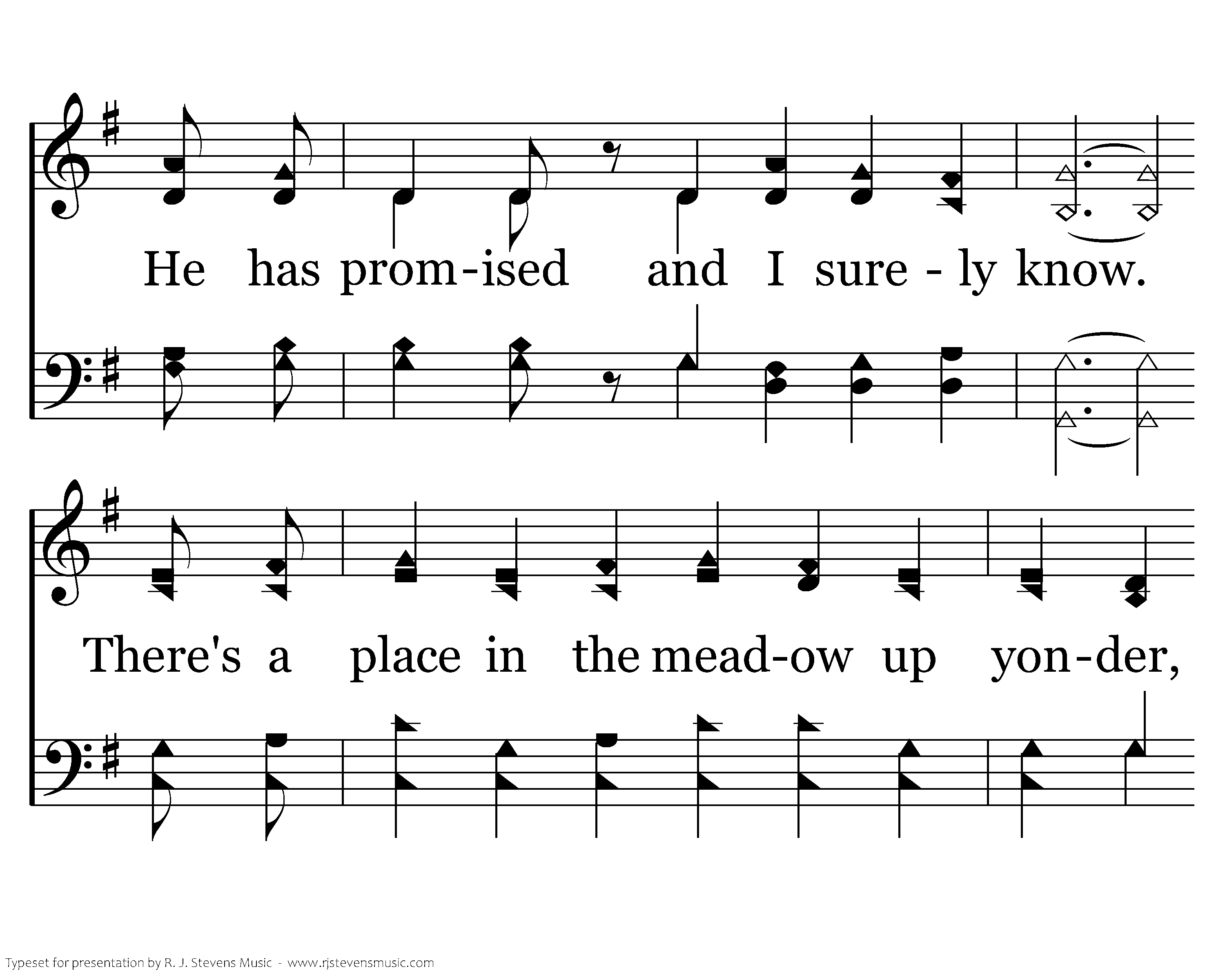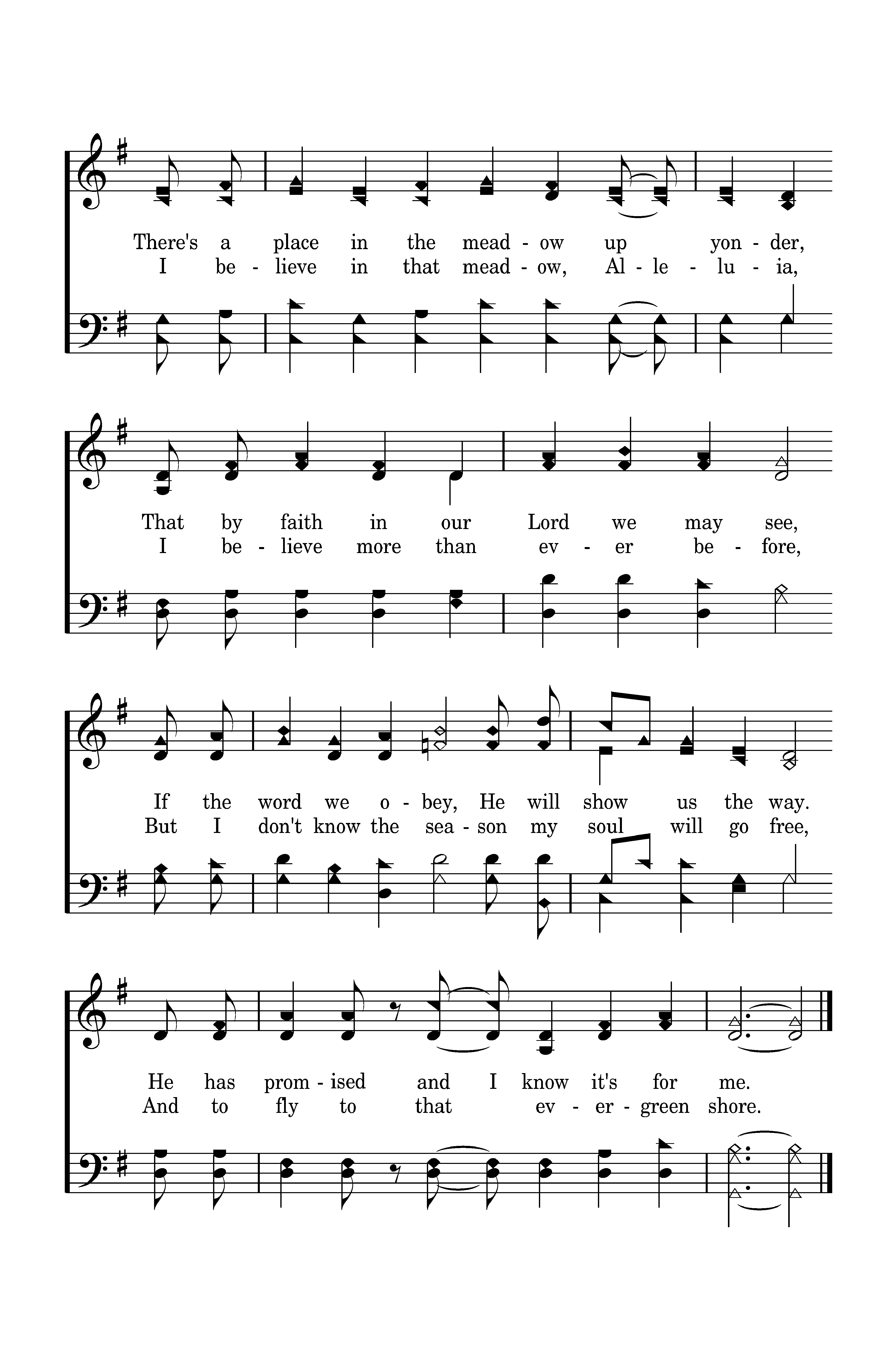 There's a place in the meadow of Glory, that my Lord has prepared long ago. He has said there's a shade, Where no sorrows invade. He has promised and I surely know. There's a place in the meadow up yonder, That by faith in our Lord we may see, If the word we obey, He will show us the way. He has promised and I know it's for me.