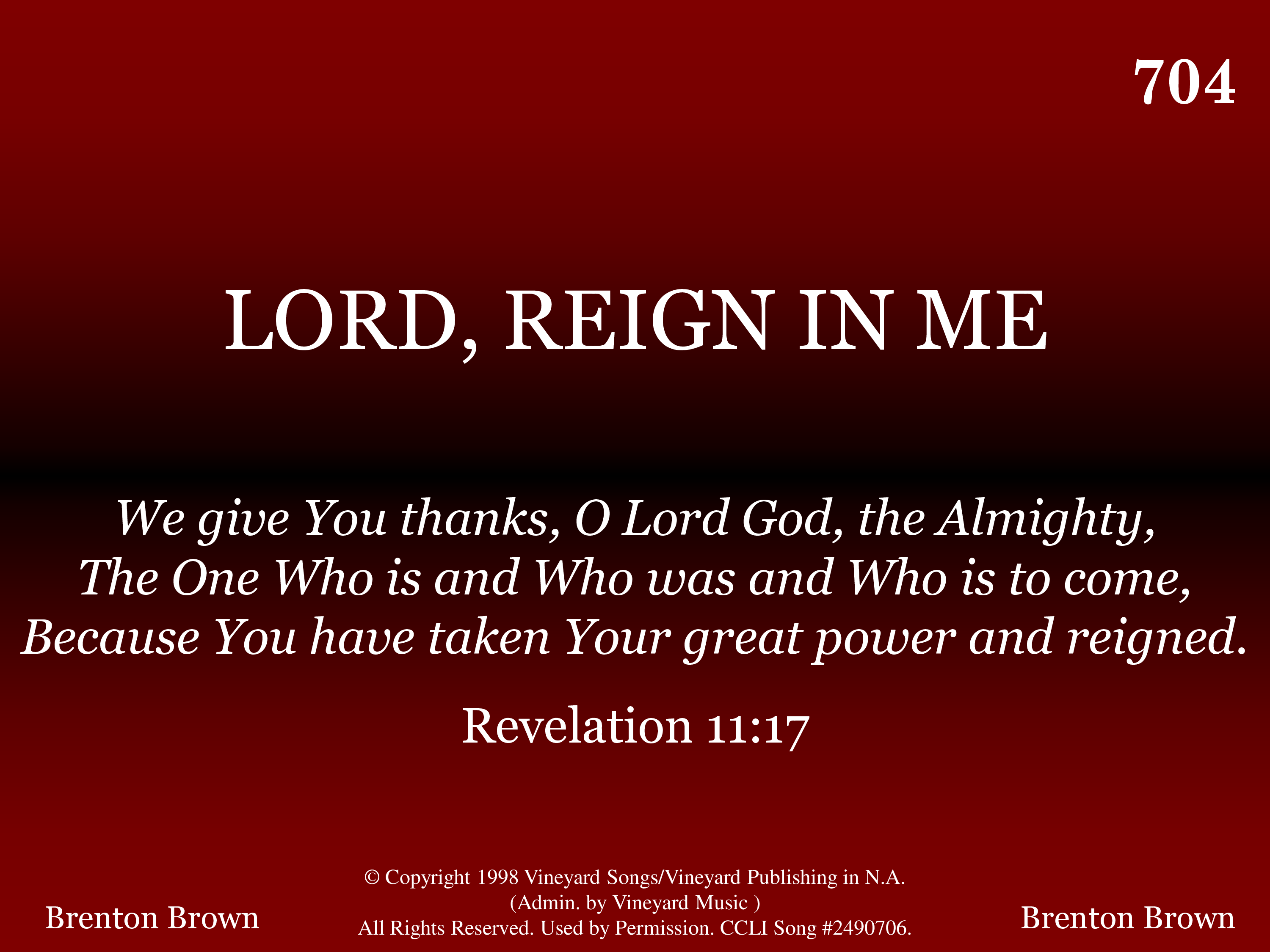 Lord reign in me, Reign in your power, Over all my dreams, In my darkest hour, You are the Lord of all I am, So won't You reign in me again! Won't You reign in me again!