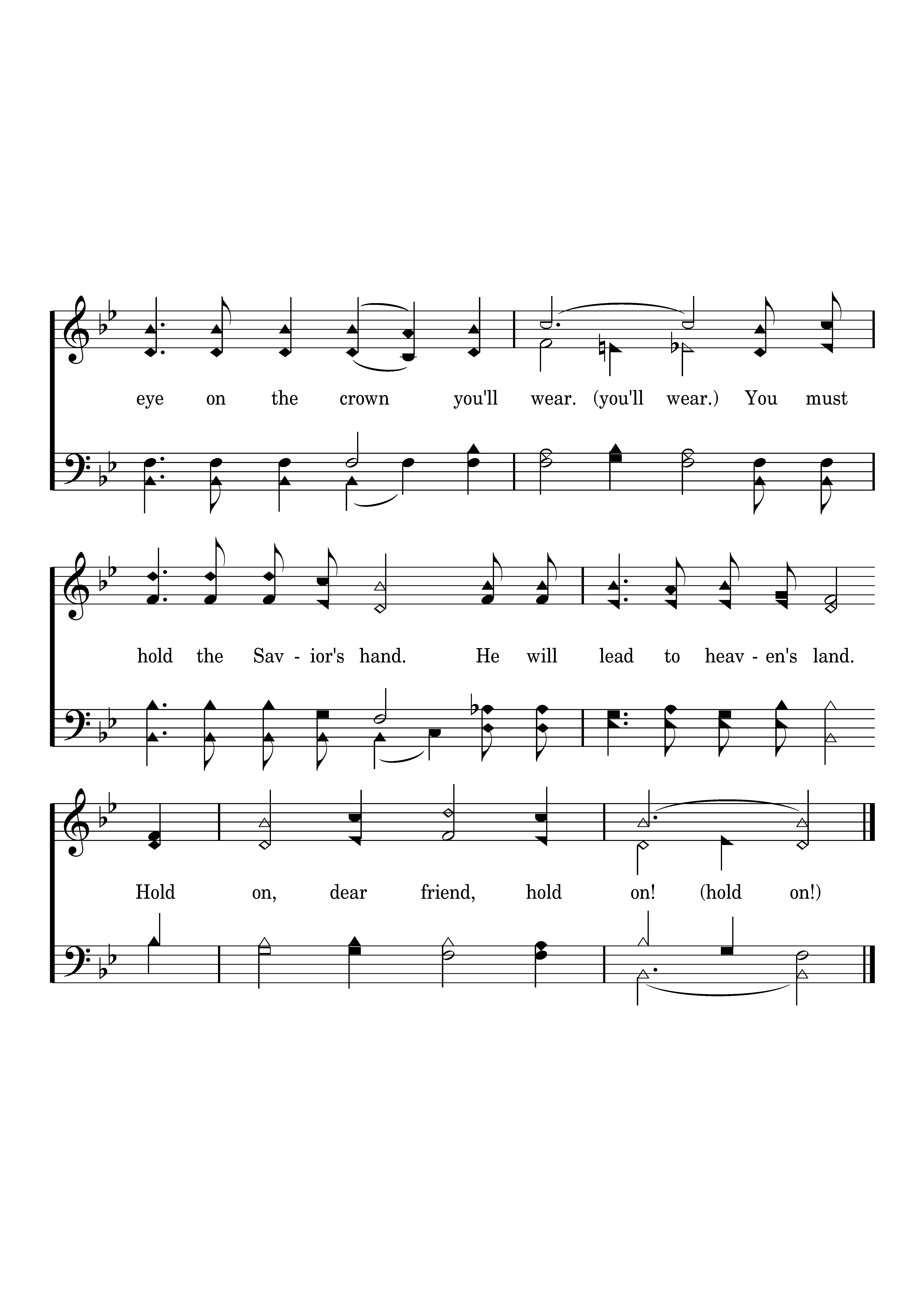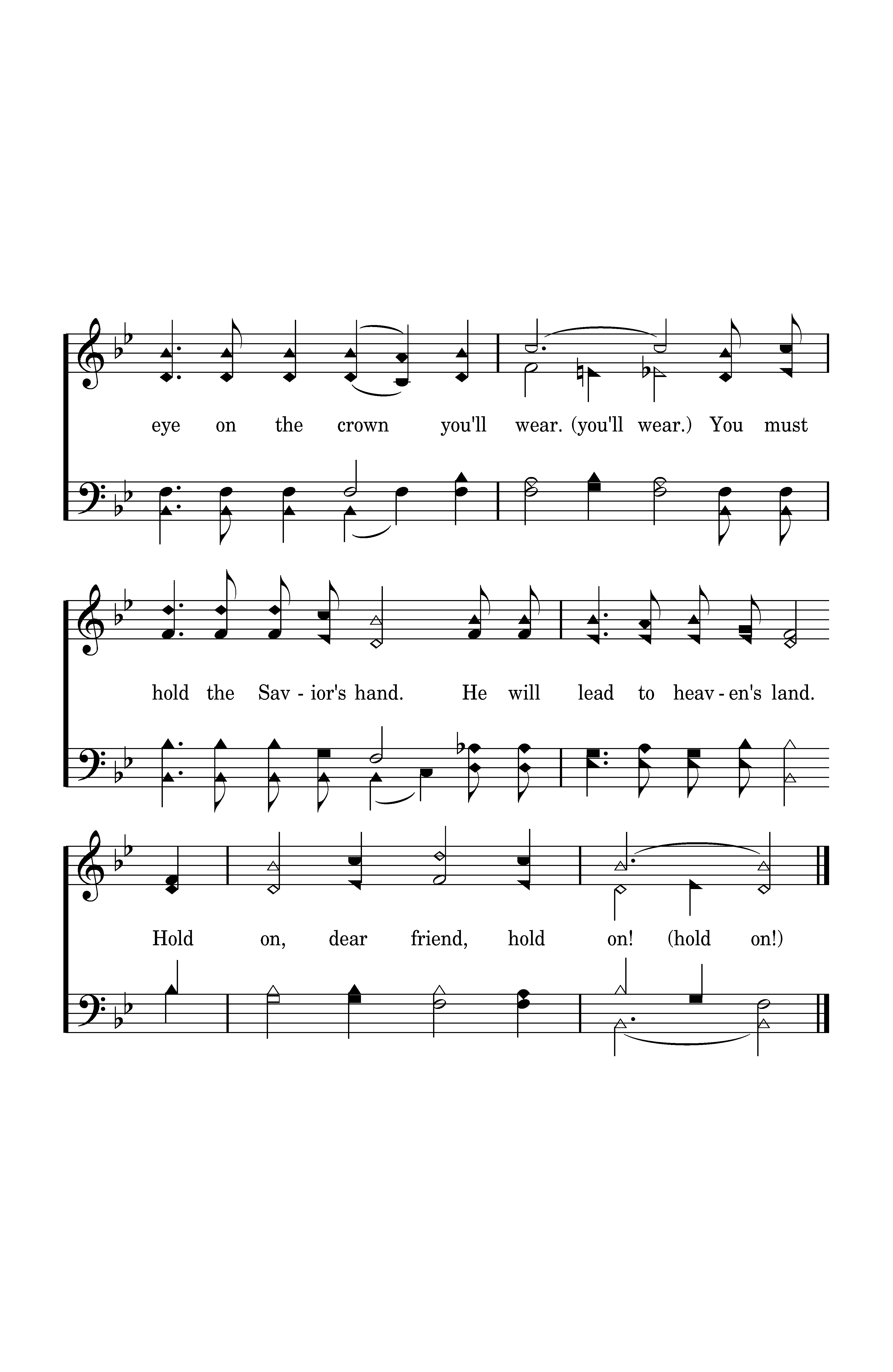 Your burden may be hard to bear; Keep your eye on the crown you'll wear. You must hold the Savior's hand. He will lead to heaven's land. Hold on, dear friend, hold on!