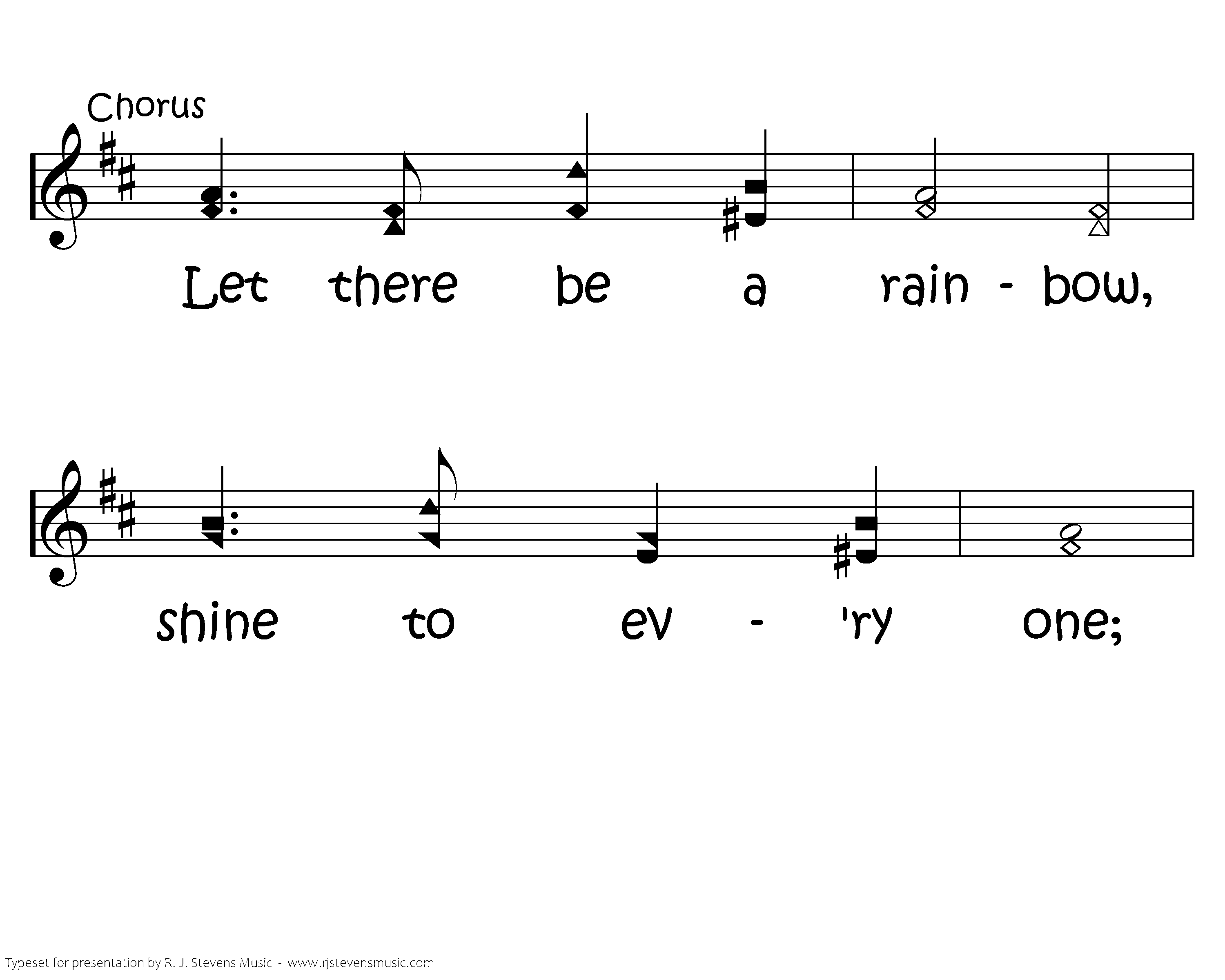Let there be a rainbow in our life today: After storms are over and have passed away; Show the world your colors, let them brightly shine. Showing forth the Savior and his love divine. Let there be a rainbow, shine to ev'ry one; Let our lives show Jesus, till our work is done.
