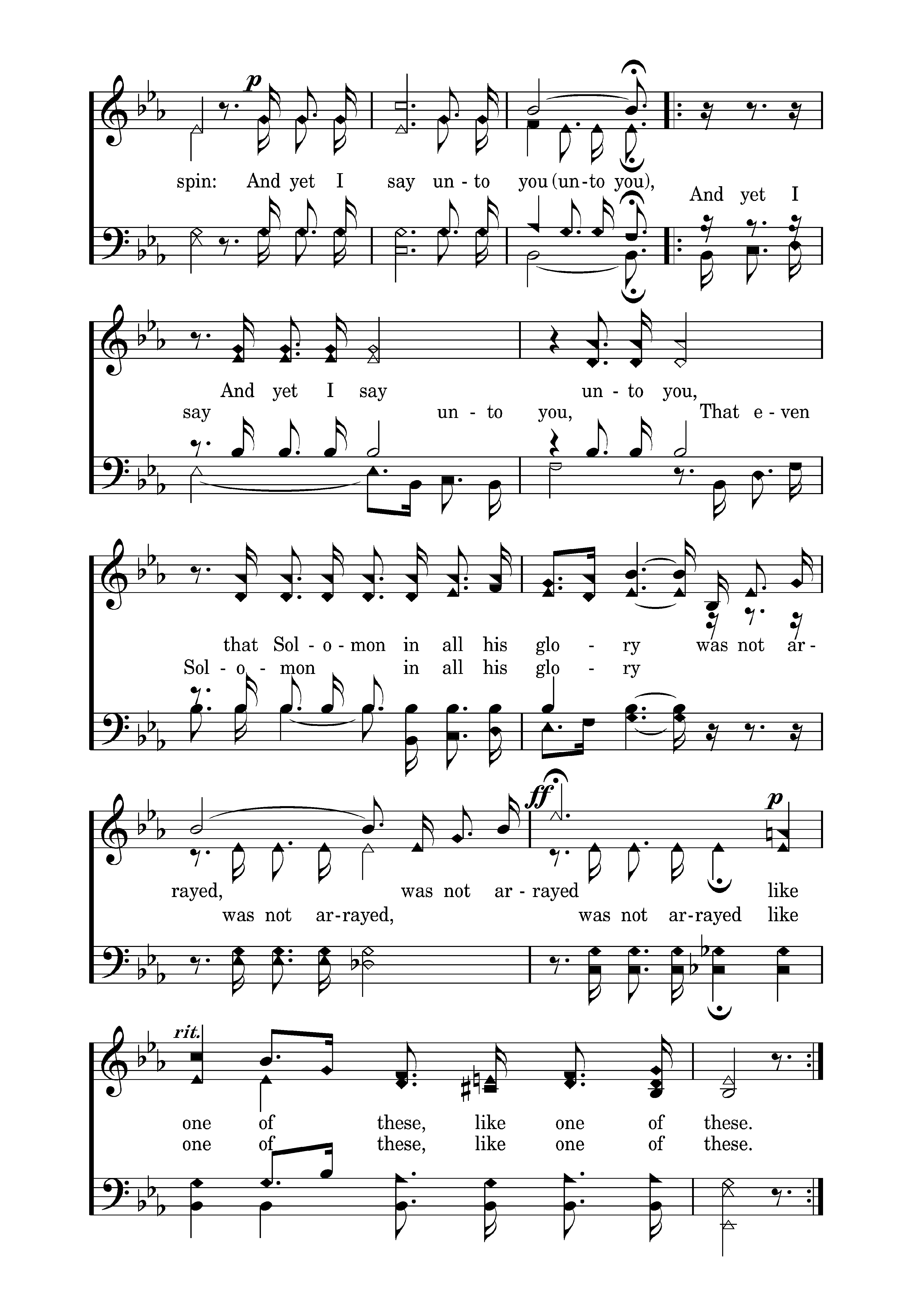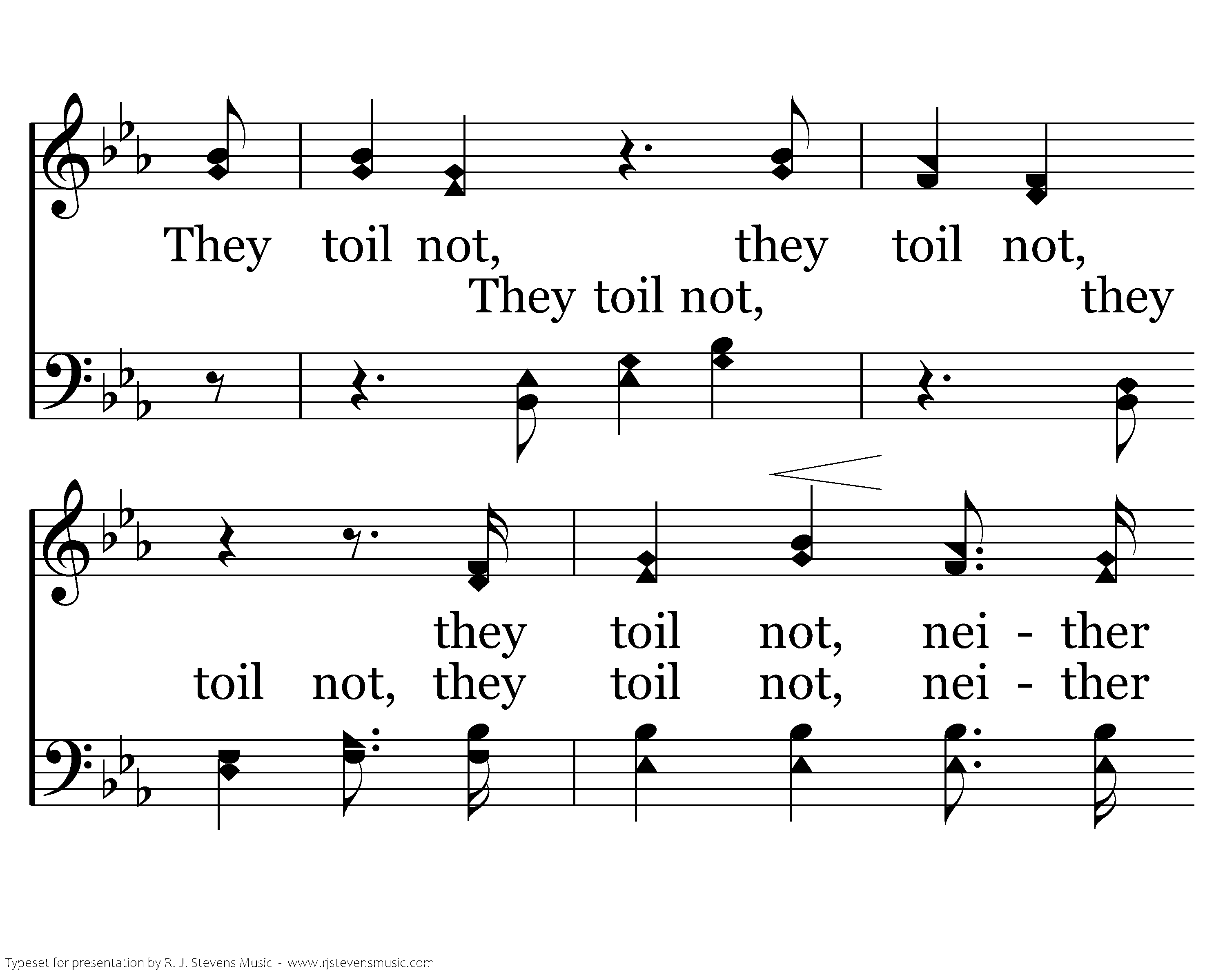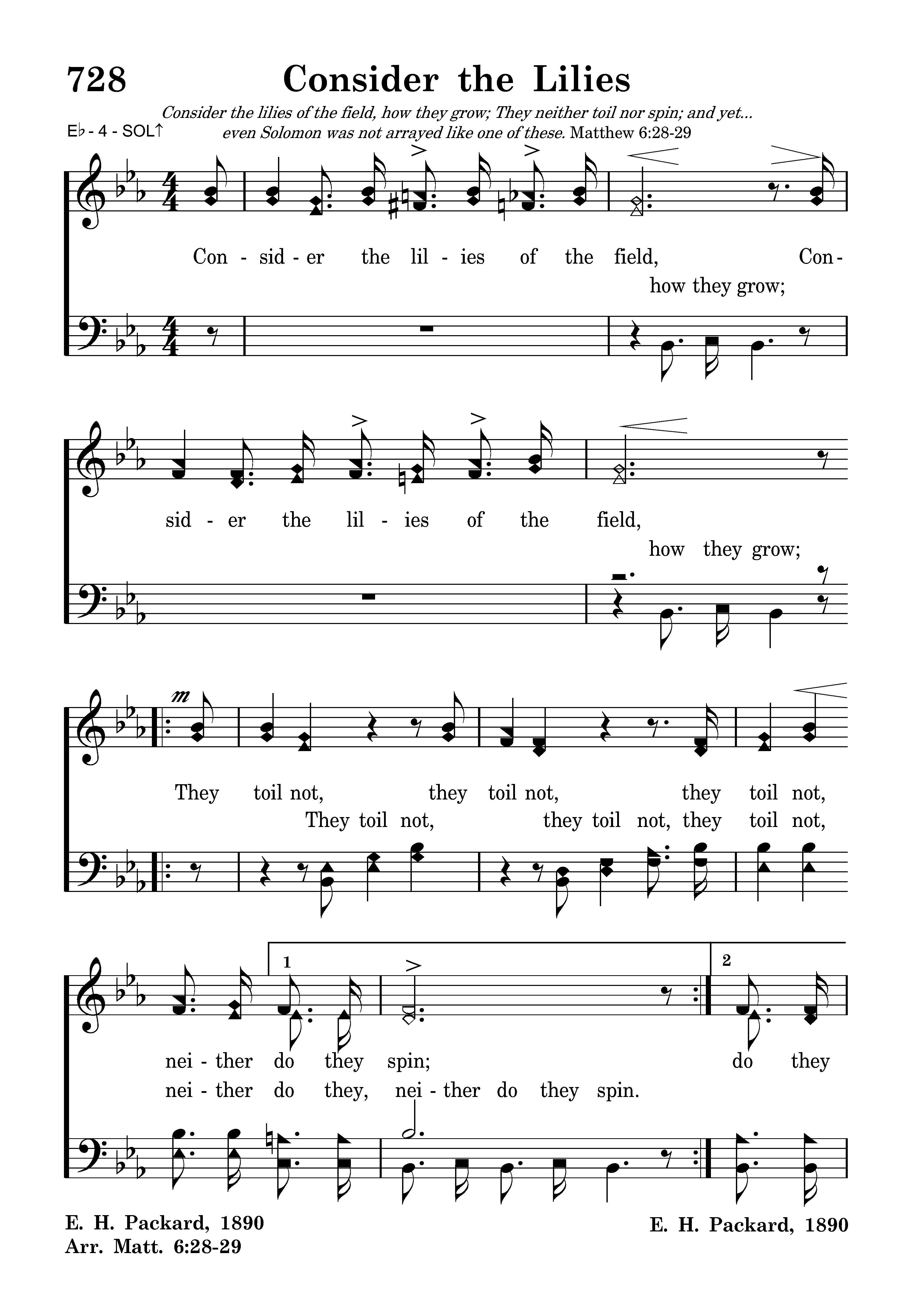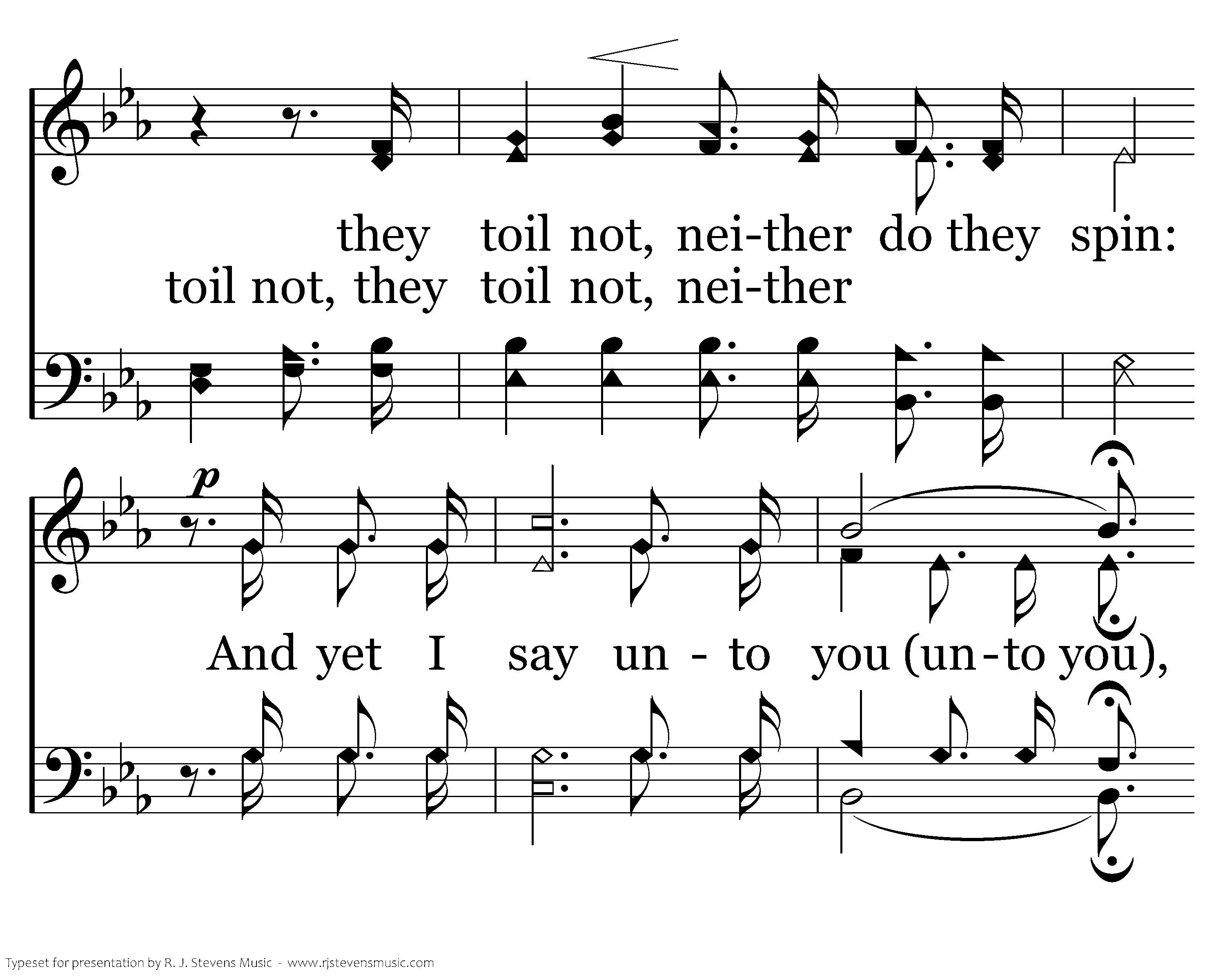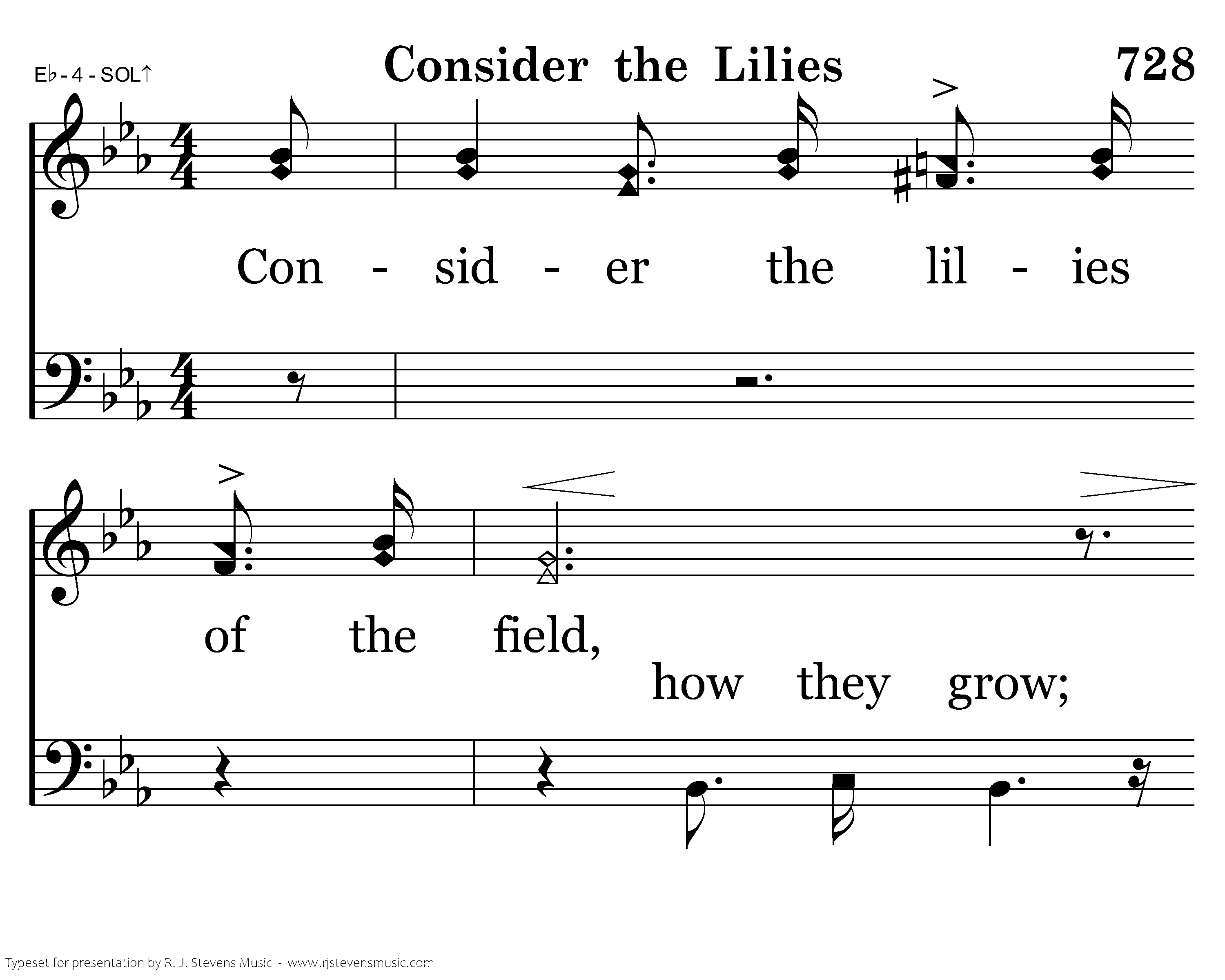 Consider the lilies of the field, how they grow; Consider the lilies of the field, how they grow; They toil not, they toil not, they toil not, neither do they spin; and yet I say unto you. And yet I say And yet I say unto you, unto you, That even Solomon in all his glory was not arrayed, was not arrayed like one of these, like one of these.