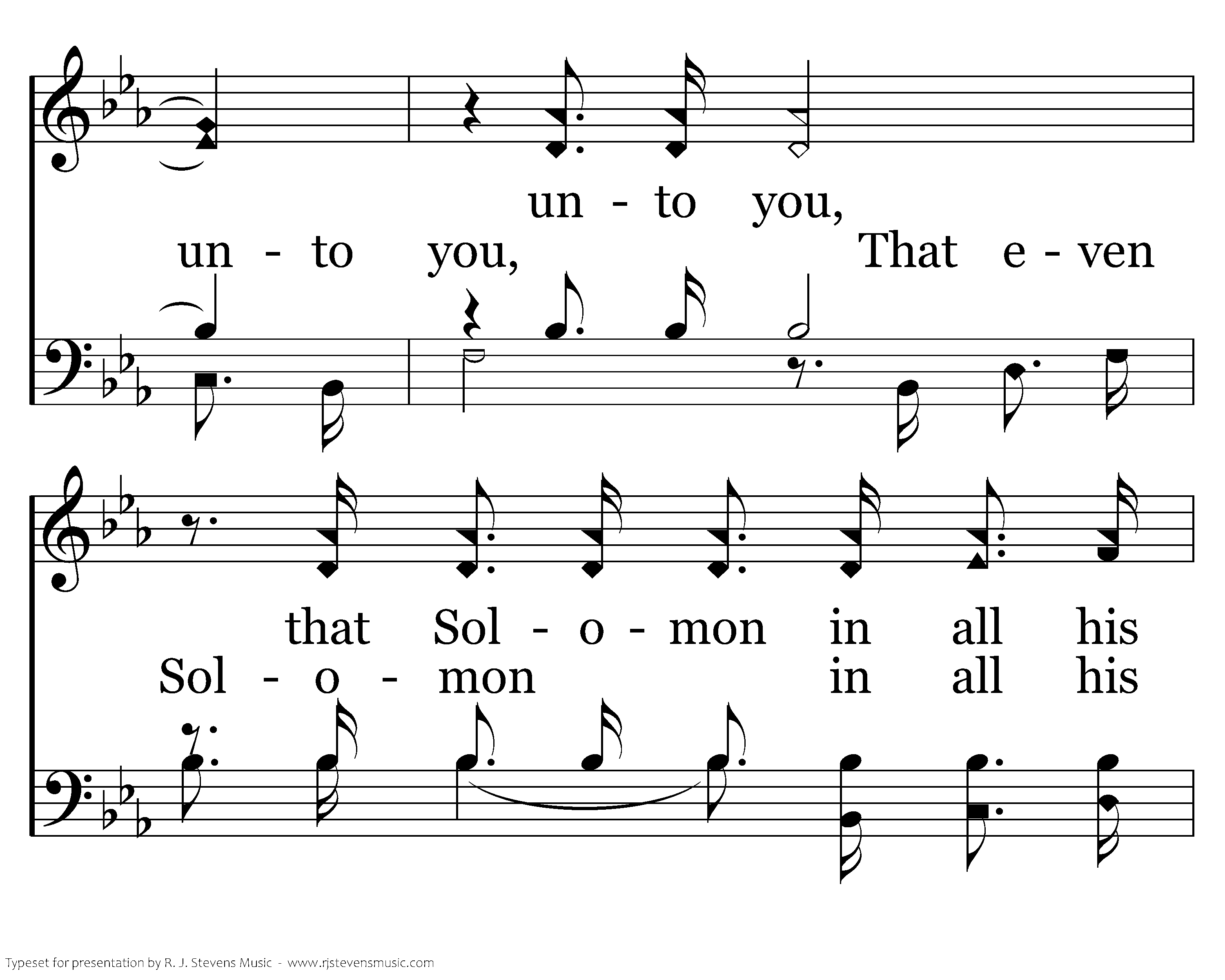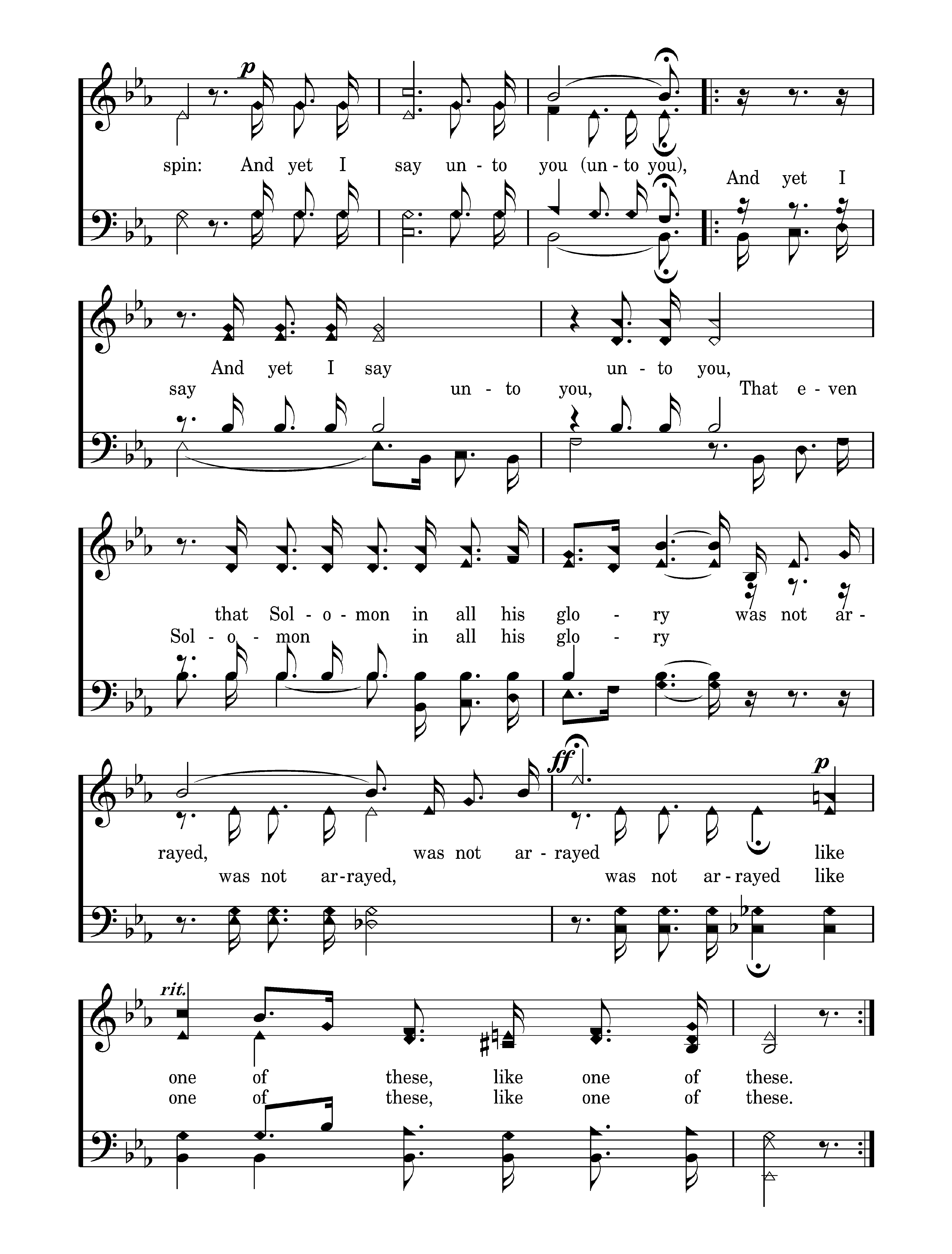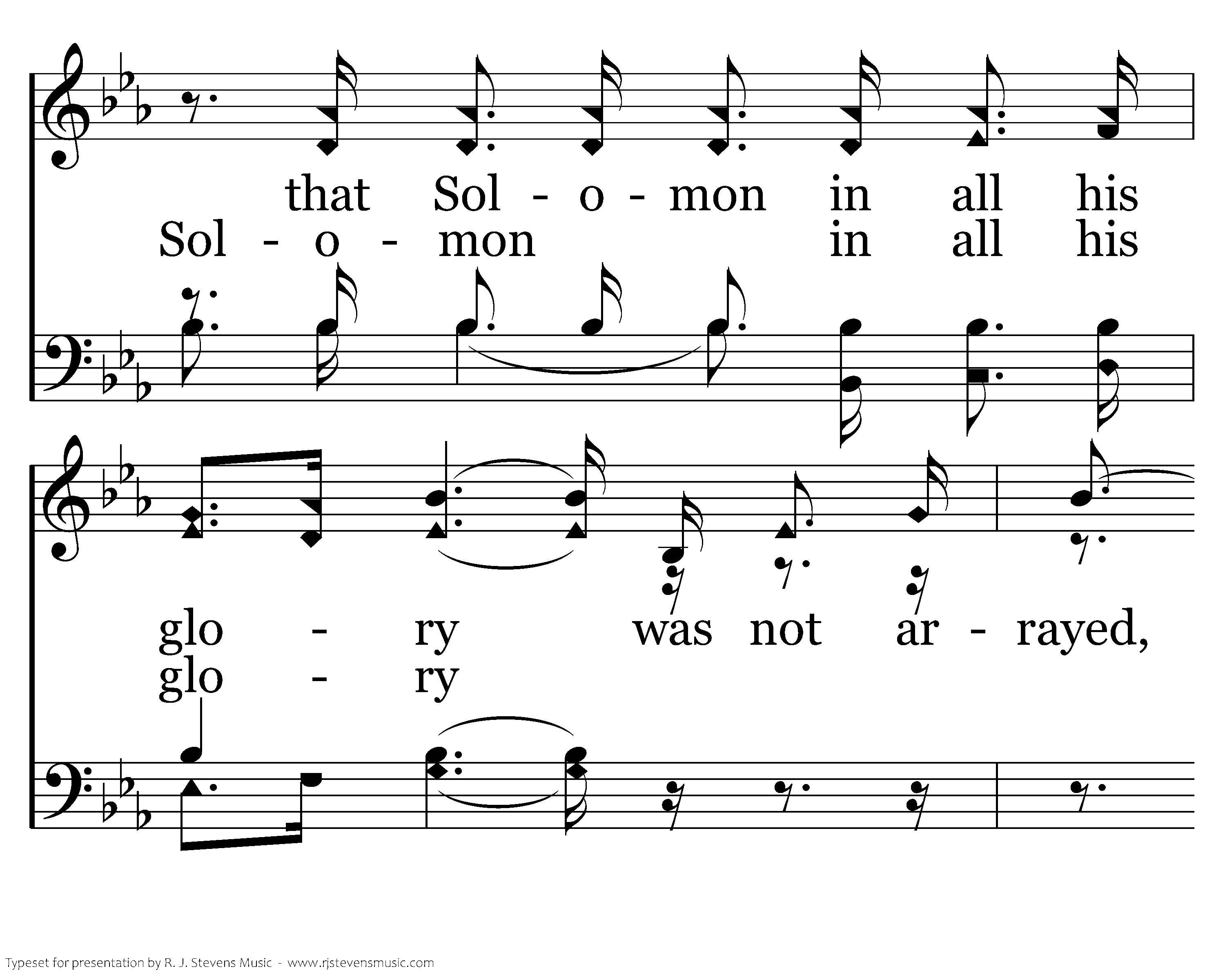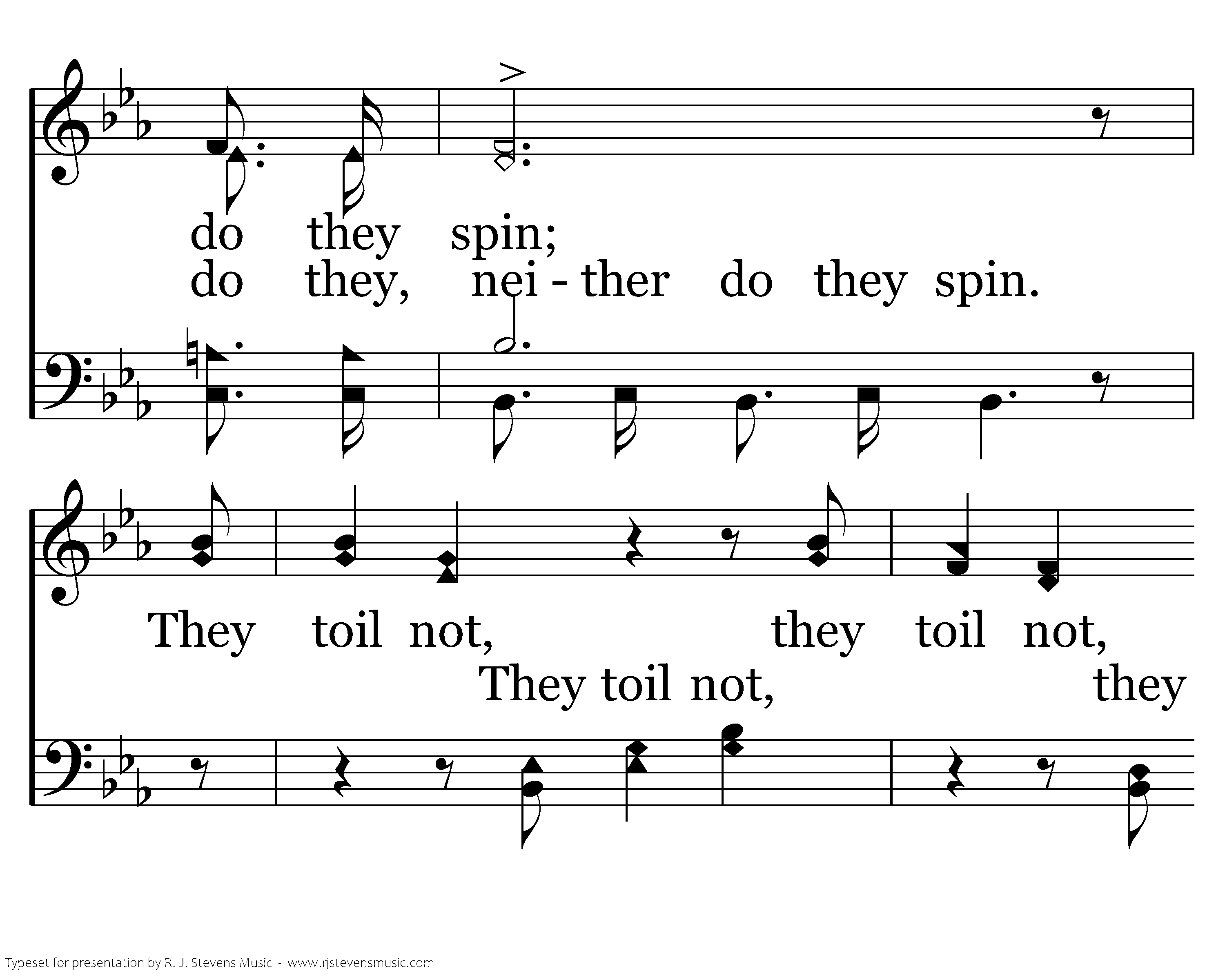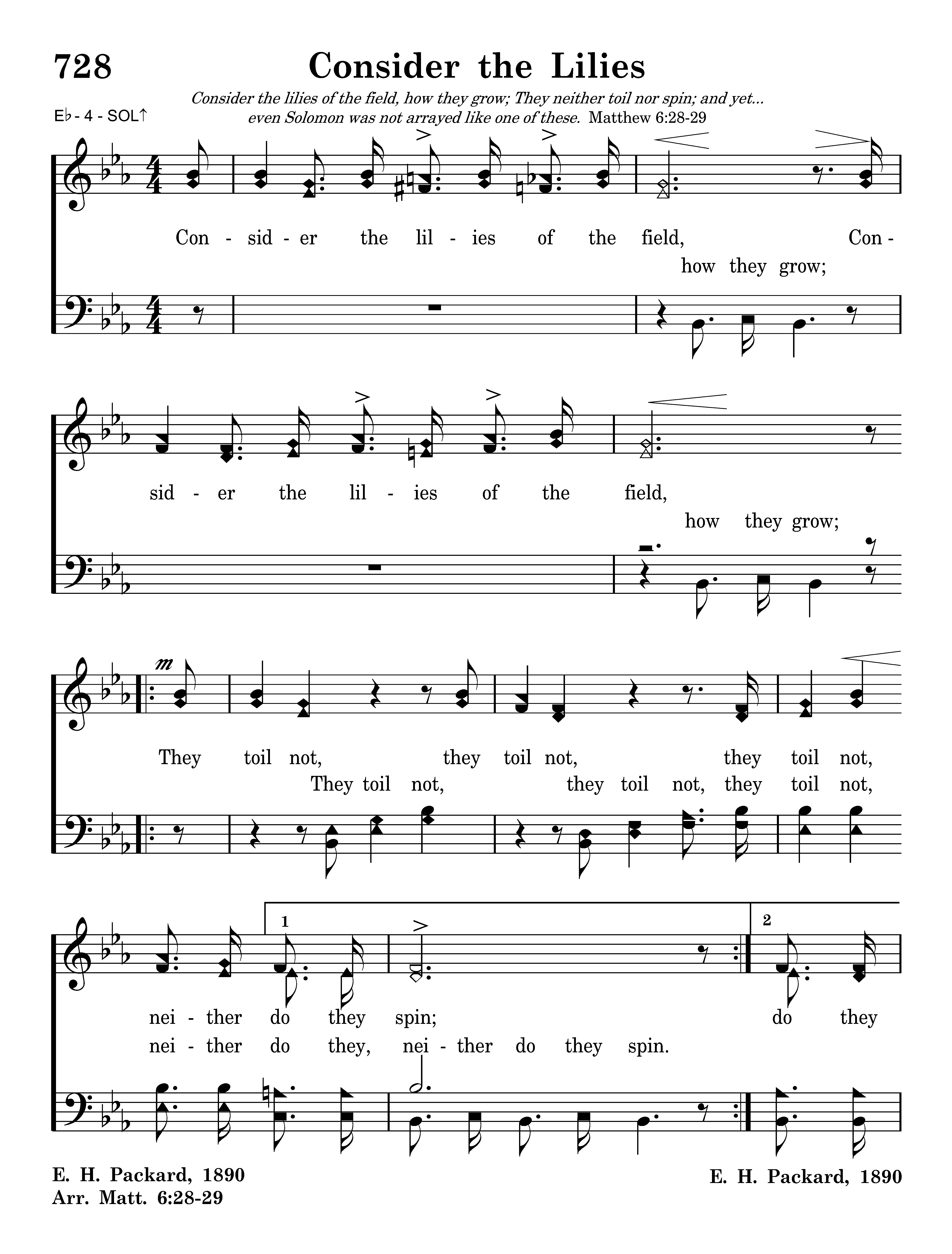 Consider the lilies of the field, how they grow; Consider the lilies of the field, how they grow; They toil not, they toil not, they toil not, neither do they spin; and yet I say unto you. And yet I say And yet I say unto you, unto you, That even Solomon in all his glory was not arrayed, was not arrayed like one of these, like one of these.