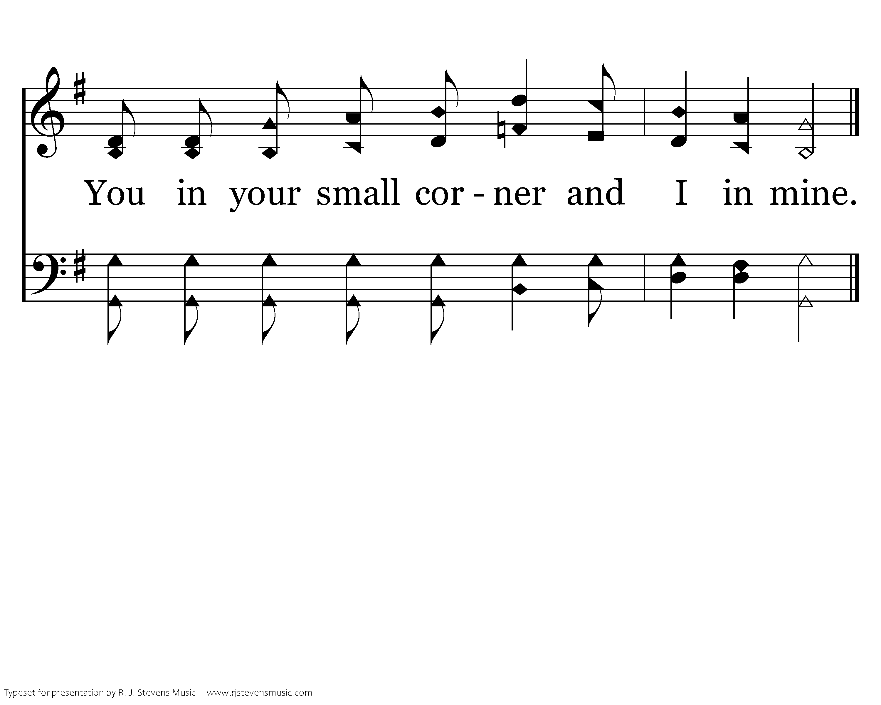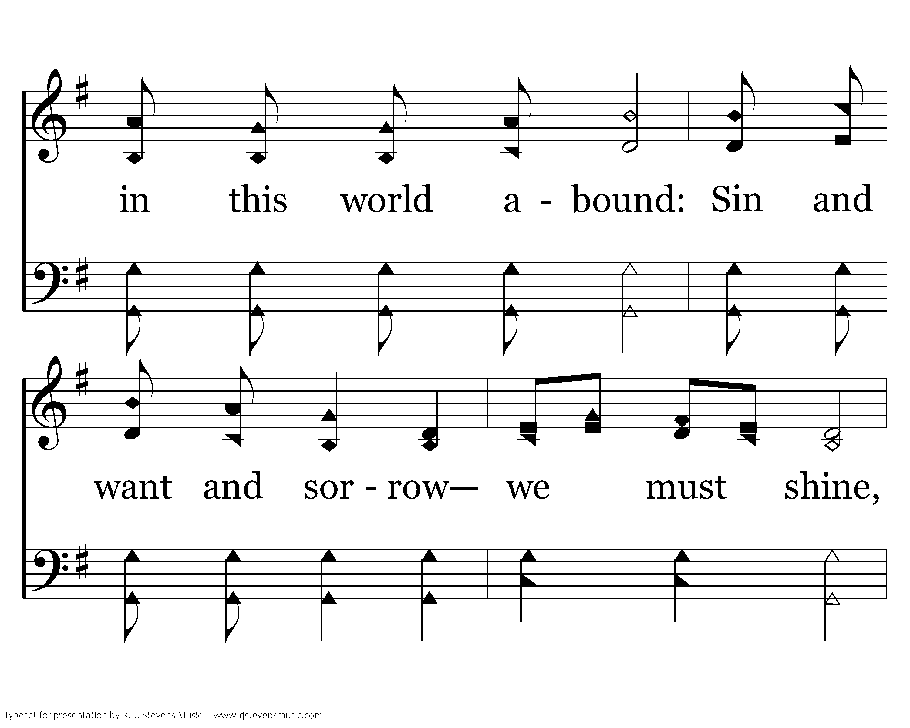 Jesus bids us shine as we work for Him, Bringing those that wander from the paths of sin; He will ever help us, if we shine, You in your small corner and I in mine.