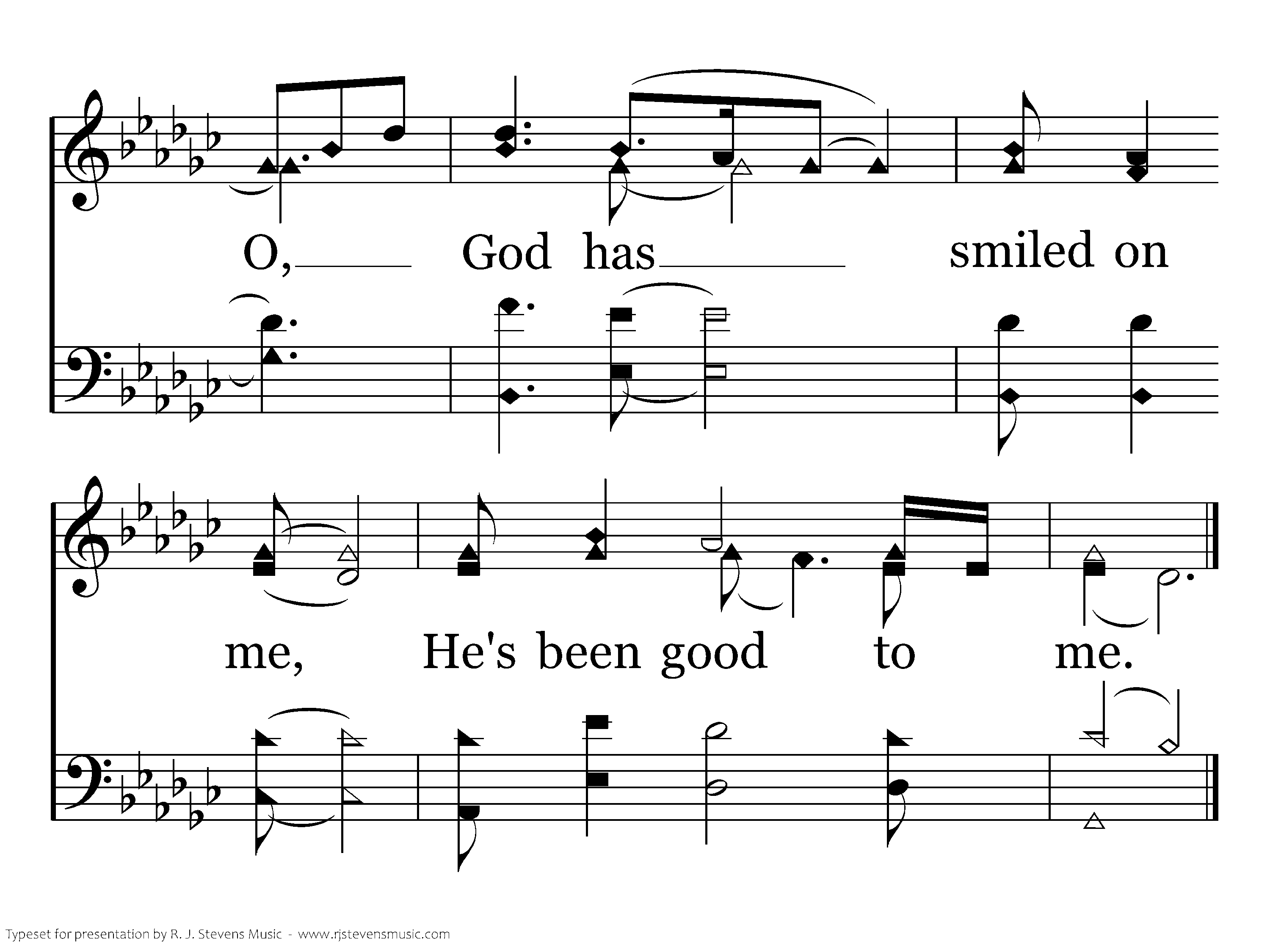 God has smiled on me, He has set me free; O, God has smiled on me, He's been good, He's been good, He's been good to me.