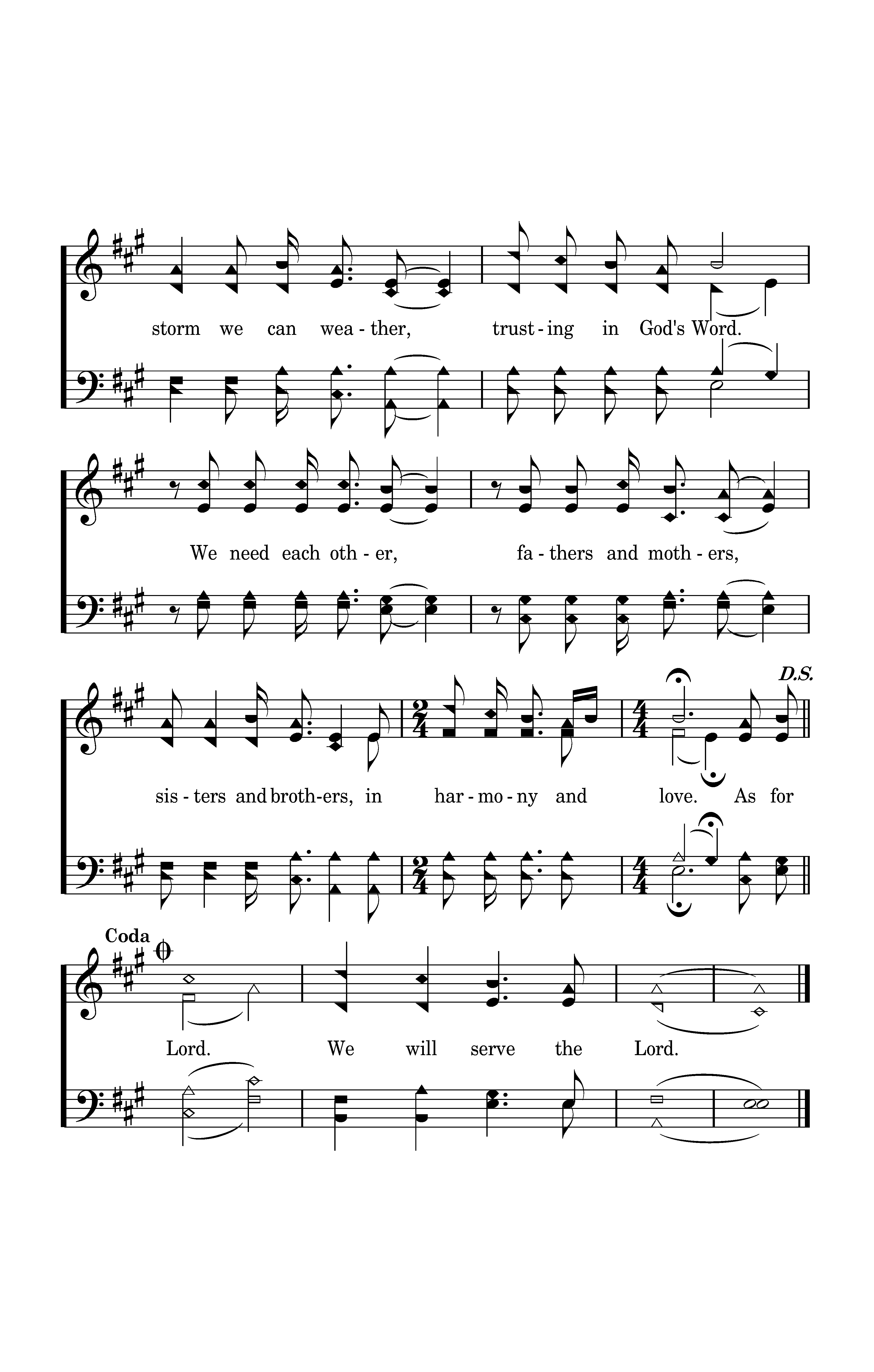 Lord, we vow to live holy, bowing our knees to You only. As for me and my house, we will serve the Lord, as for me and my house, we will serve the Lord. We will serve the Lord. Staying together, praying together, any storm we can weather, trusting in God's Word. We need each other, fathers and mothers, sisters and brothers, in harmony and love.