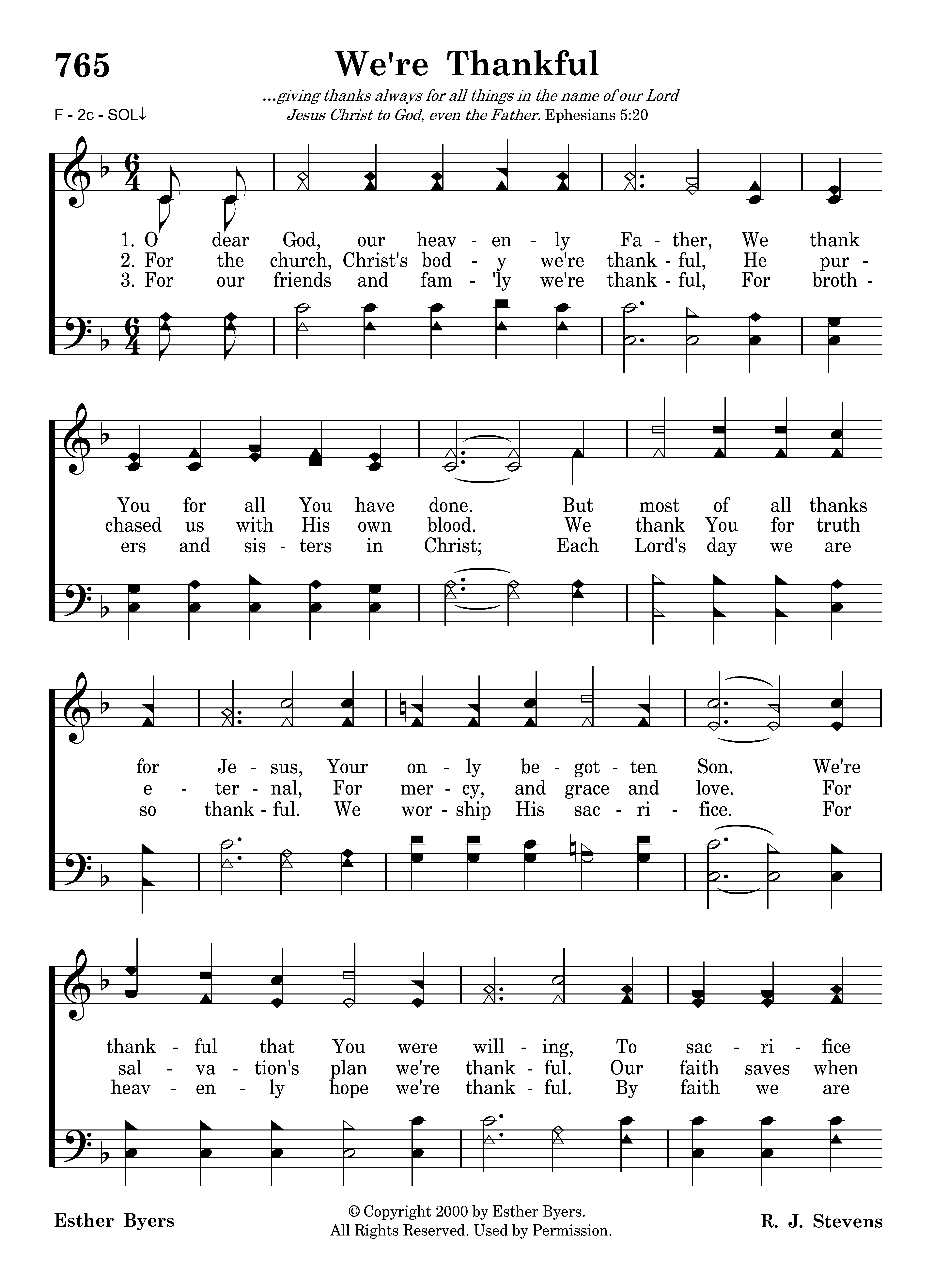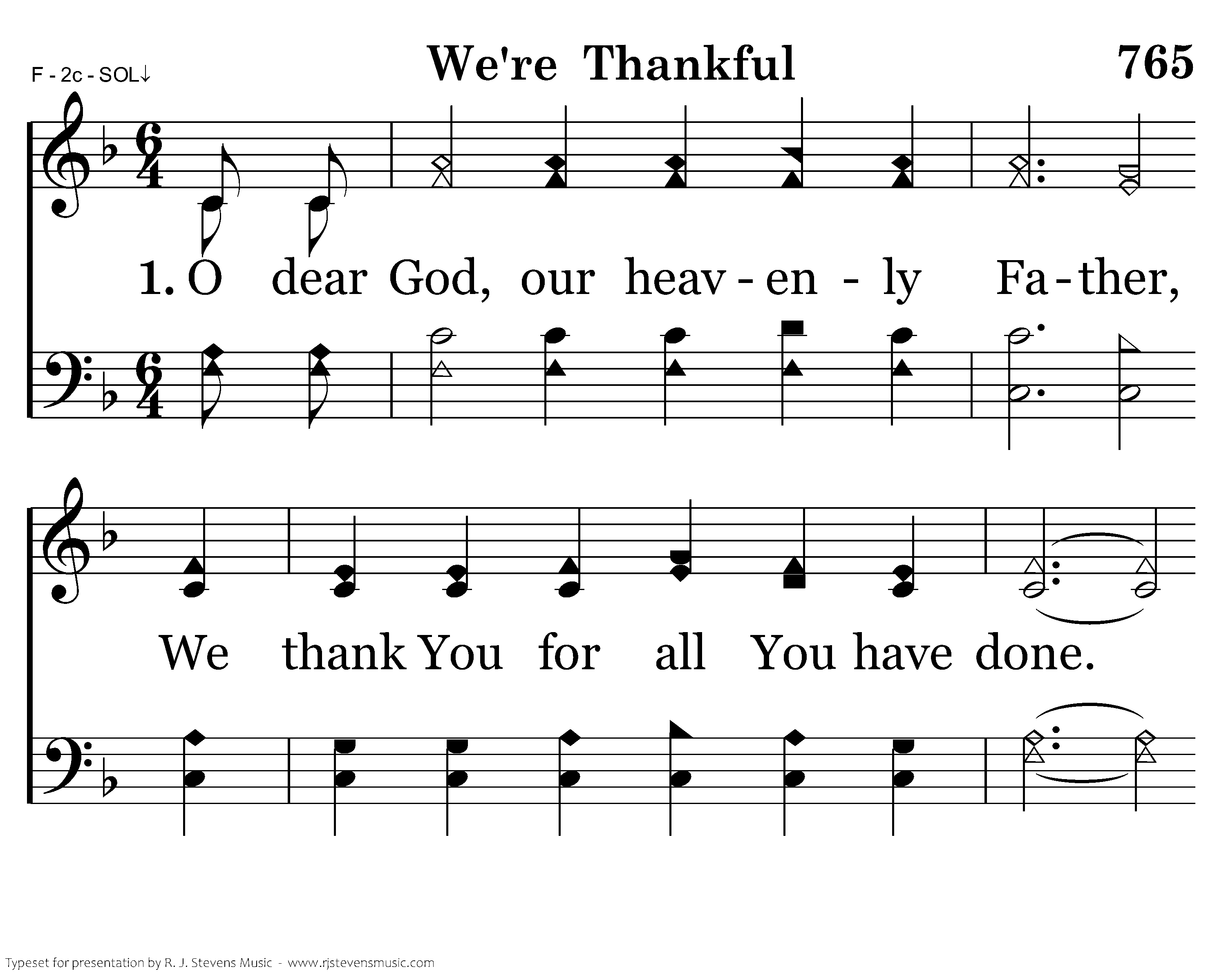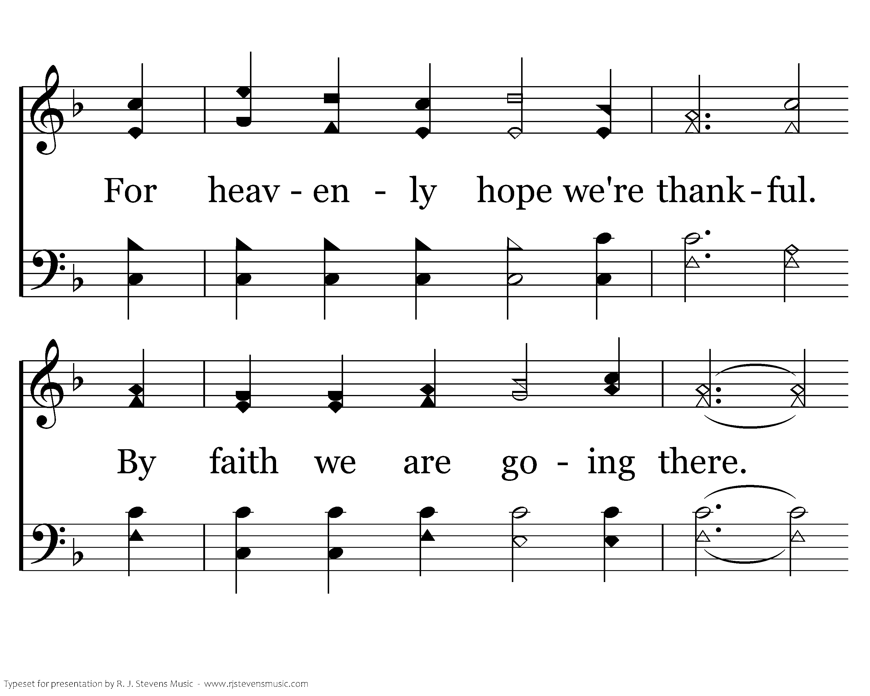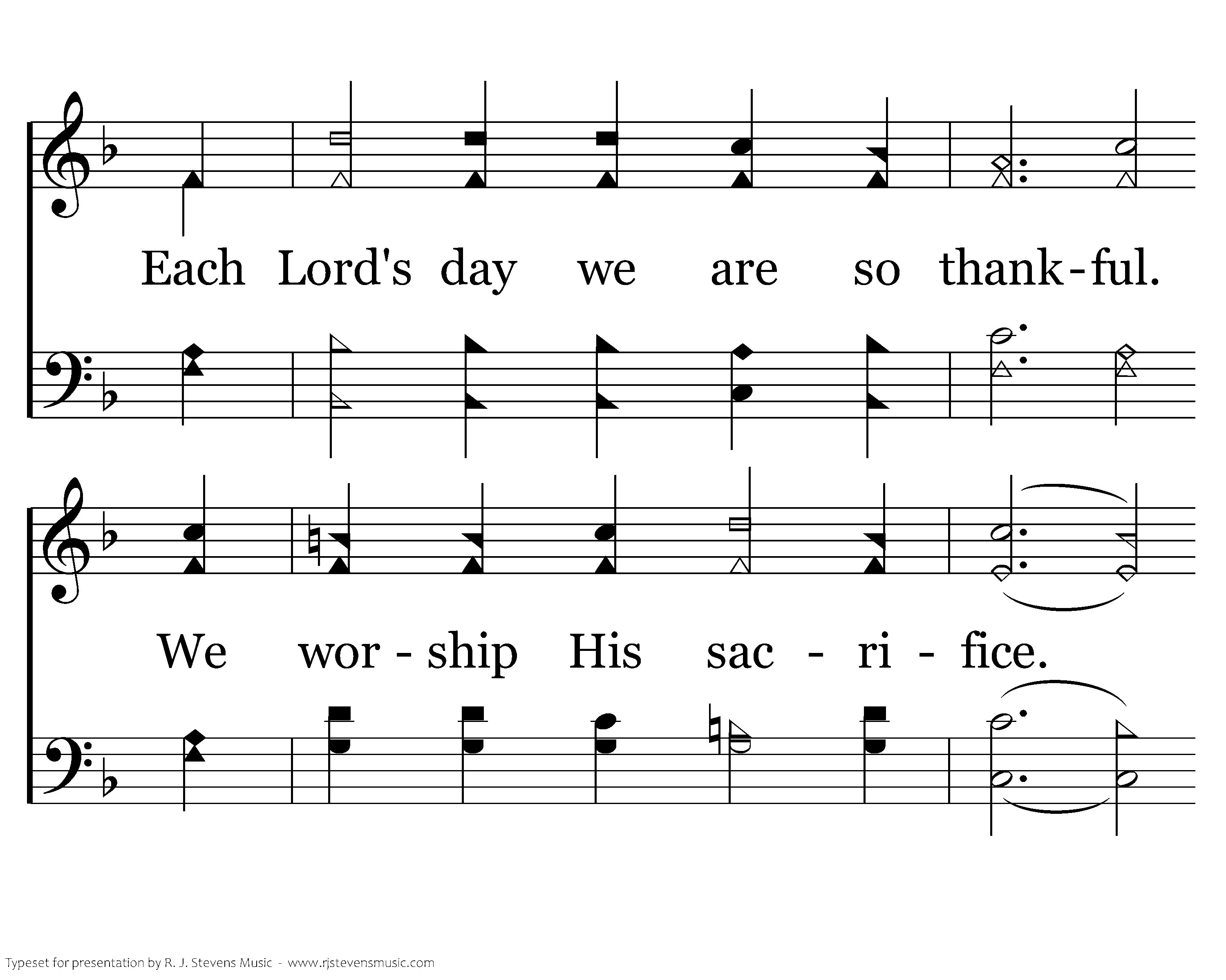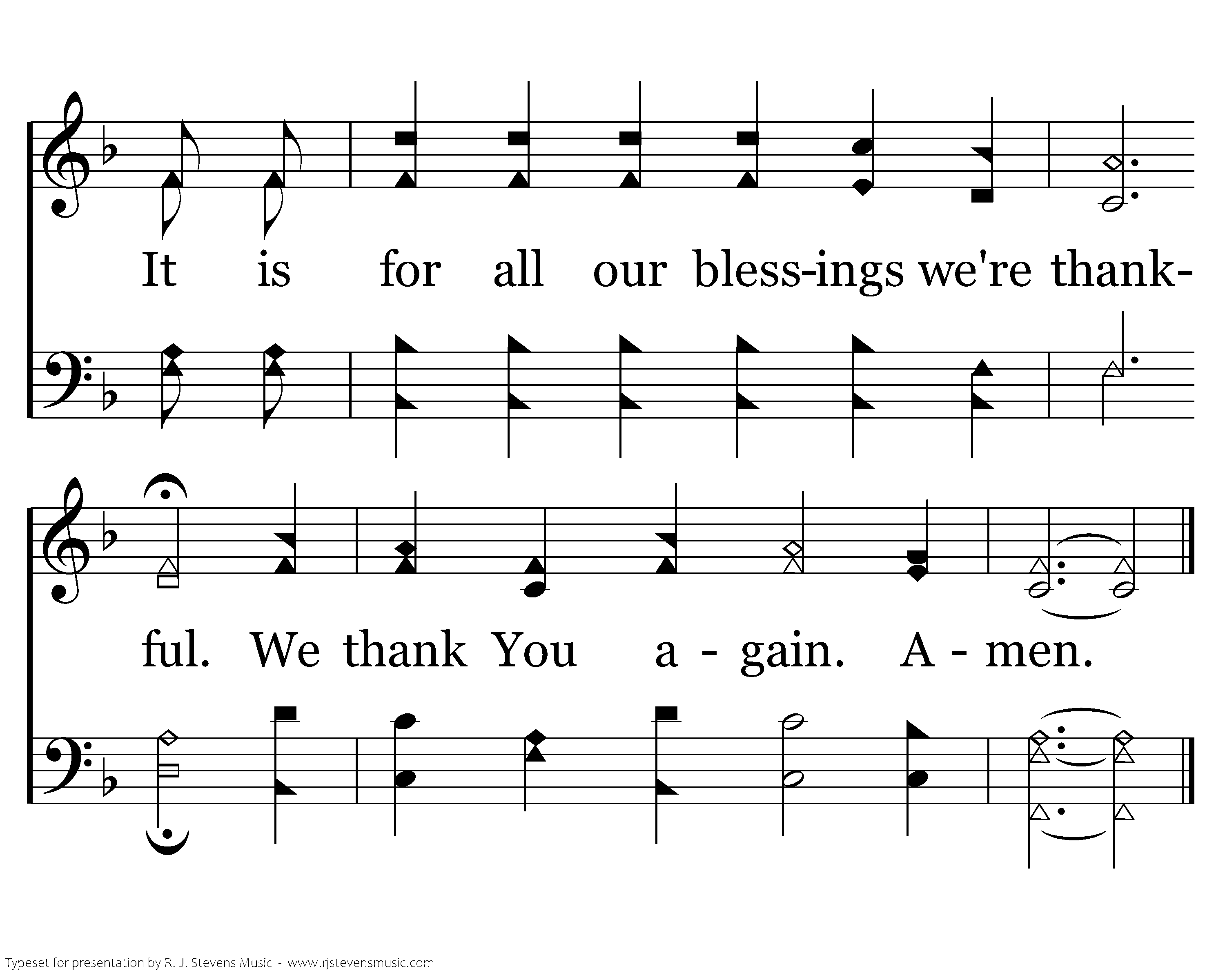 For our friends and fam'ly we're thankful, For brothers and sisters in Christ; Each Lord's day we are so thankful. We worship His sacrifice. For heavenly hope we're thankful. By faith we are going there. It is for all our blessings we're thankful. We thank You again. Amen.