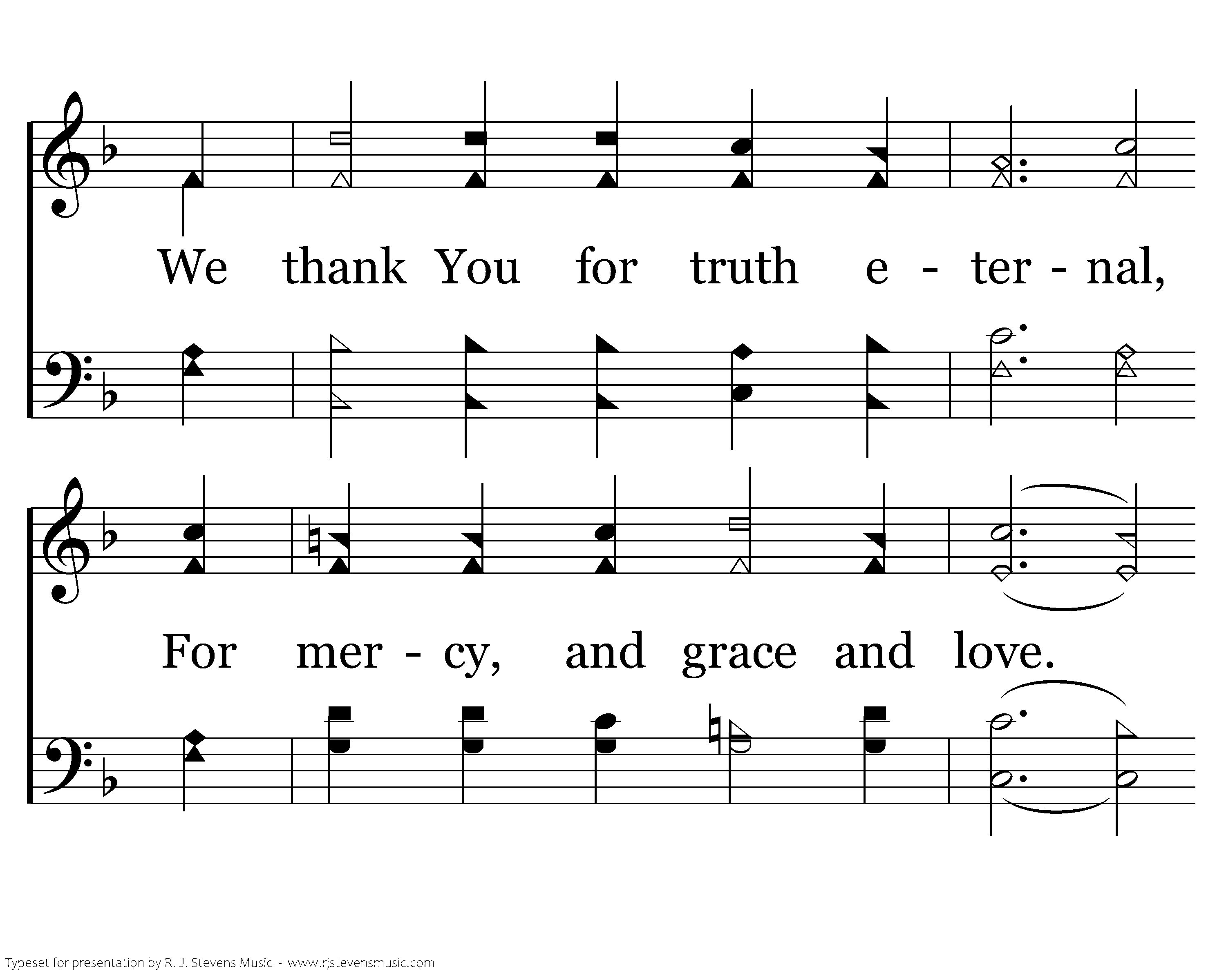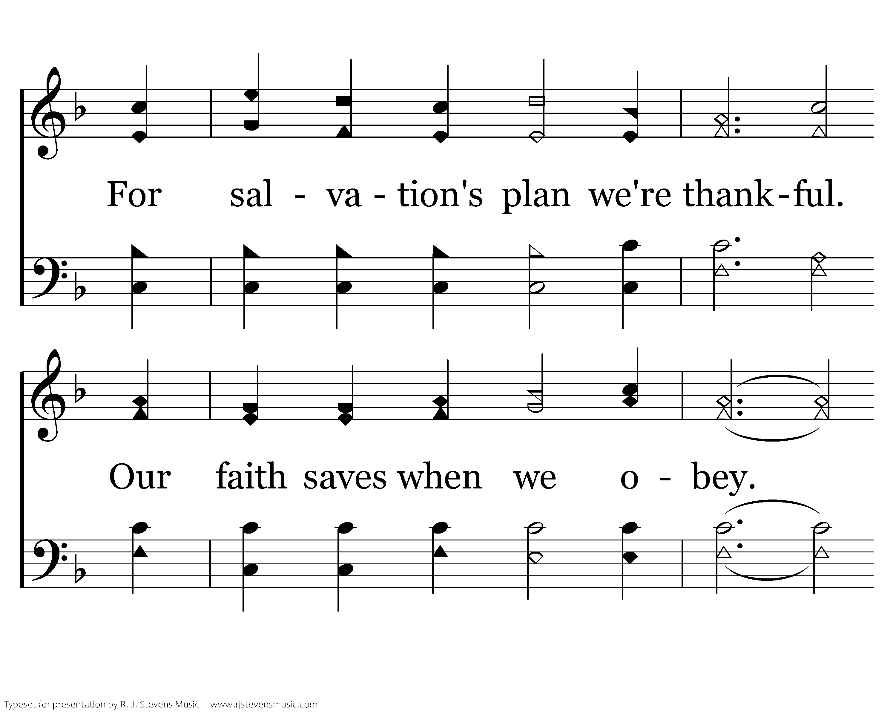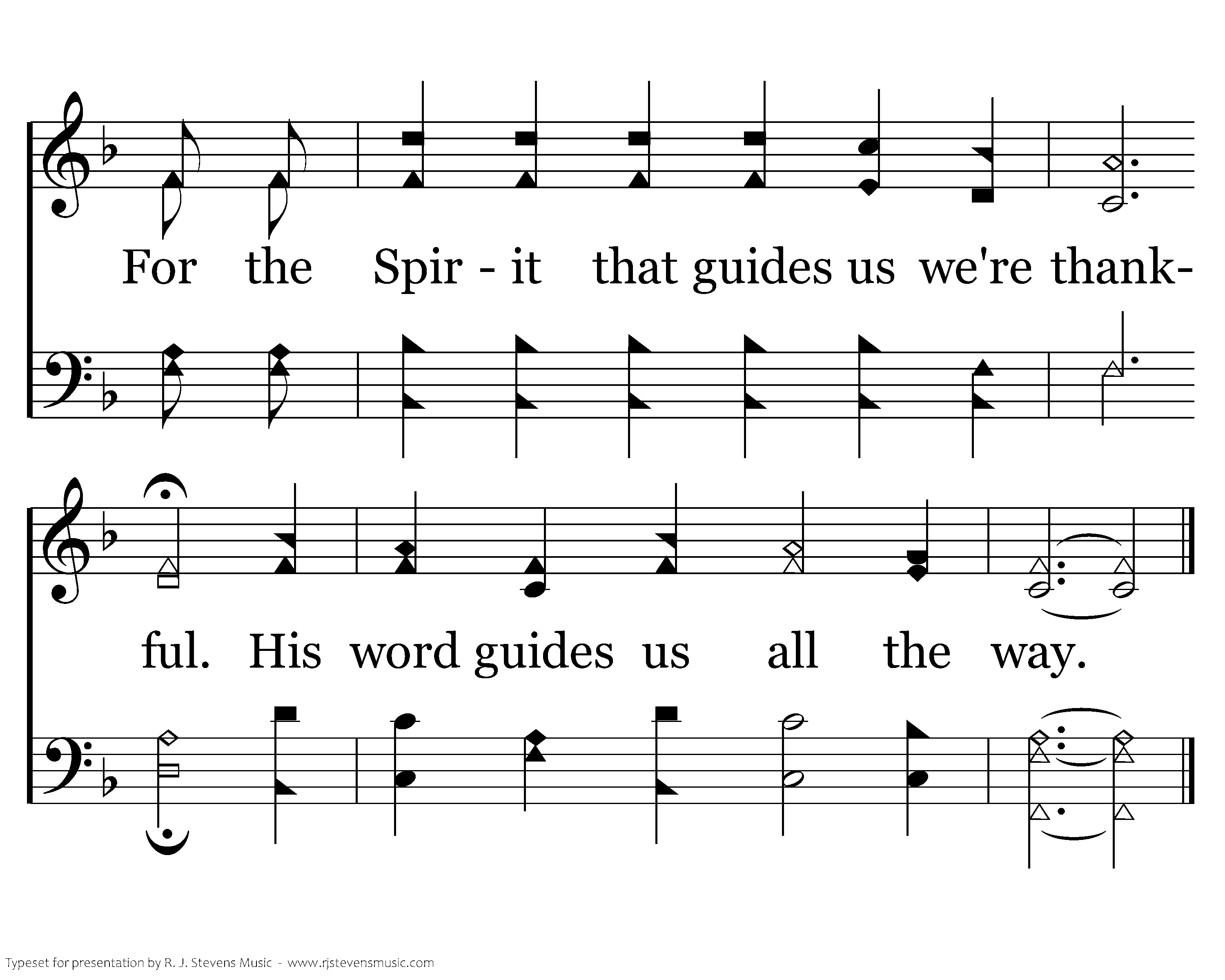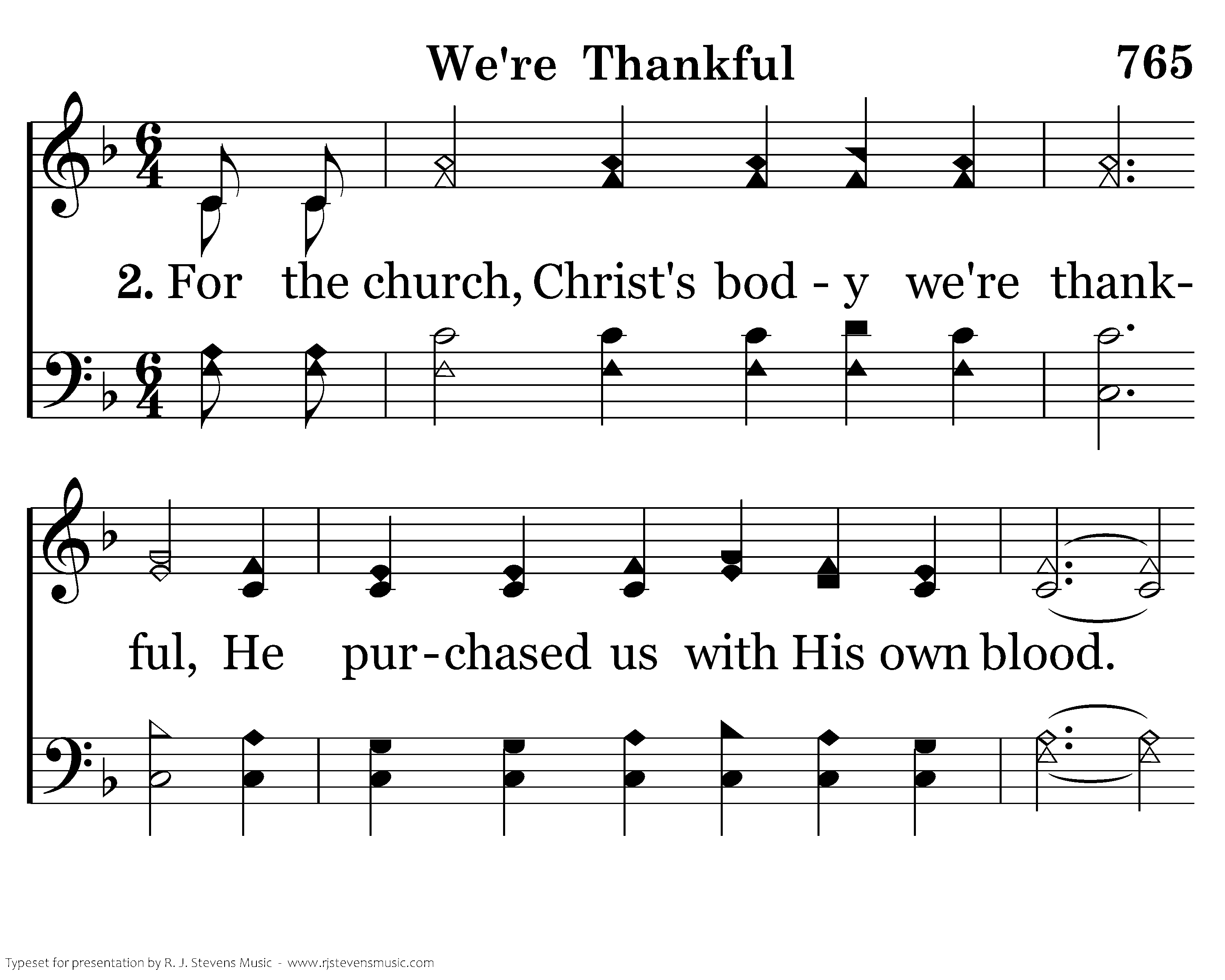 For the church, Christ's body we're thankful, He purchased us with His own blood. We thank You for truth eternal, For mercy, and grace and love. For salvation's plan we're thankful. Our faith saves when we obey. For the Spirit that guides us we're thankful. His word guides us all the way.