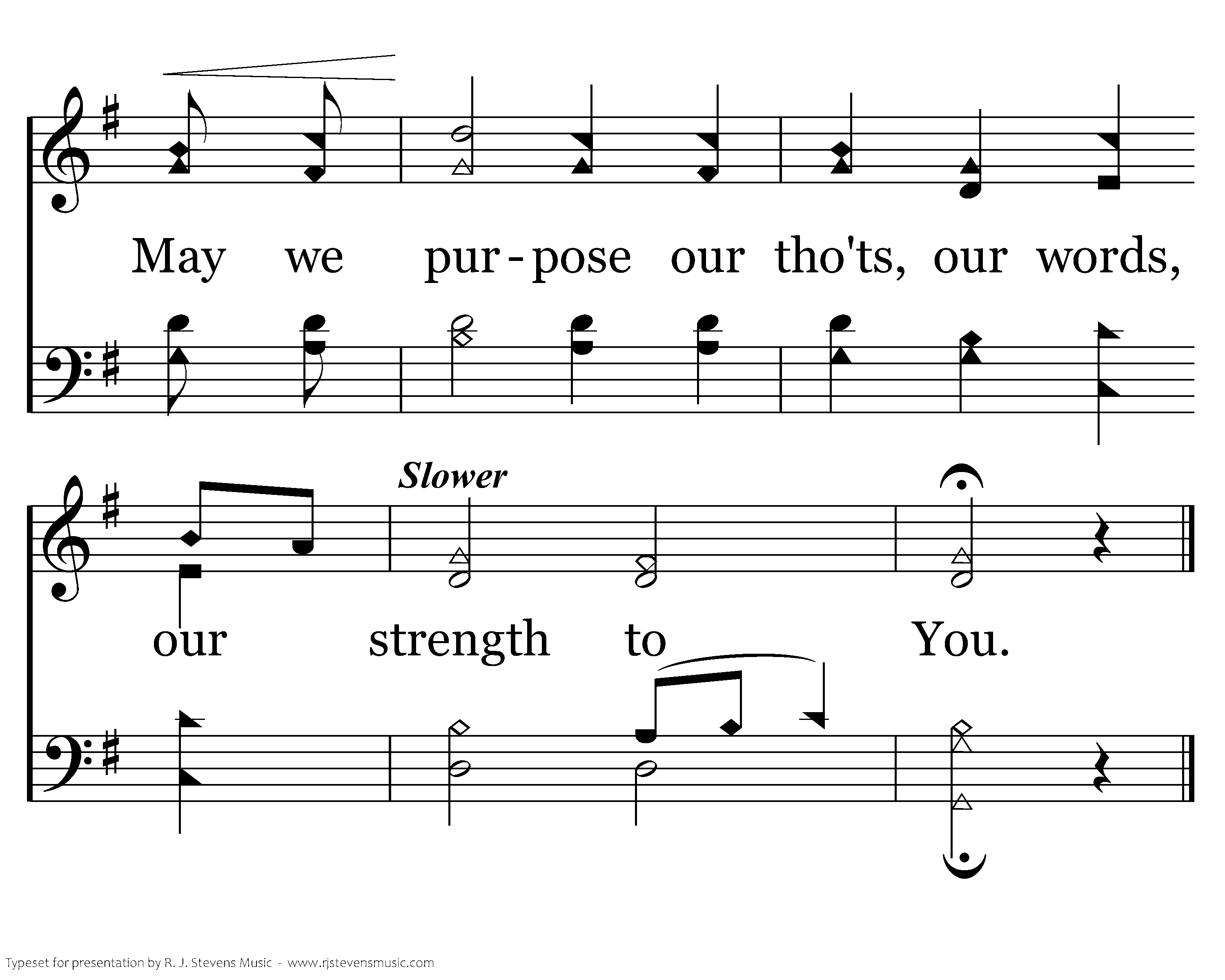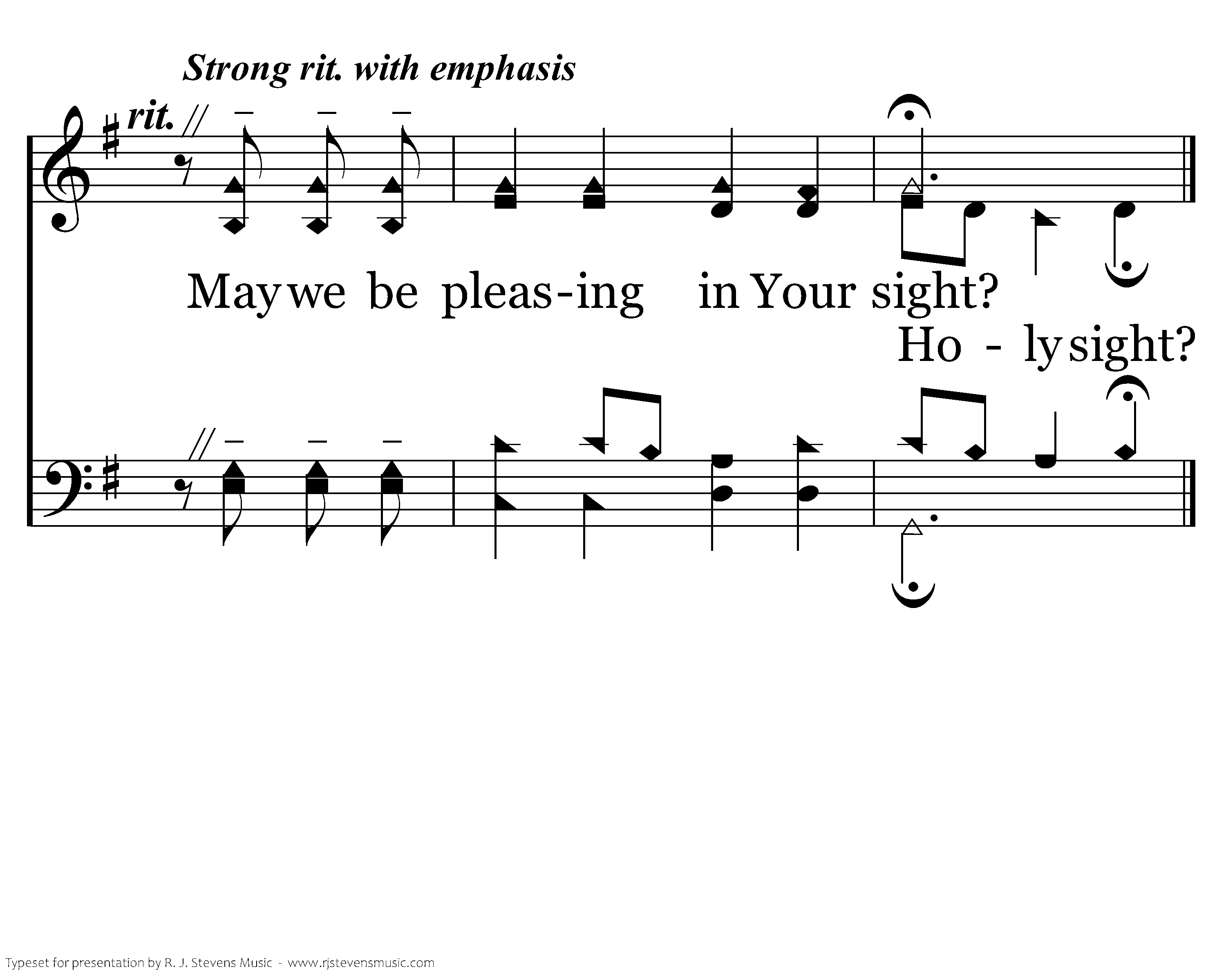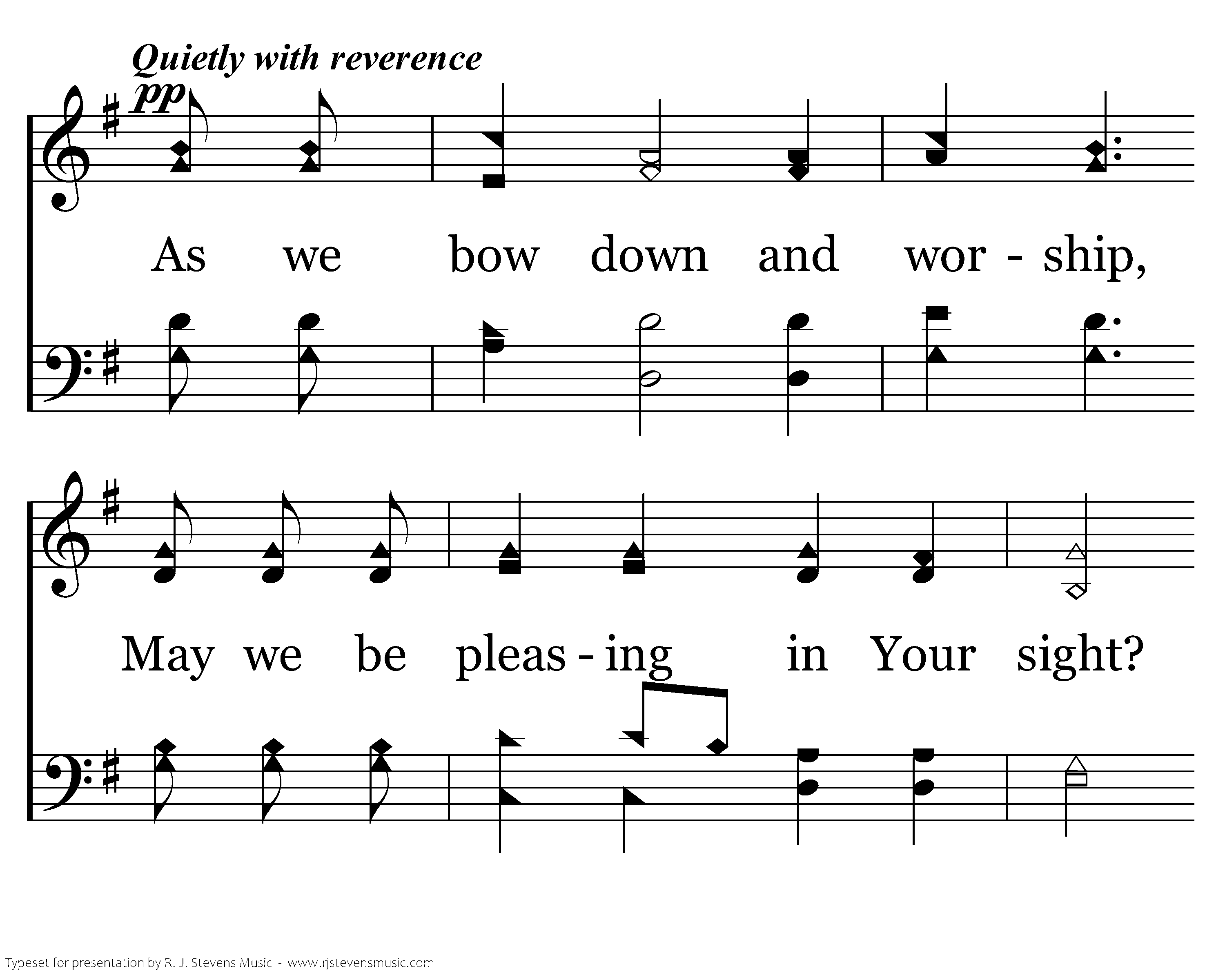We stand in Your presence, in holiness and awe, May we purpose our tho'ts, our words, our strength to You. As we bow down and worship, May we be pleasing in Your sight? May we be pleasing in Your sight?