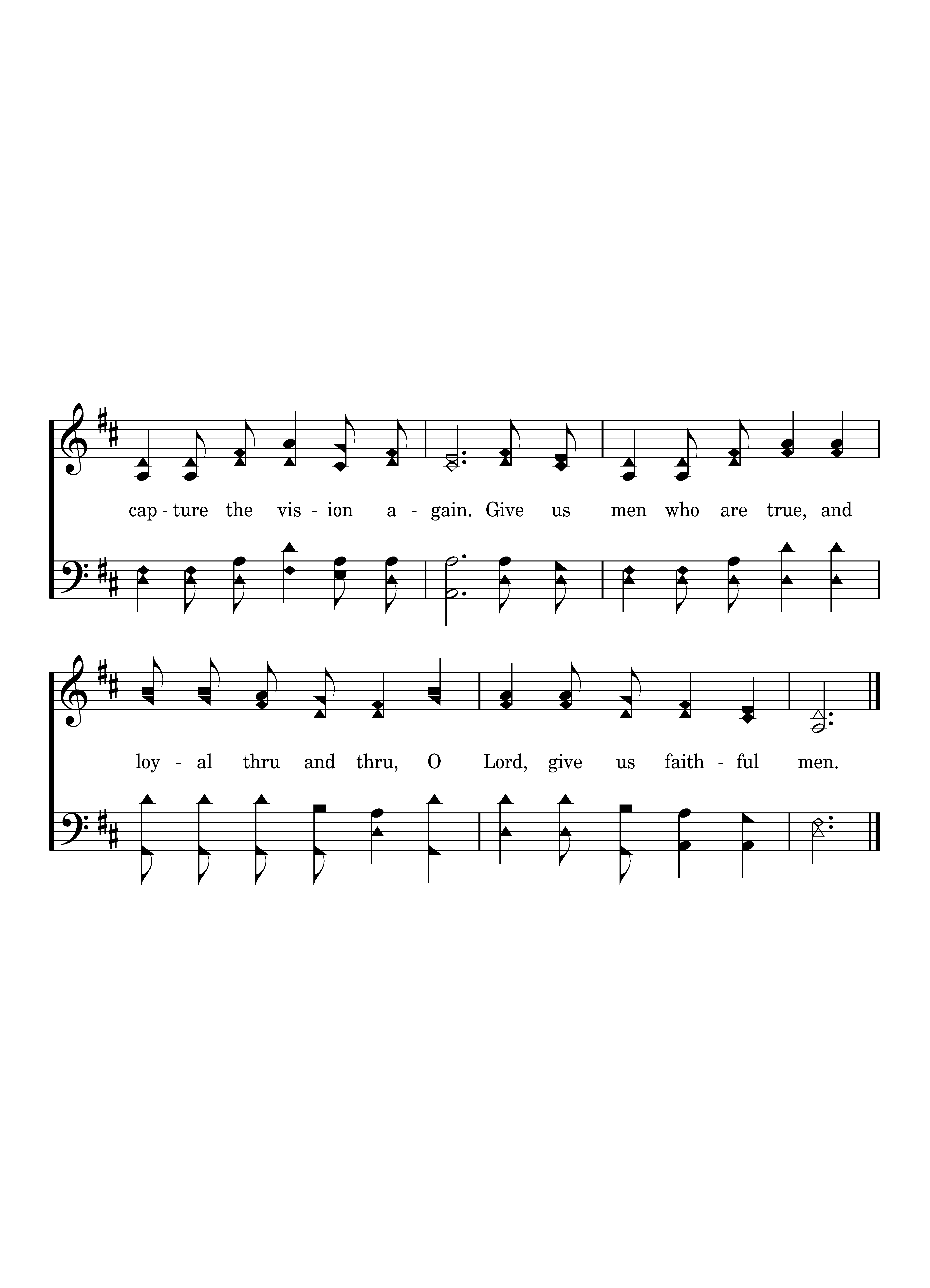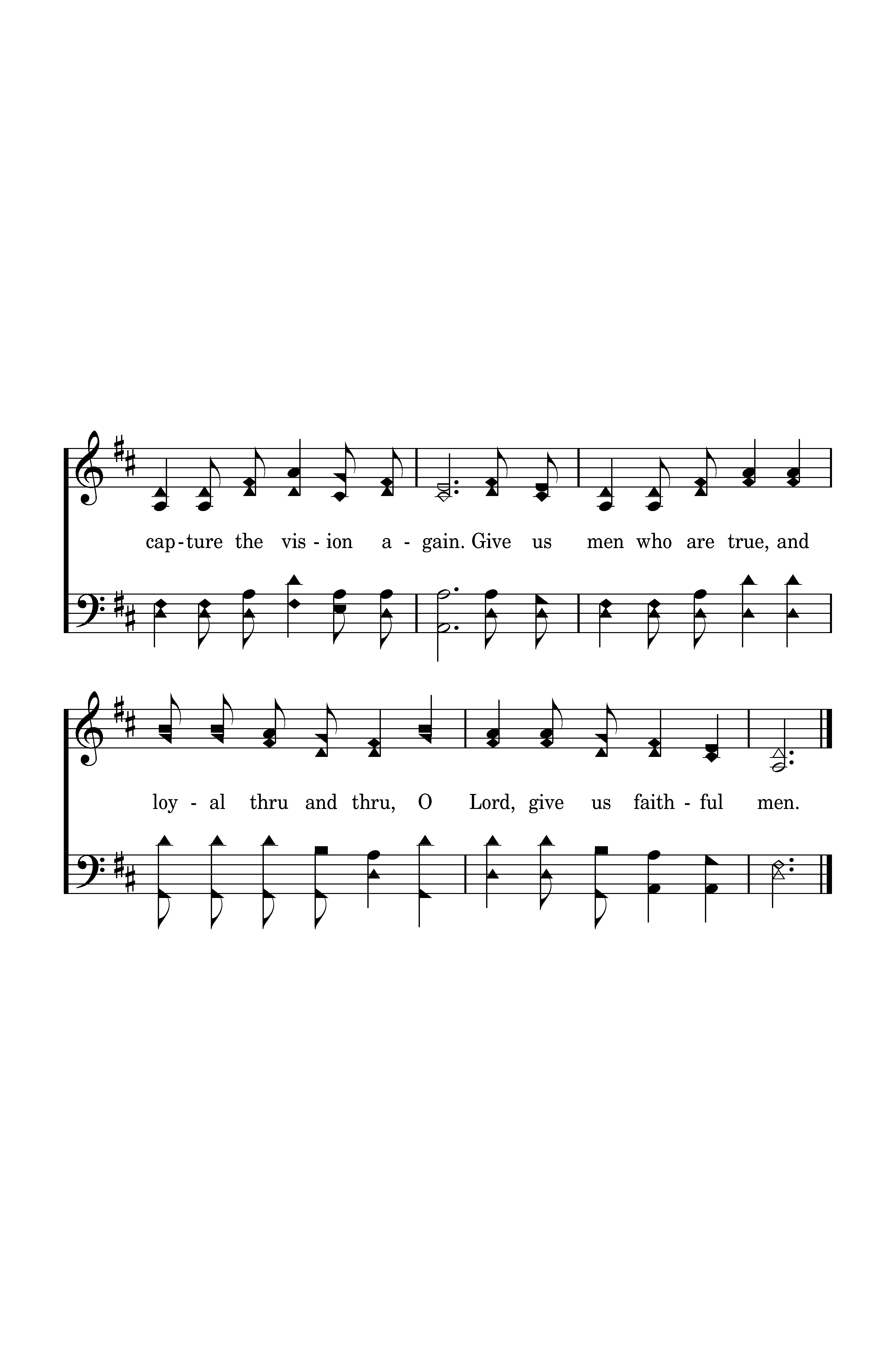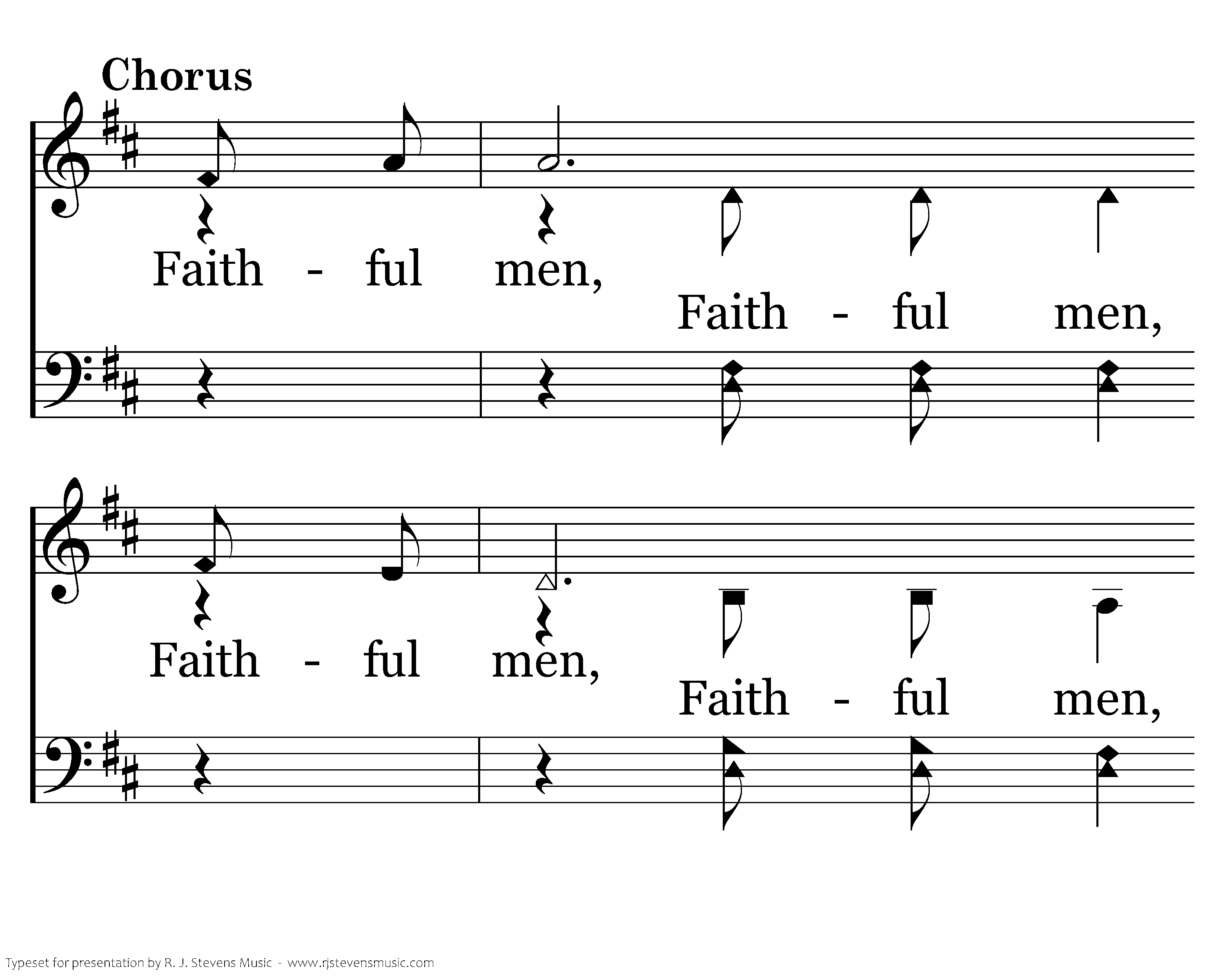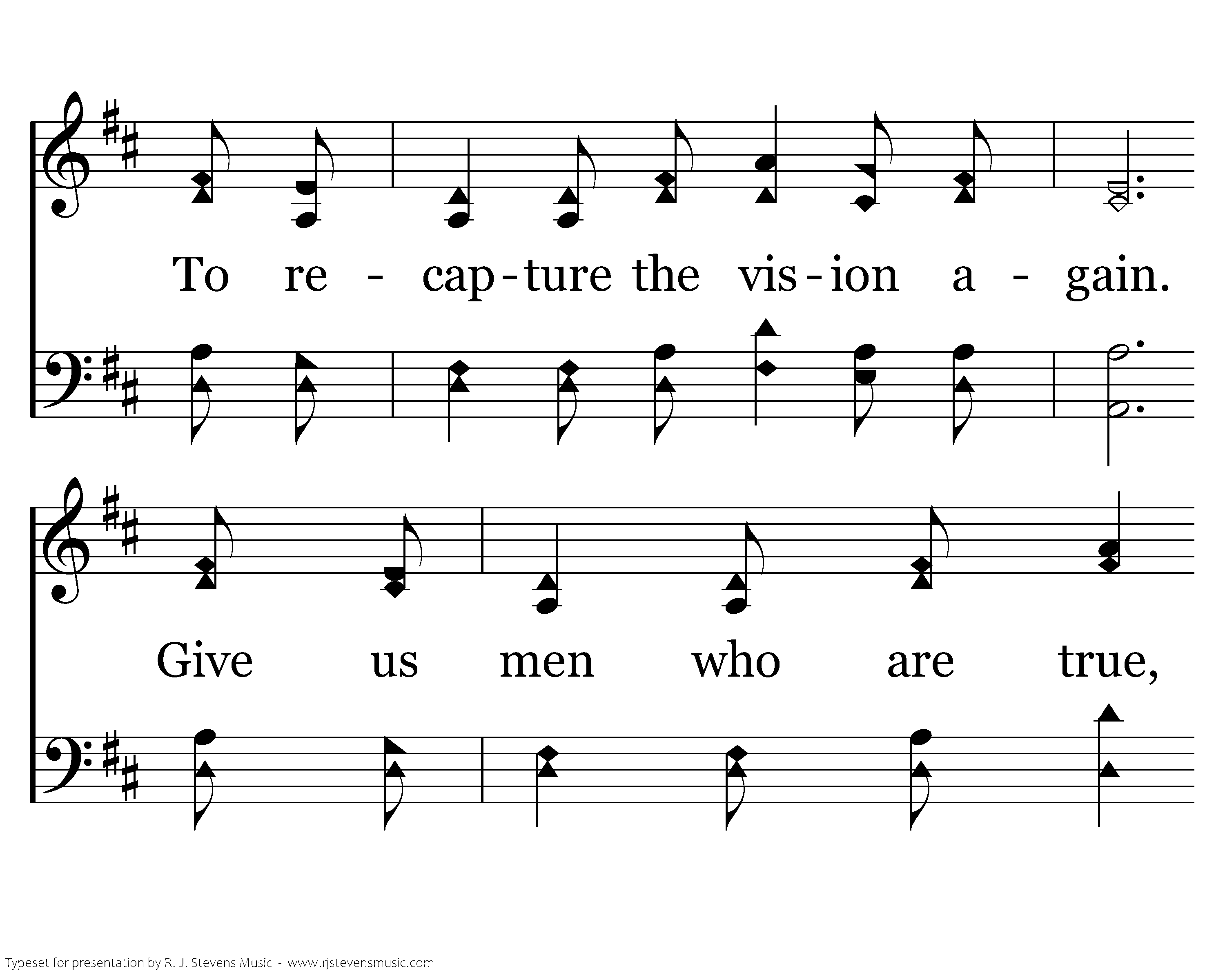 Faithful men, Faithful men, Faithful men, Faithful men, To recapture the vision again. Give us men who are true, and loyal thru and thru, O Lord, give us faithful men.
