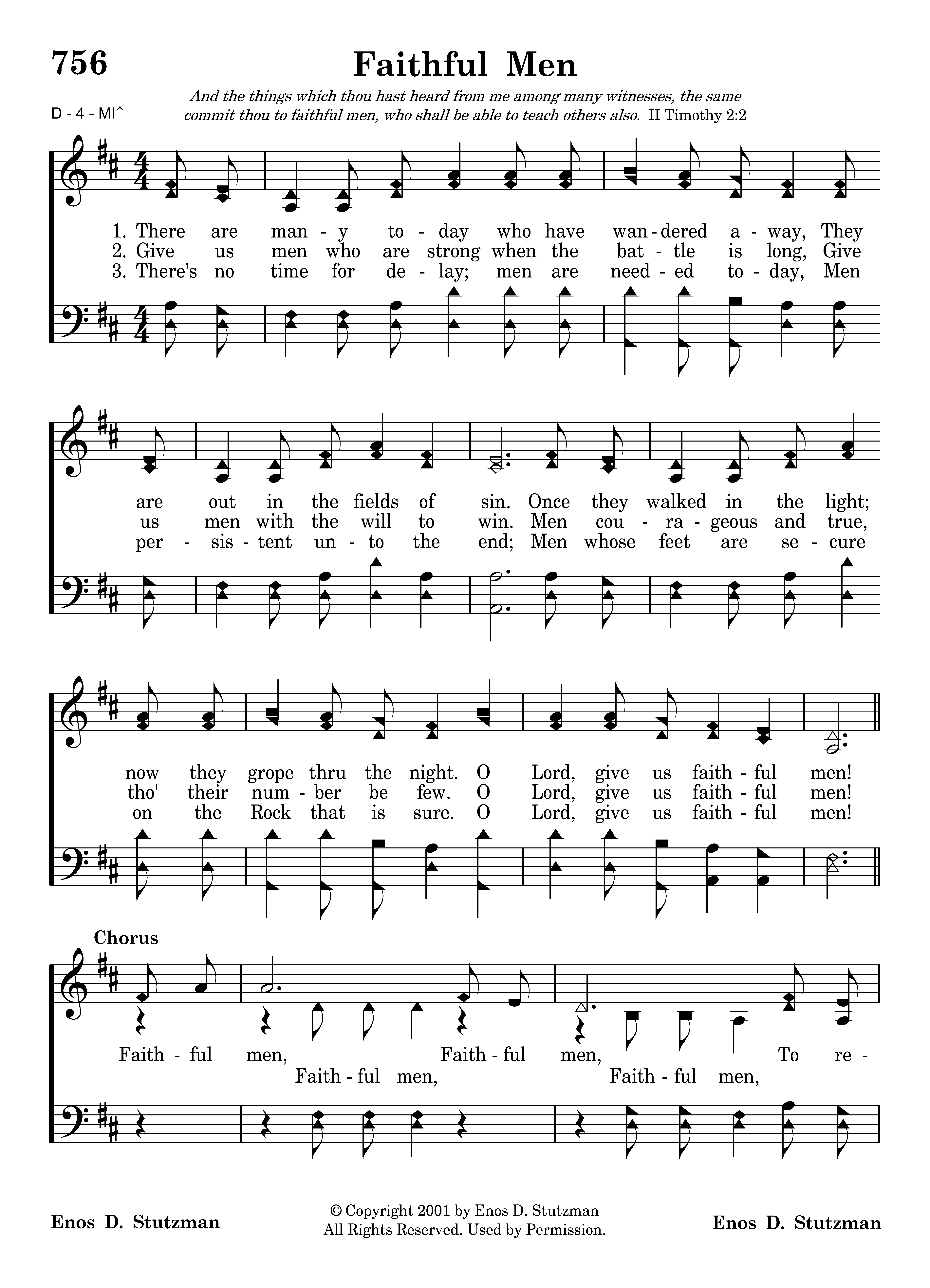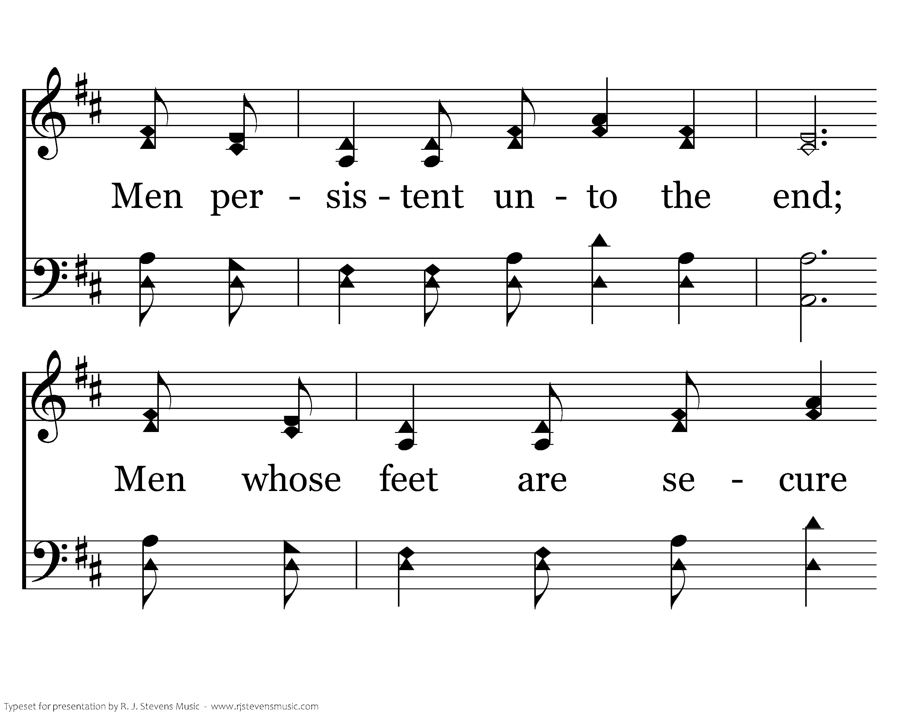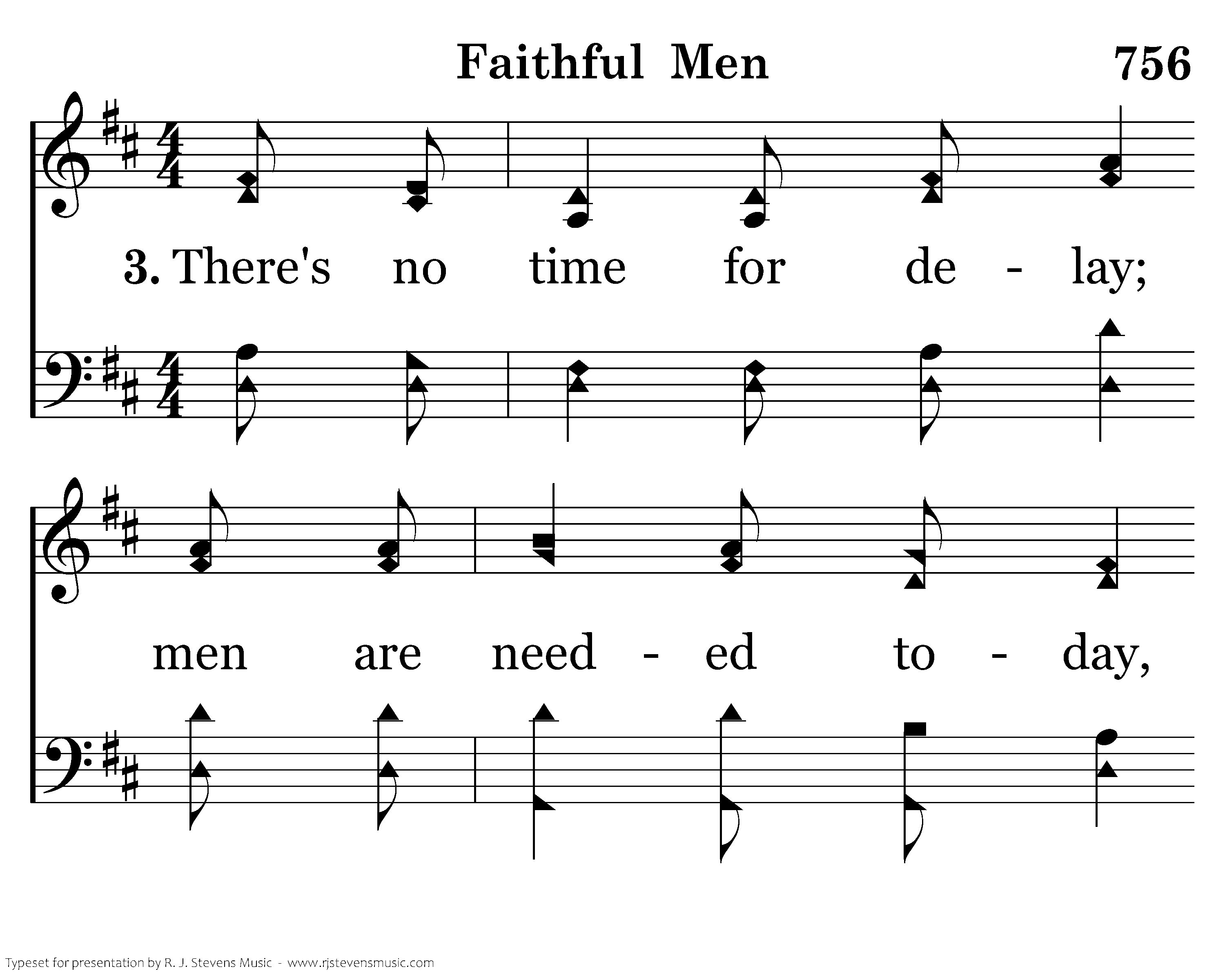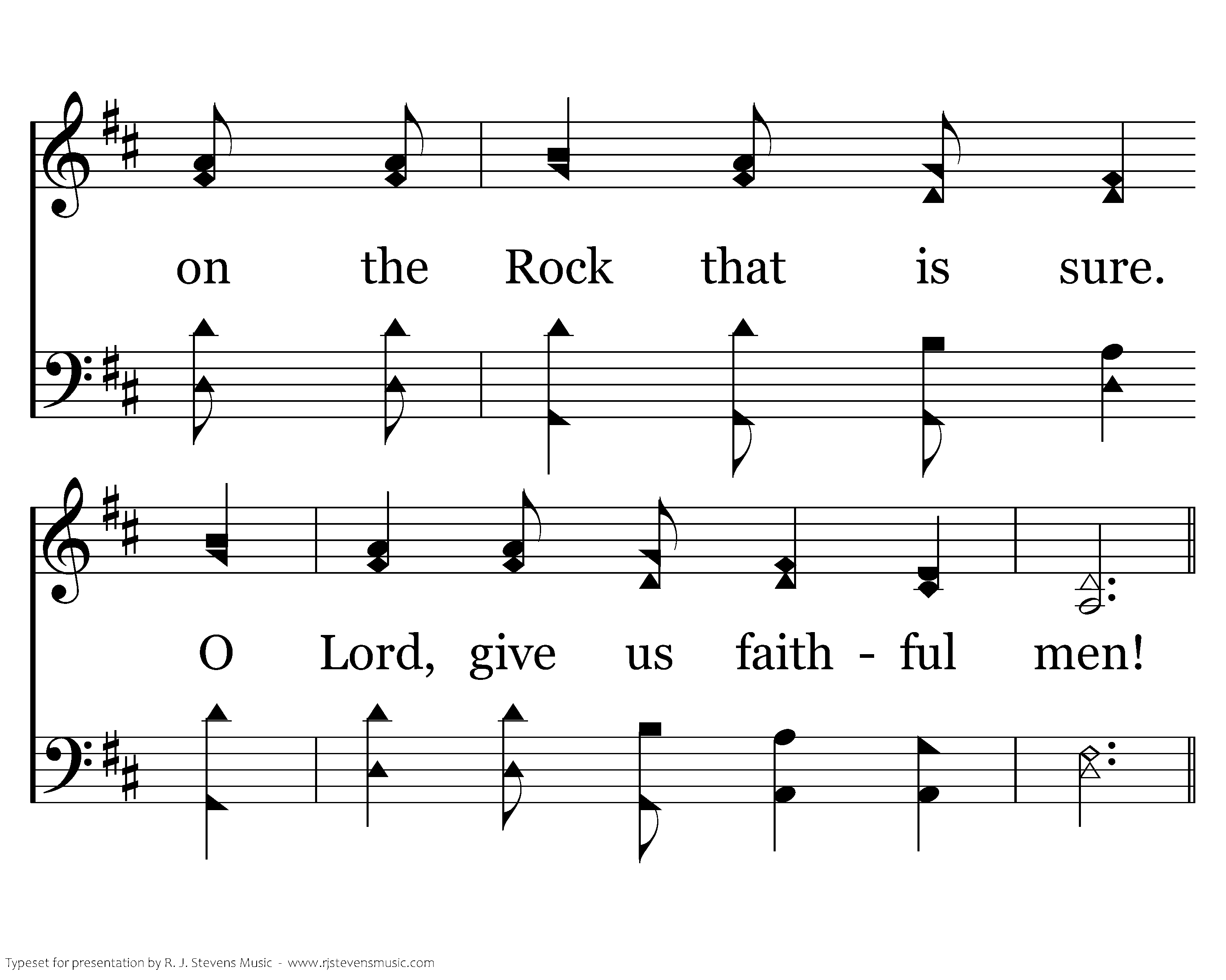 There's no time for delay; men are needed today, Men persistent unto the end; Men whose feet are secure on the Rock that is sure. O Lord, give us faithful men!