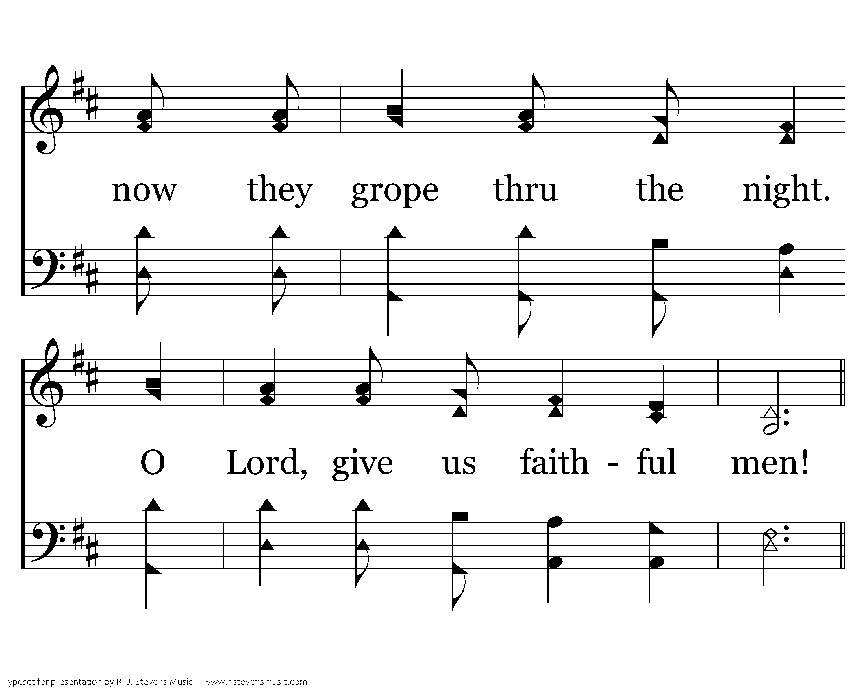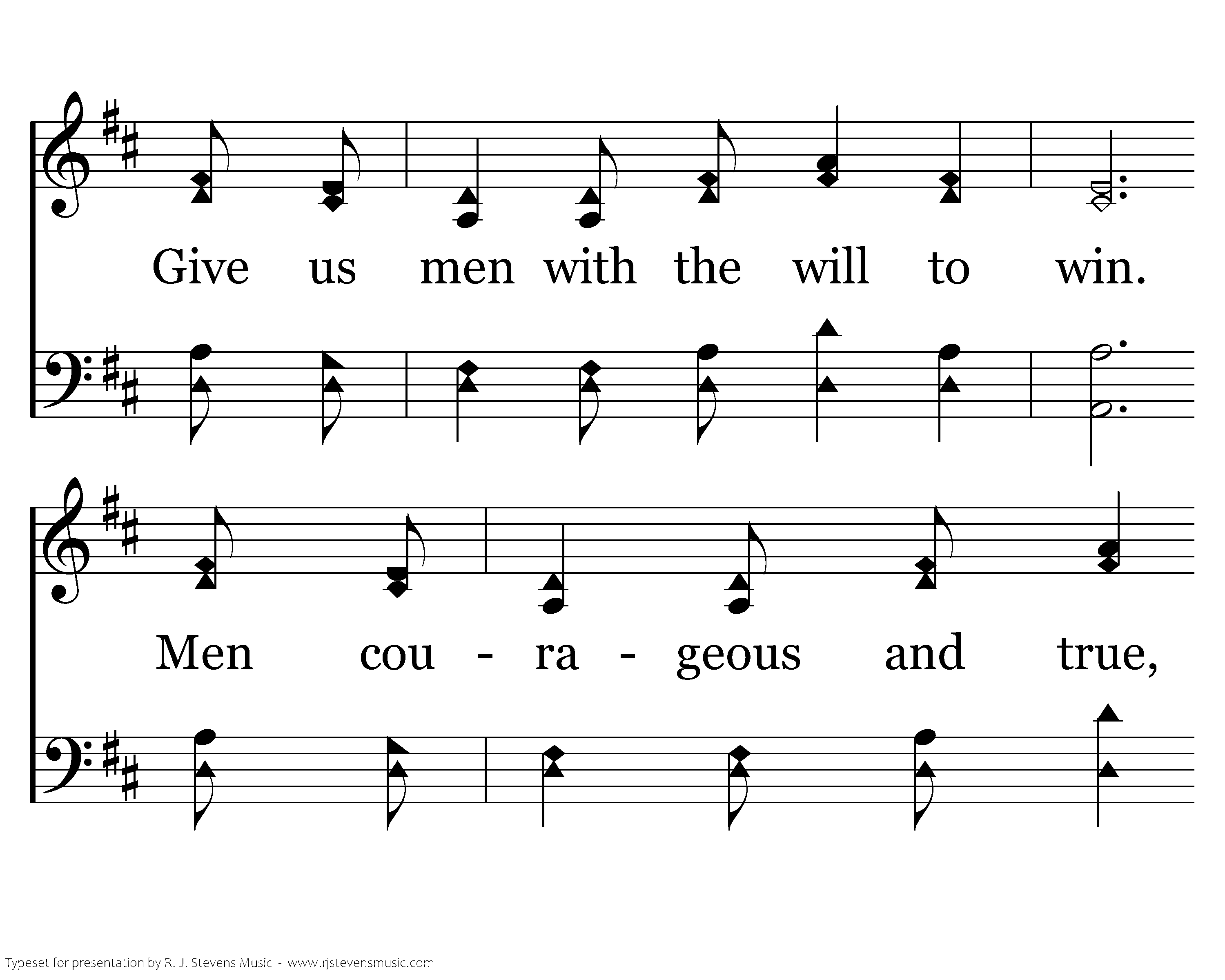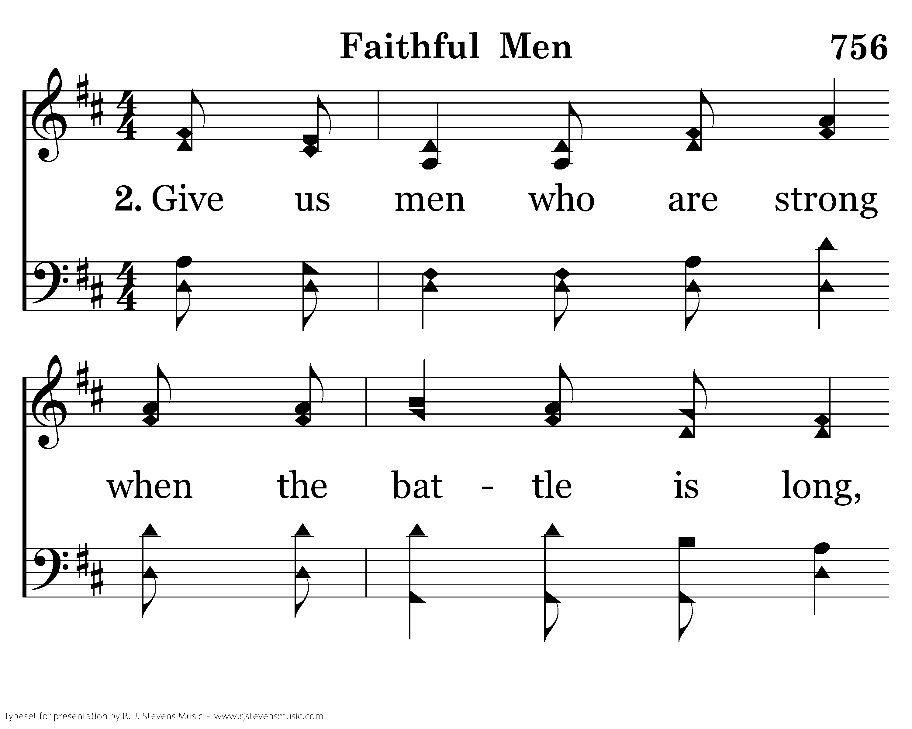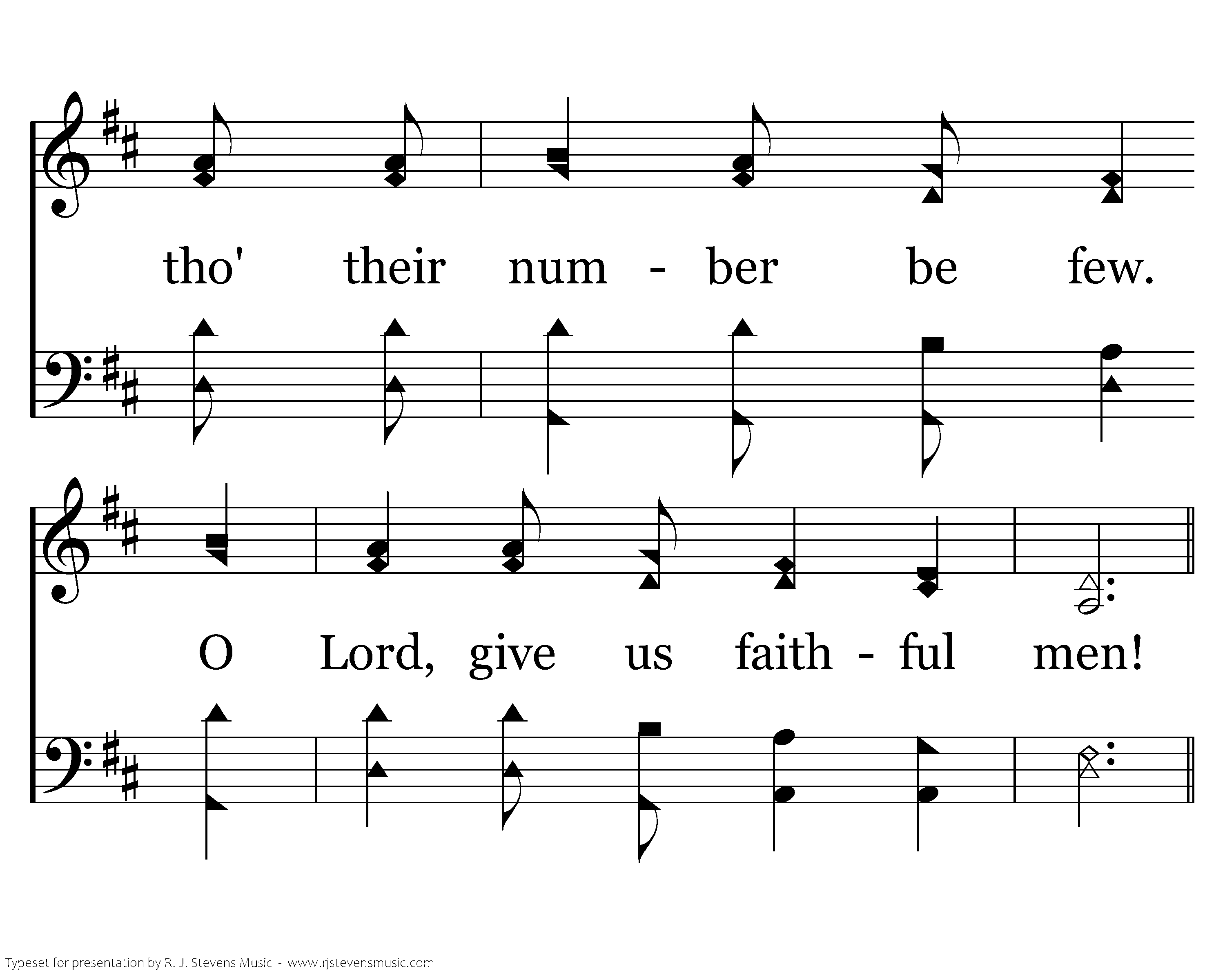 Give us men who are strong when the battle is long, Give us men with the will to win. Men courageous and true, though their number be few. O Lord, give us faithful men!