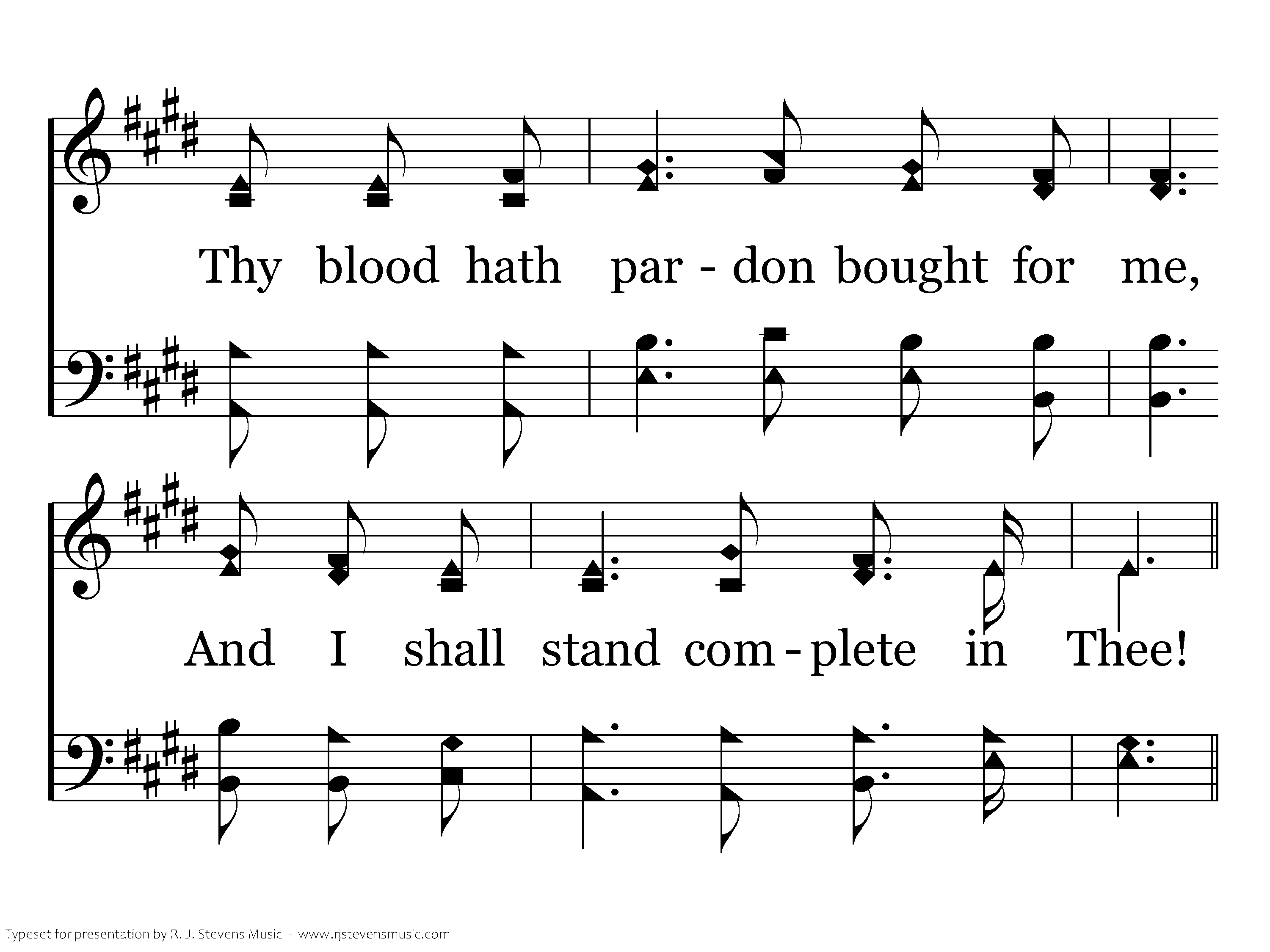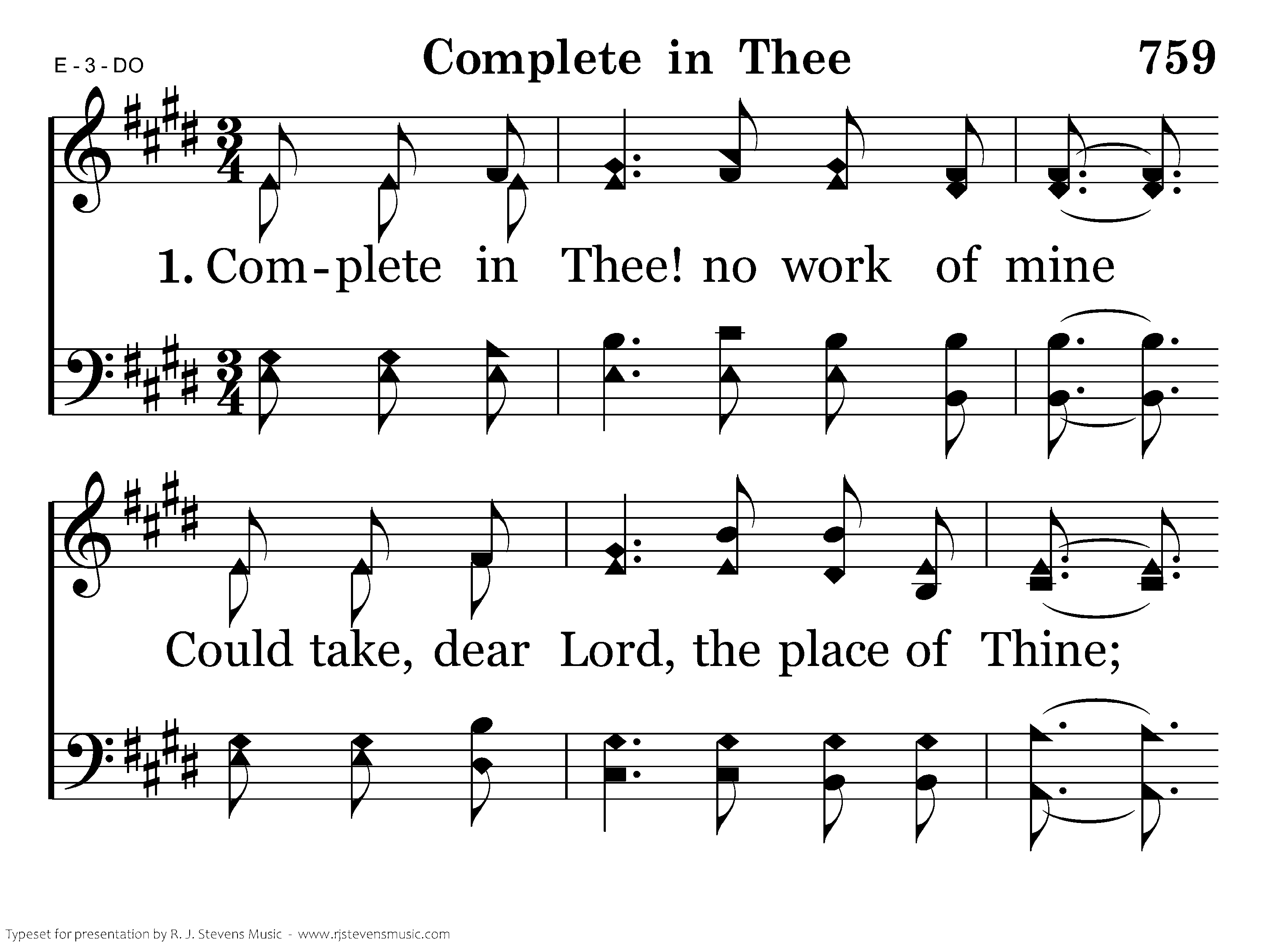 Complete in Thee! no work of mine Could take, dear Lord, the place of Thine; Thy blood hath pardon bought for me, And I shall stand complete in Thee!