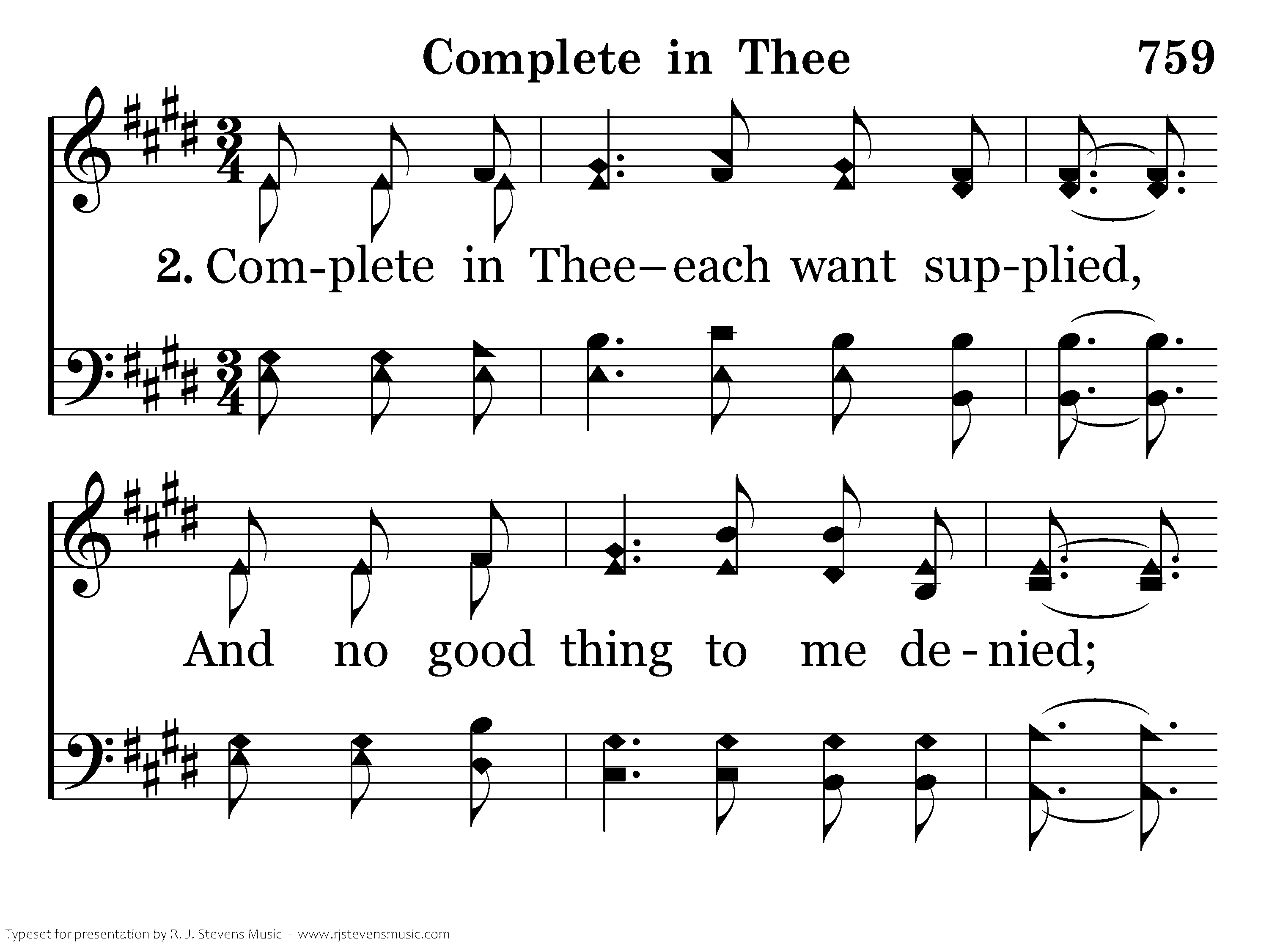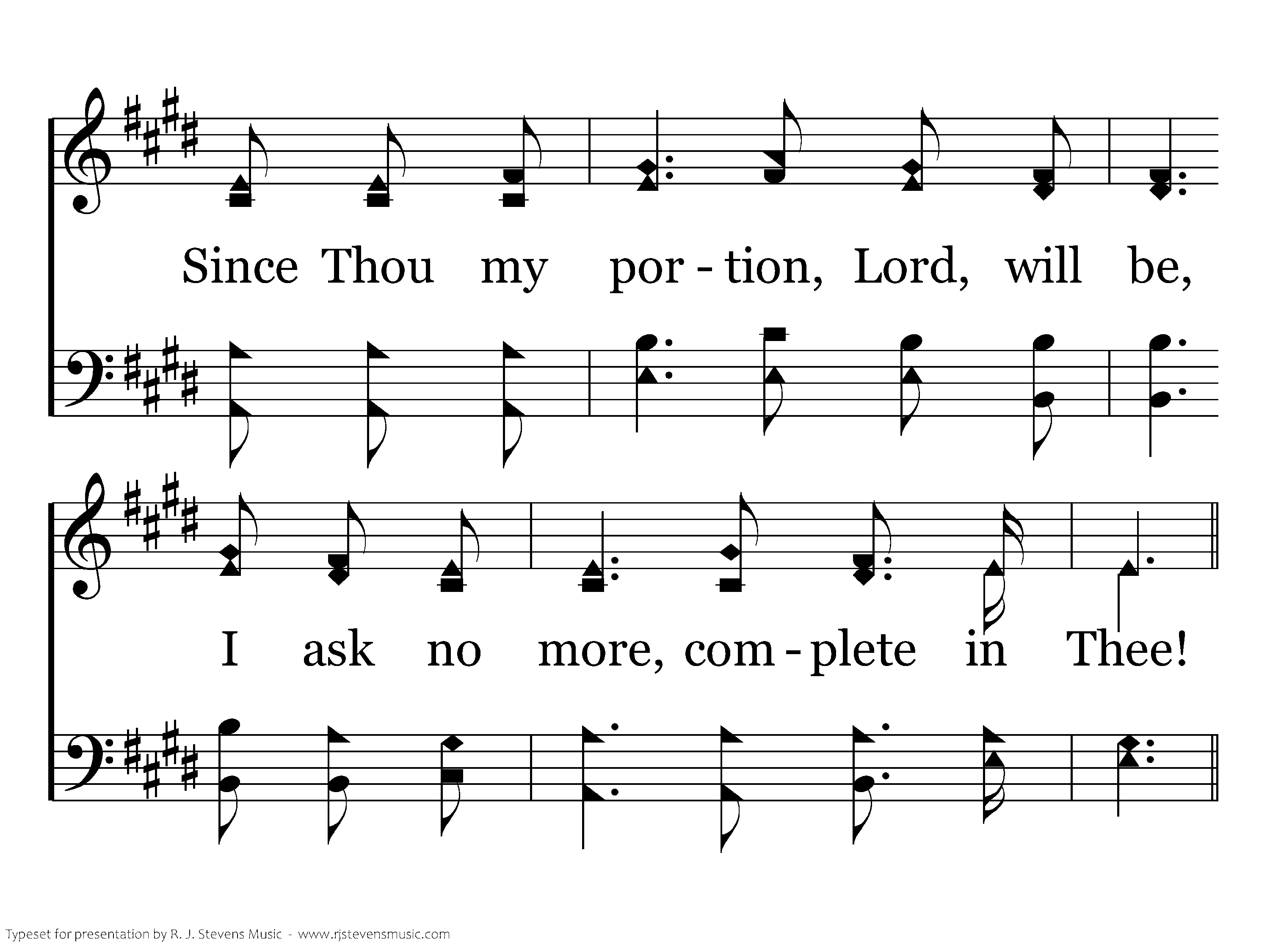 Complete in Thee each want supplied, And no good thing to me denied; Since Thou my portion, Lord, will be, I ask no more, complete in Thee!
