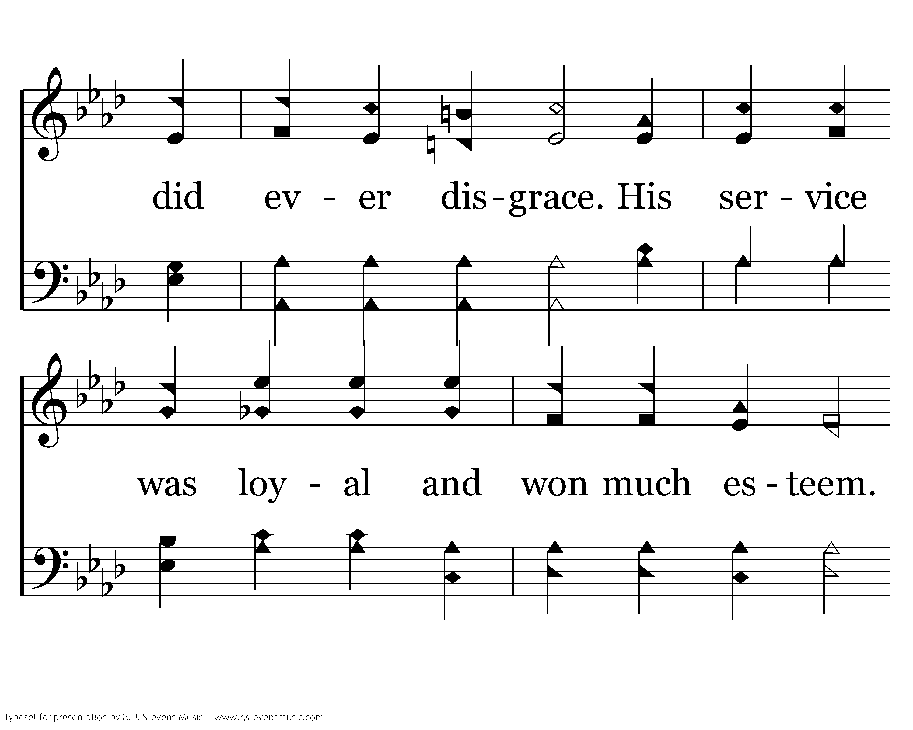 He served with courage, his faith was so strong. No bribe or threat did ever disgrace. His service was loyal and won much esteem. That honor and fame did not debase.