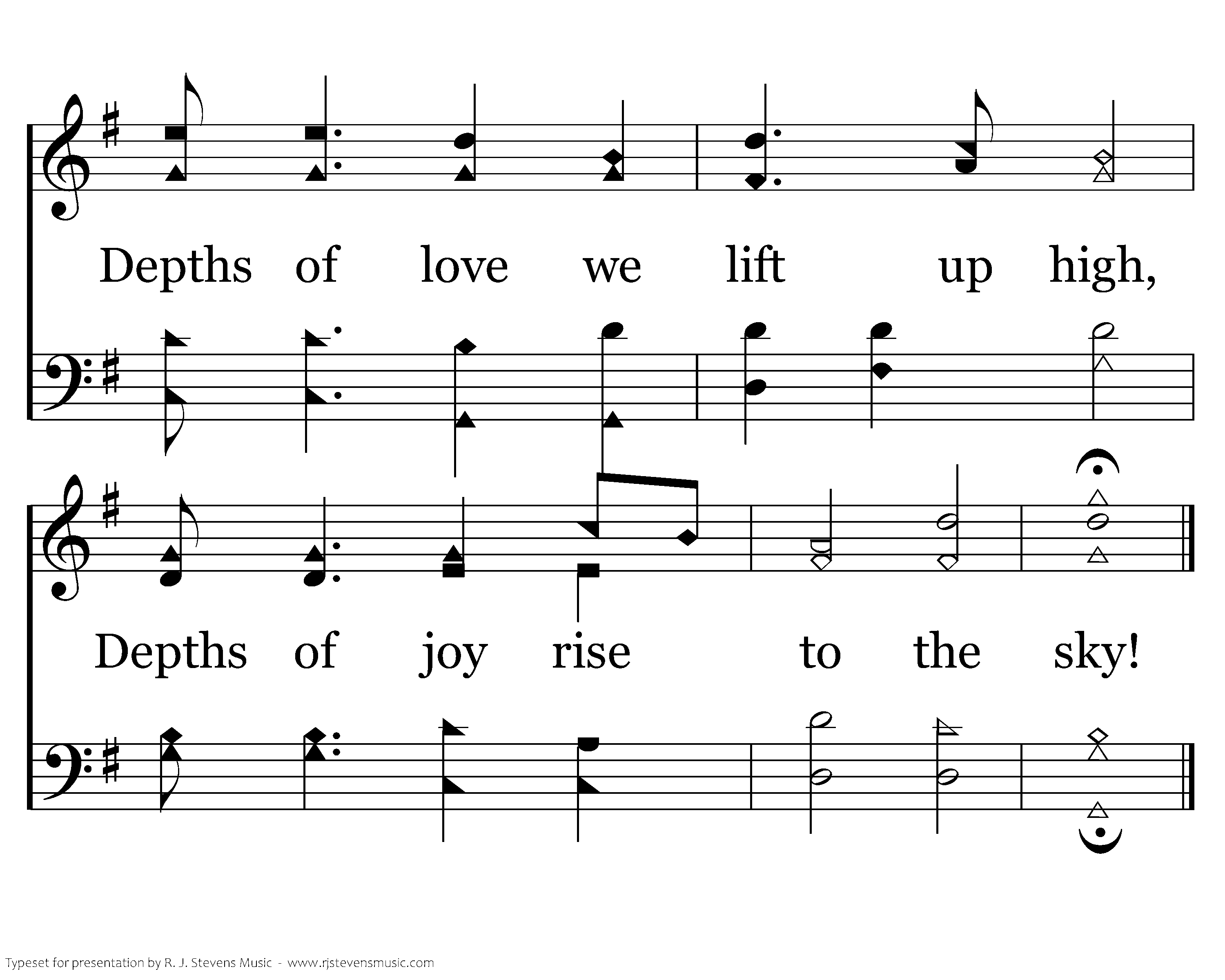We break forth in glorious praise; We break forth in mighty song. Depths of love we lift up high, Depths of joy rise to the sky!