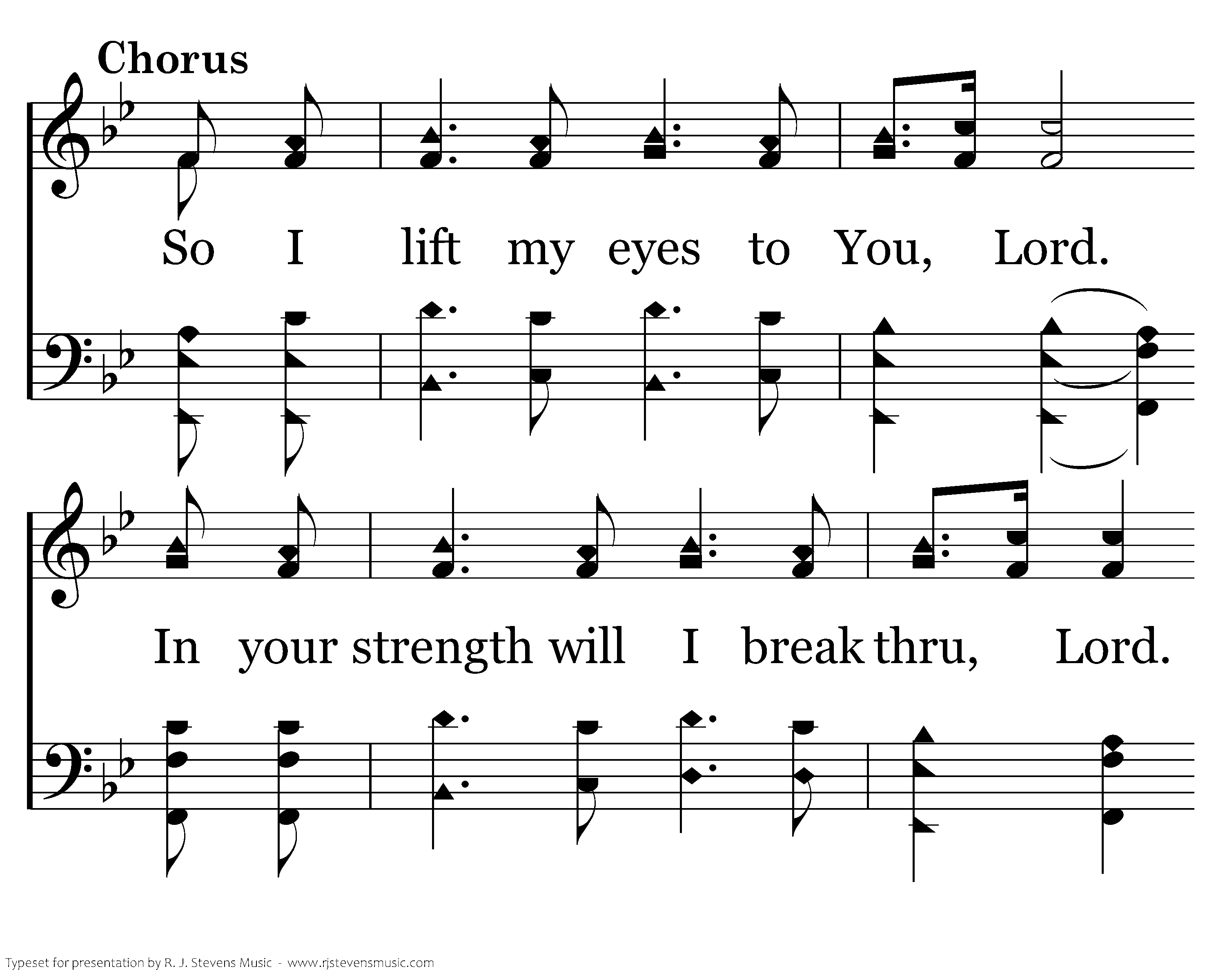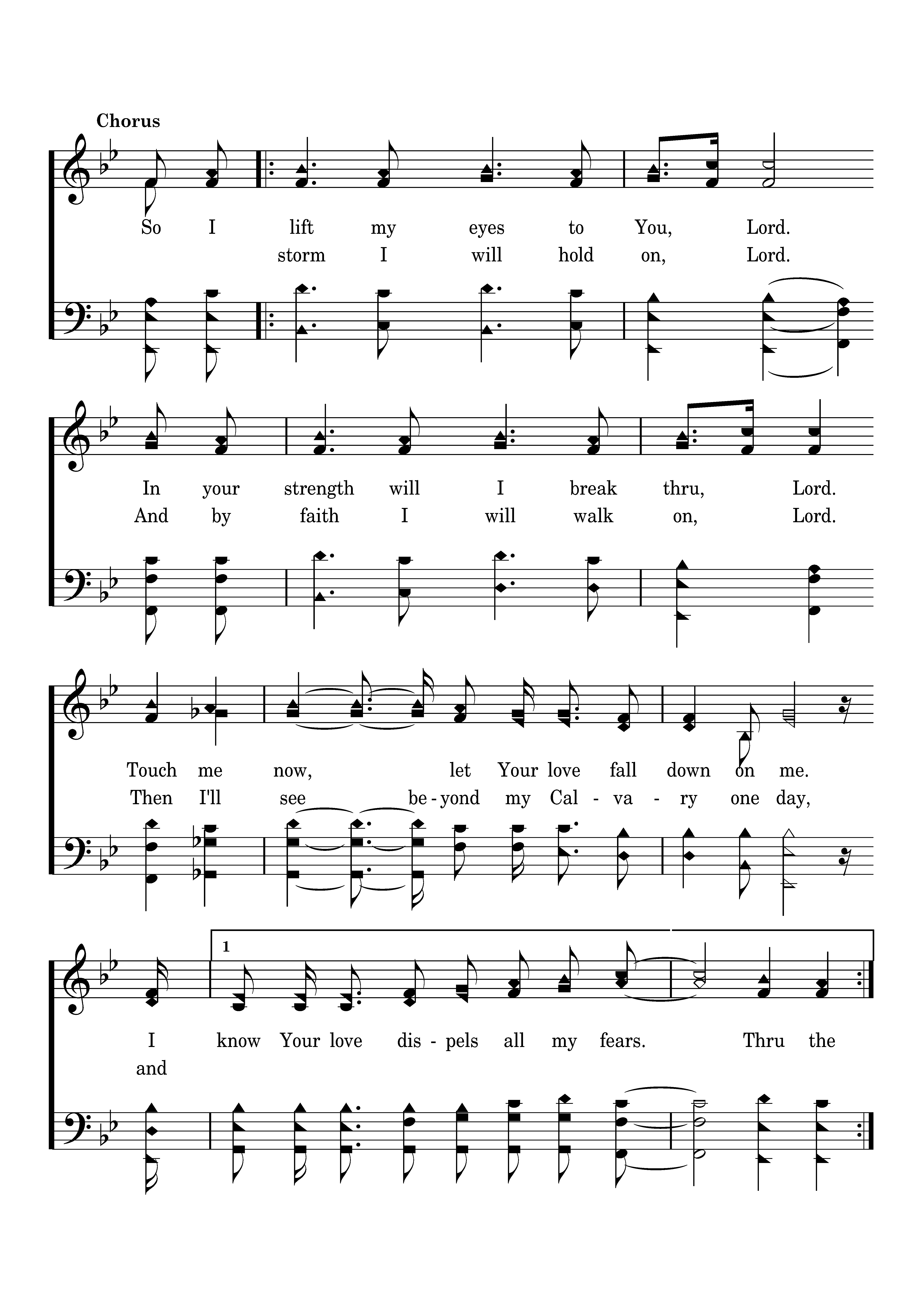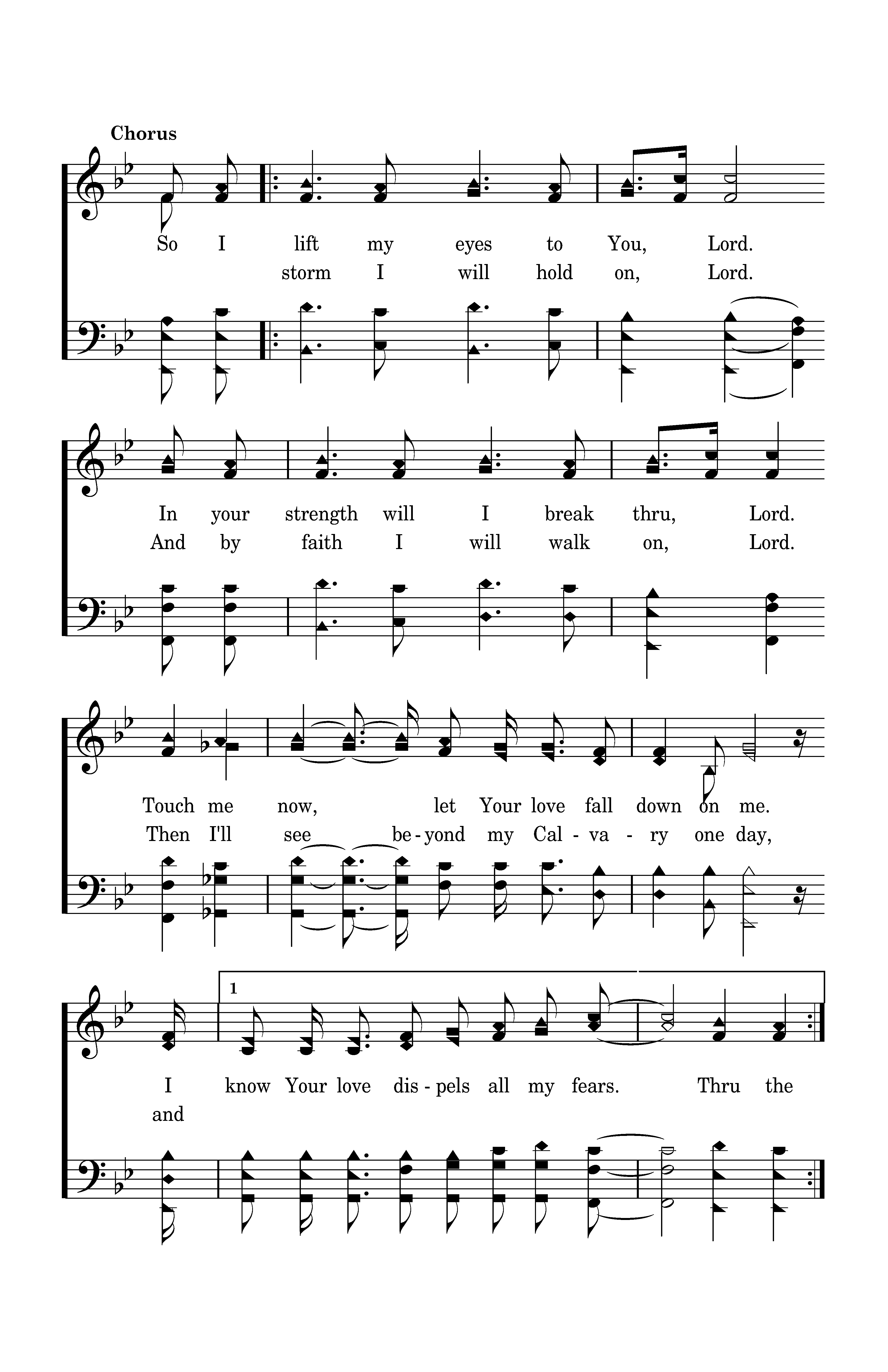 So I lift my eyes to you Lord. I your strength will I break thru, Lord. Touch me now, let Your love fall down on me. Thru the storm I will hold on, Lord. And by faith I will walk on, Lord. Then I'll see beyond my Calvary on day, And I will be complete in You.