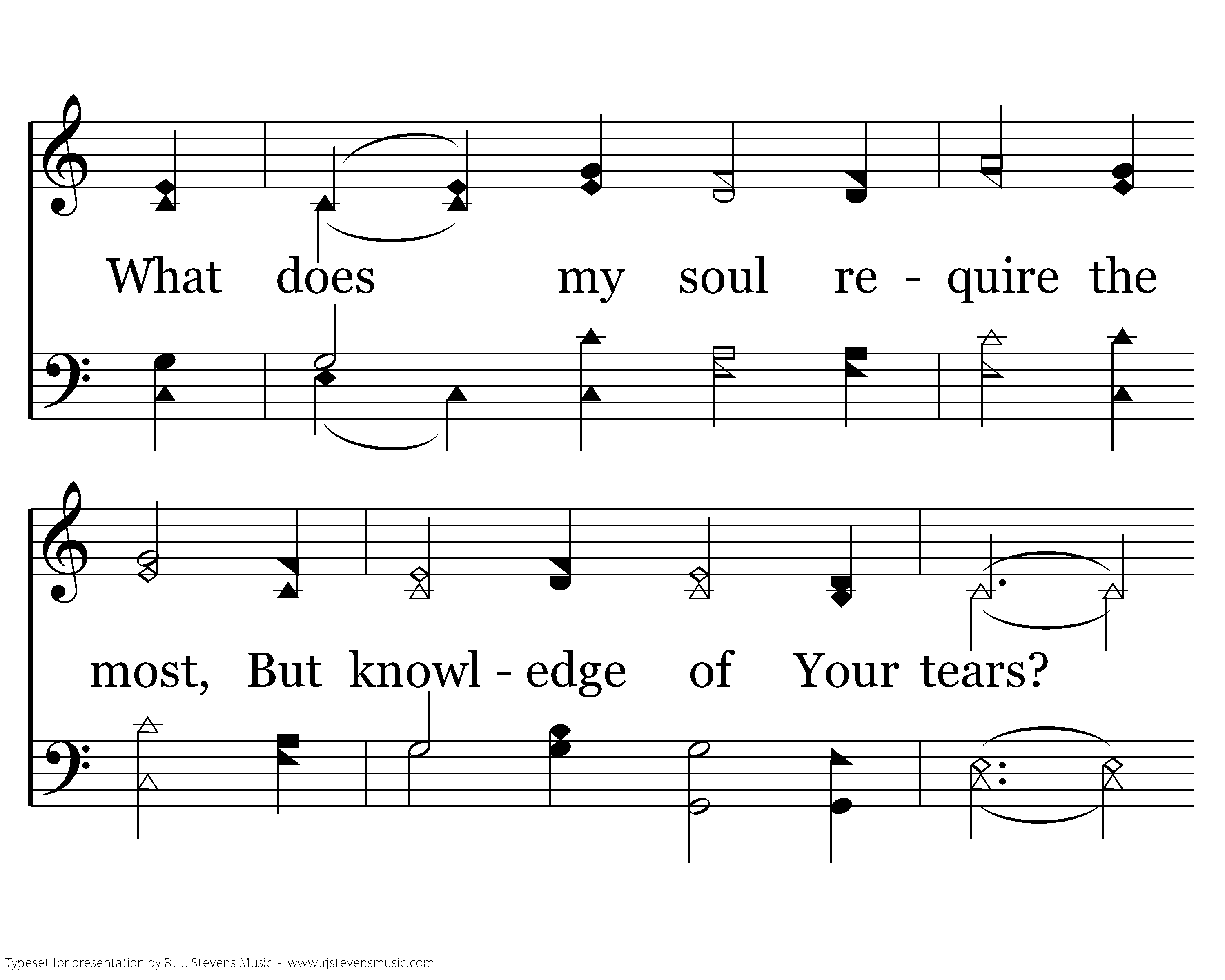 What will I ask of the , my Lord What are my deepest cares? What does my soul require the most, But knowledge of Your tears. And knowledge of Your grief, my Lord, Reminded day by day. Reminede of Your precious life, The heathens took away.