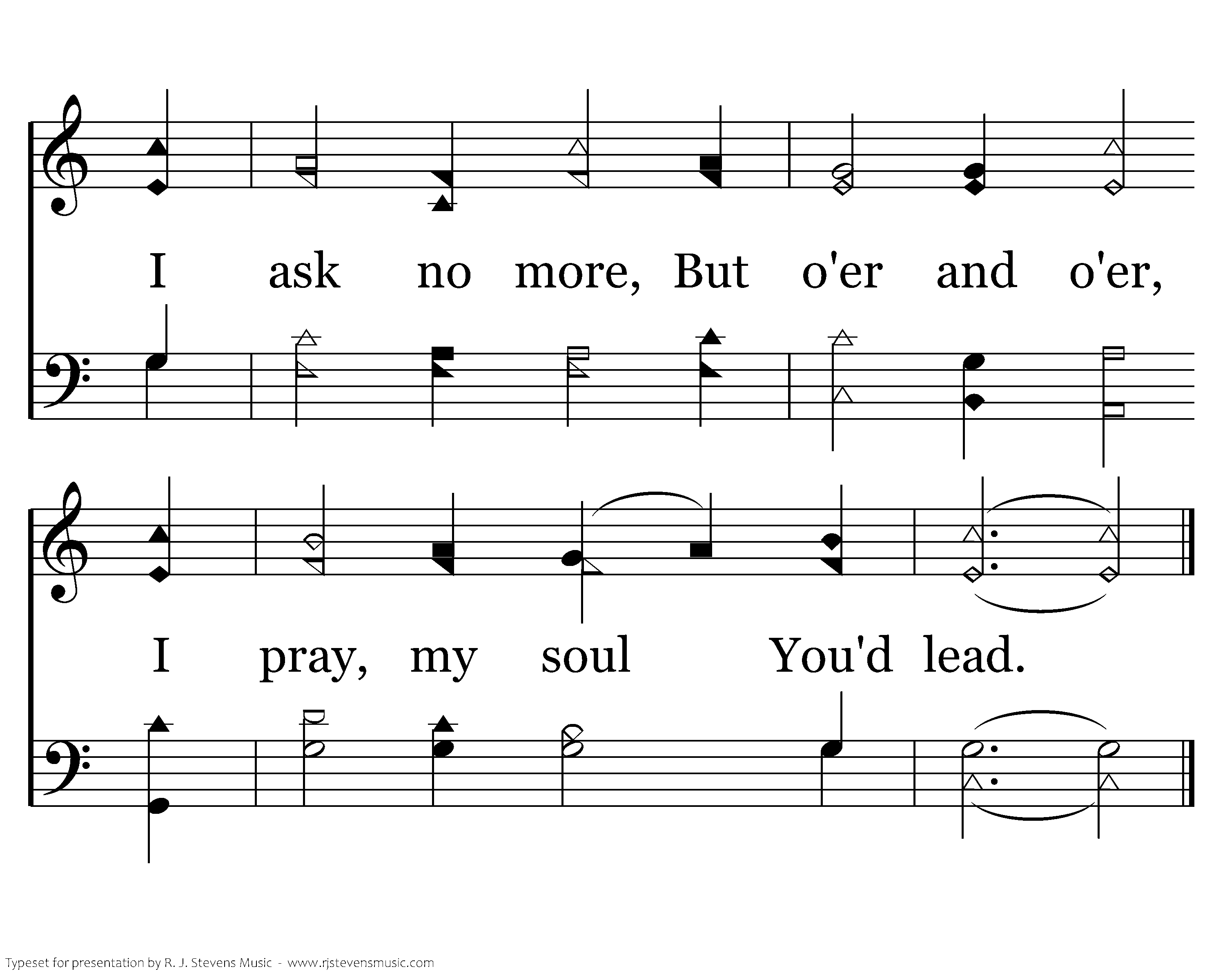 You'd let me live, I know not why, Nor have I need to know. But 'twas Your grace downward came, And touched me long ago. What will I ask of Thee, O Lord? I have no earthly need. I ask no more, But o'er and o'er, I pray my soul You'd lead.
