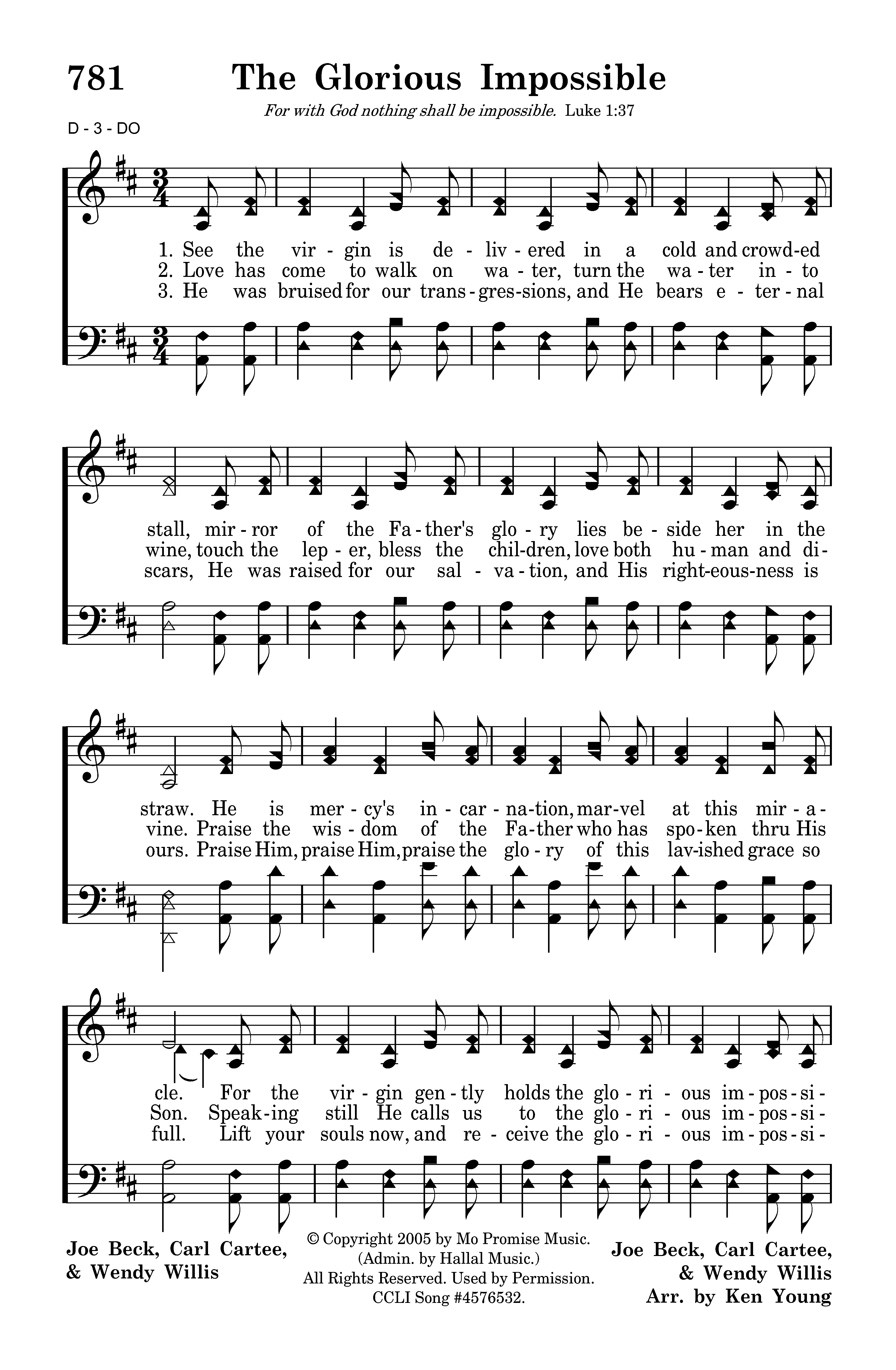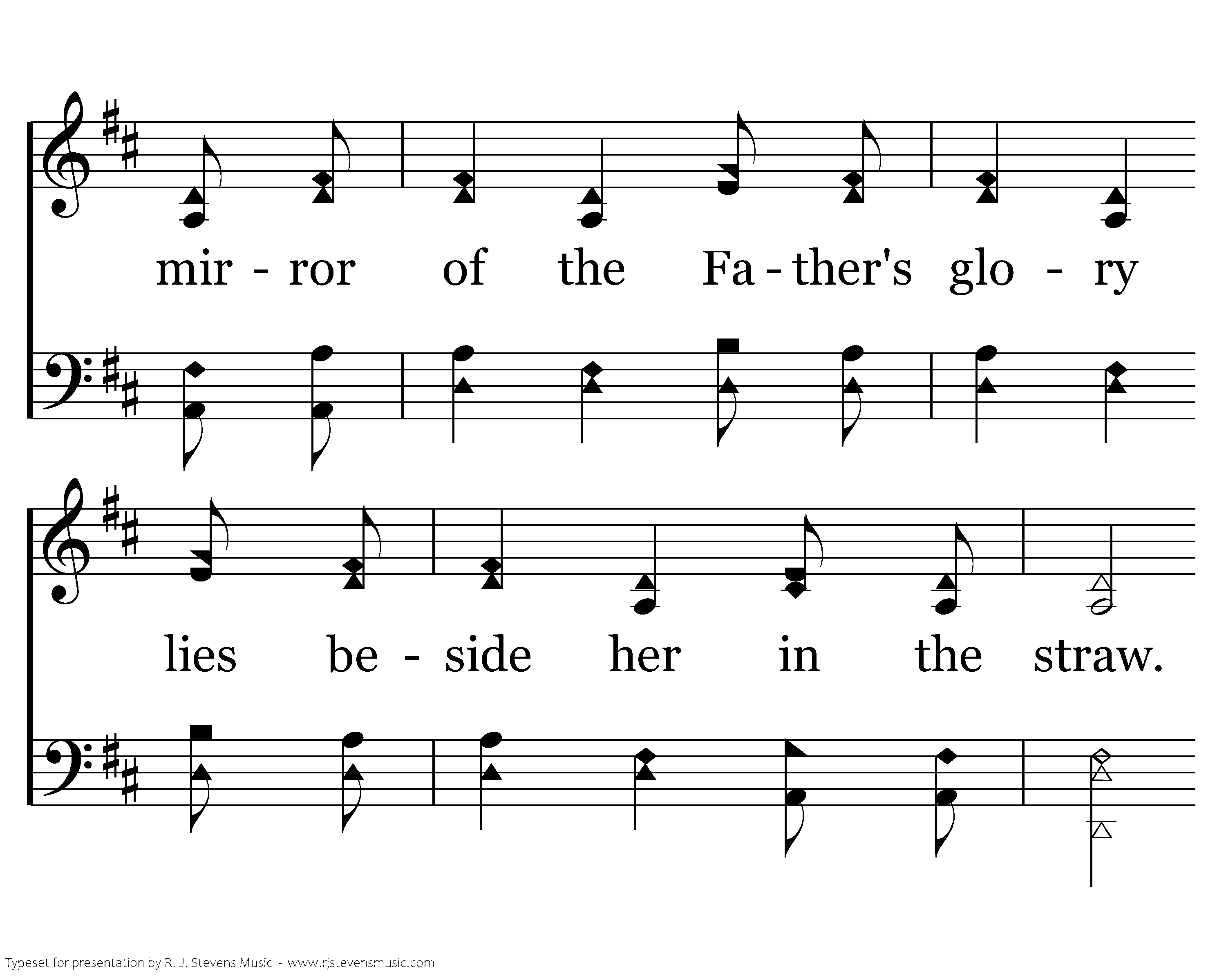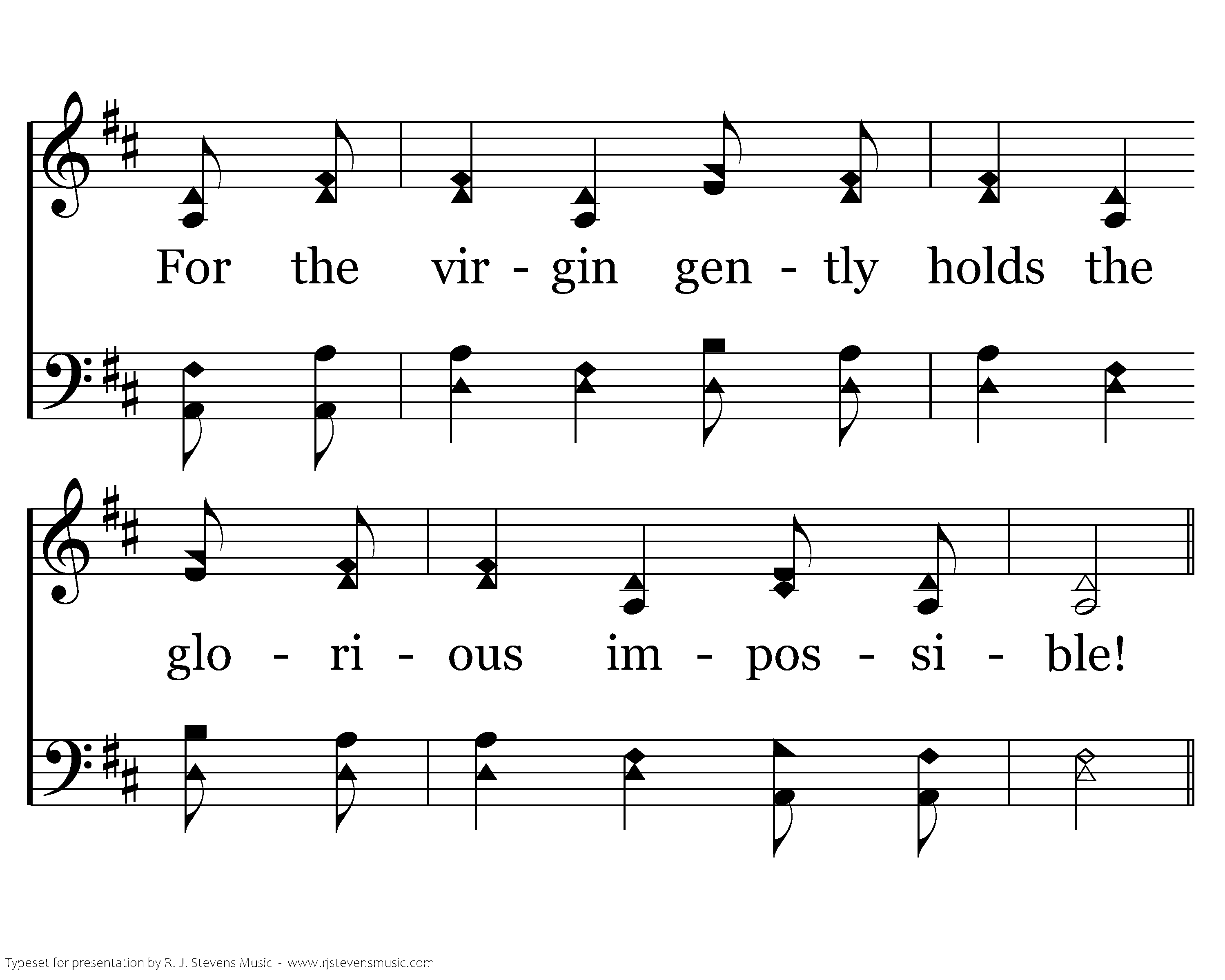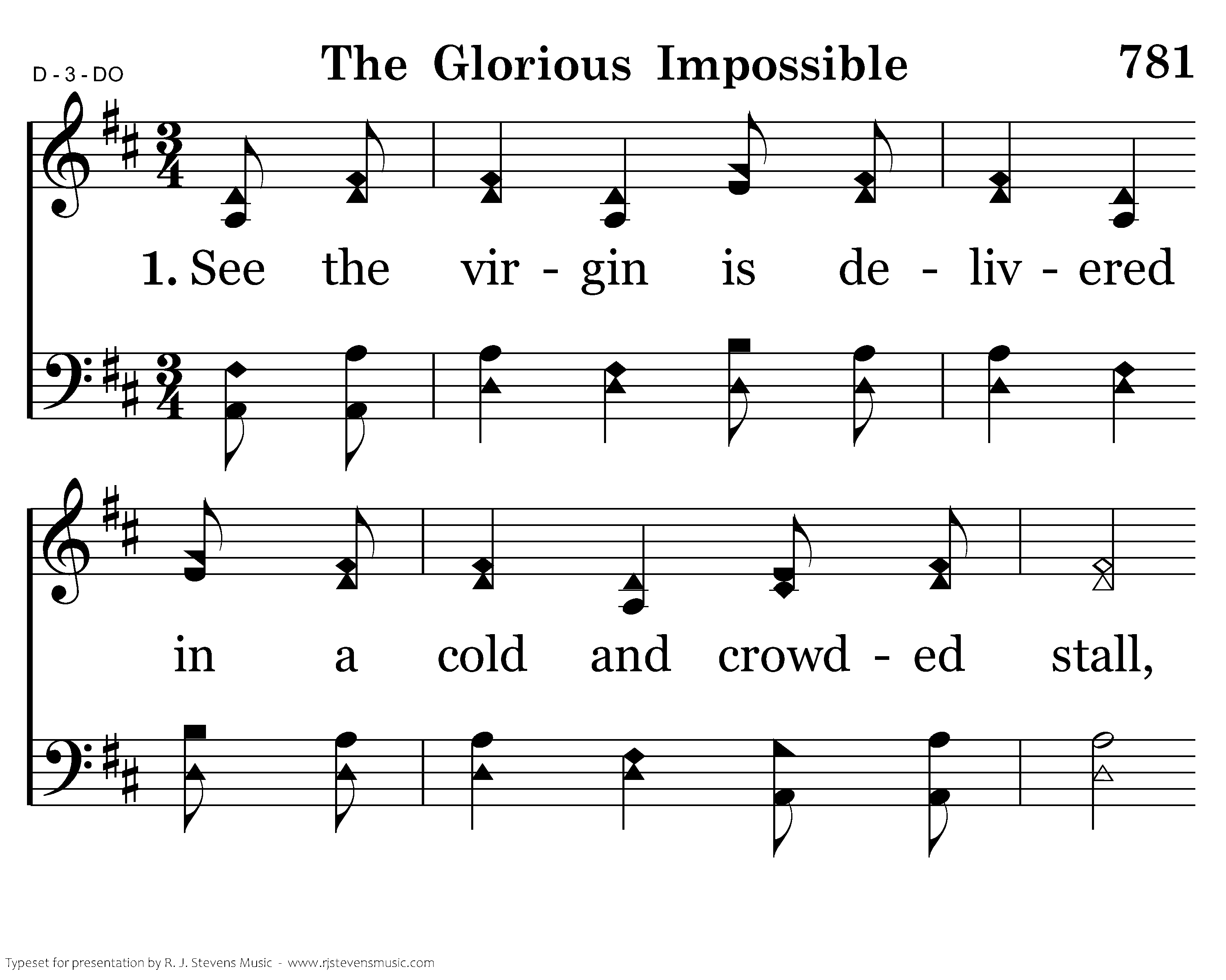 See the virgin is delivered in a cold and crowded stall, mirror of the Father's glory lies beside her in the straw. He is mercy's incarnation, marvel at this miracle. For the virgin gently holds the glorious impossible!