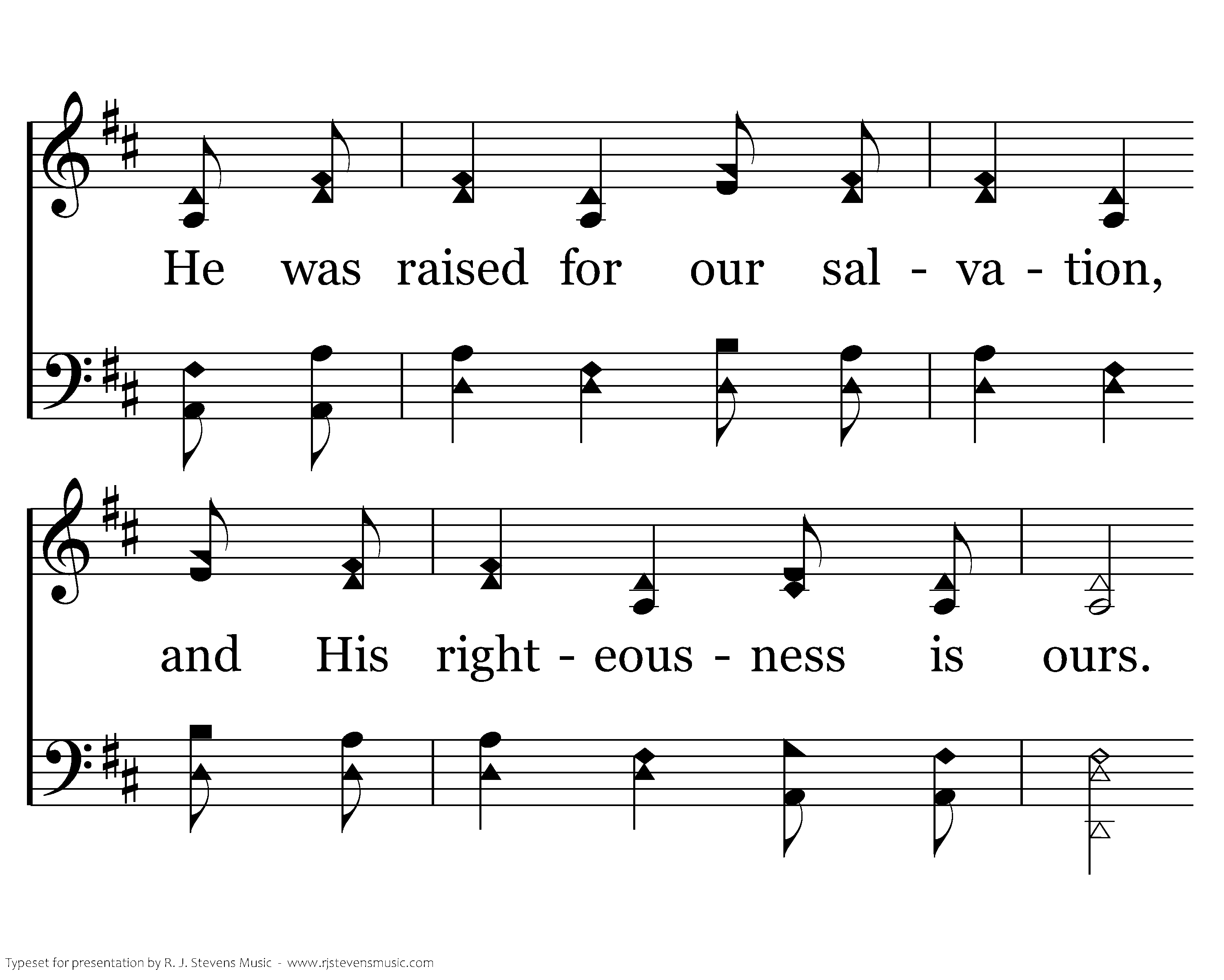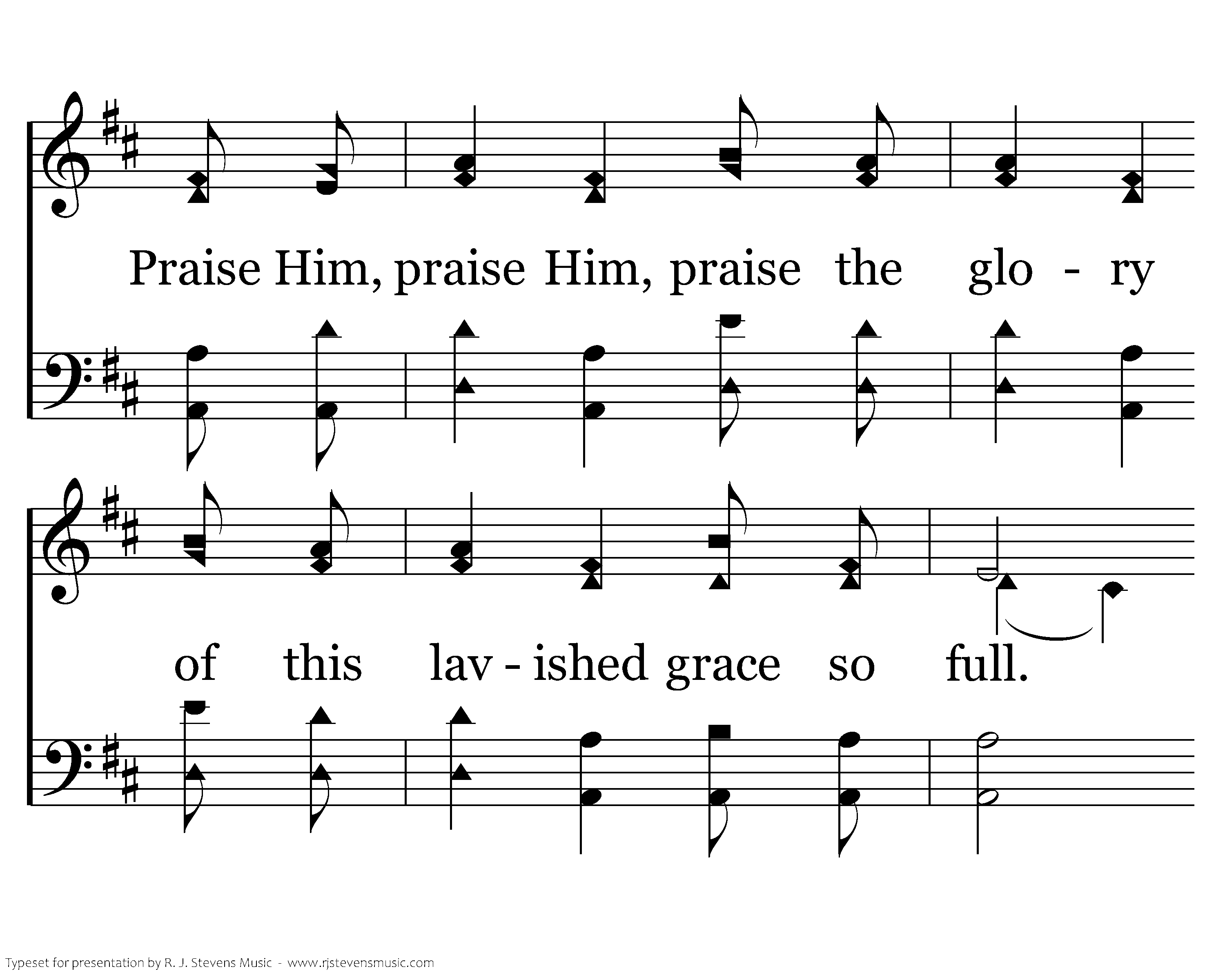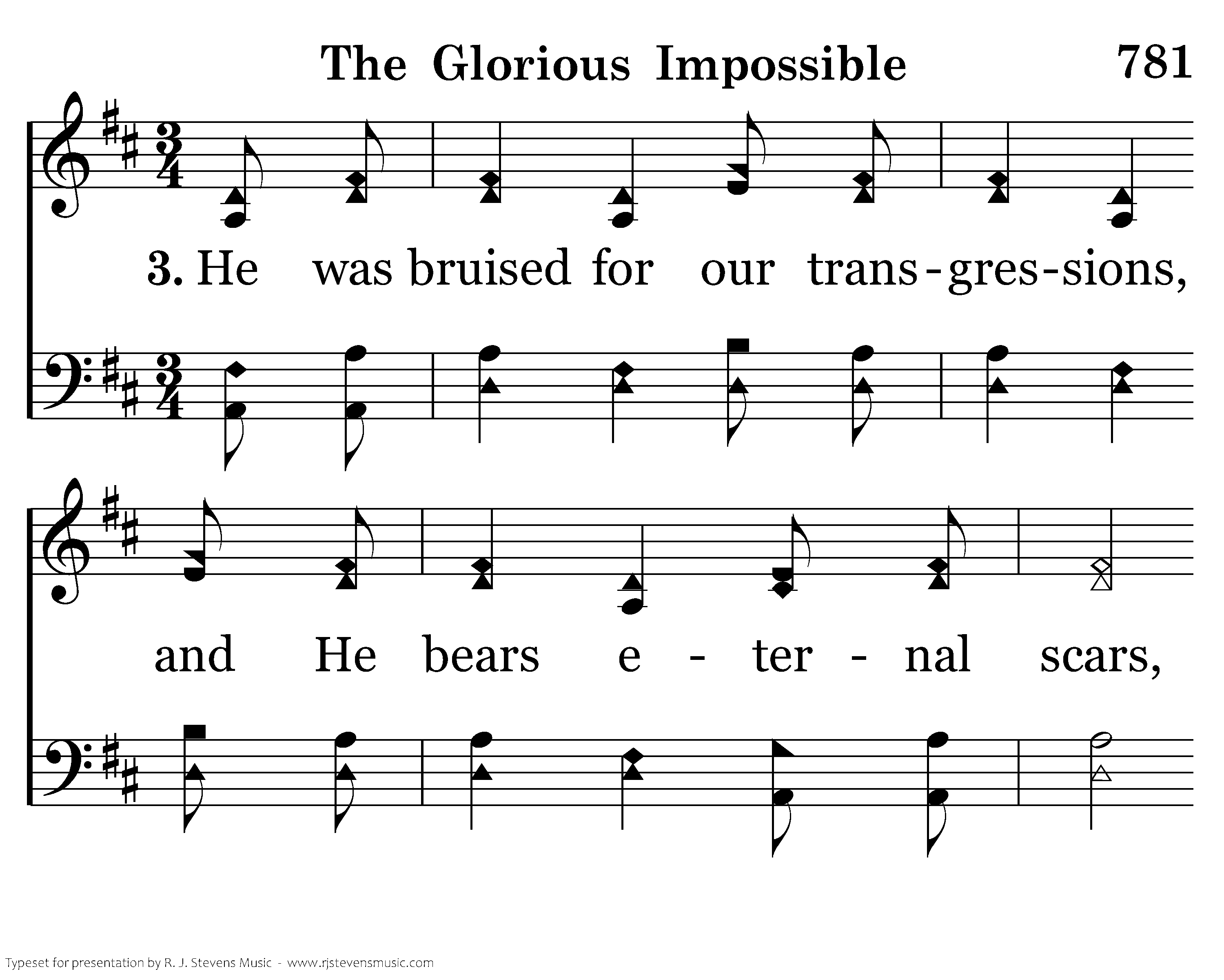 He was bruised for our transgressions, and He bears eternal scars, He was raised for our salvation, and His righteousness is ours. Praise Him, praise Him, praise the glory of this lavished grace so full. Lift your souls now, and receive the glorious impossible!
