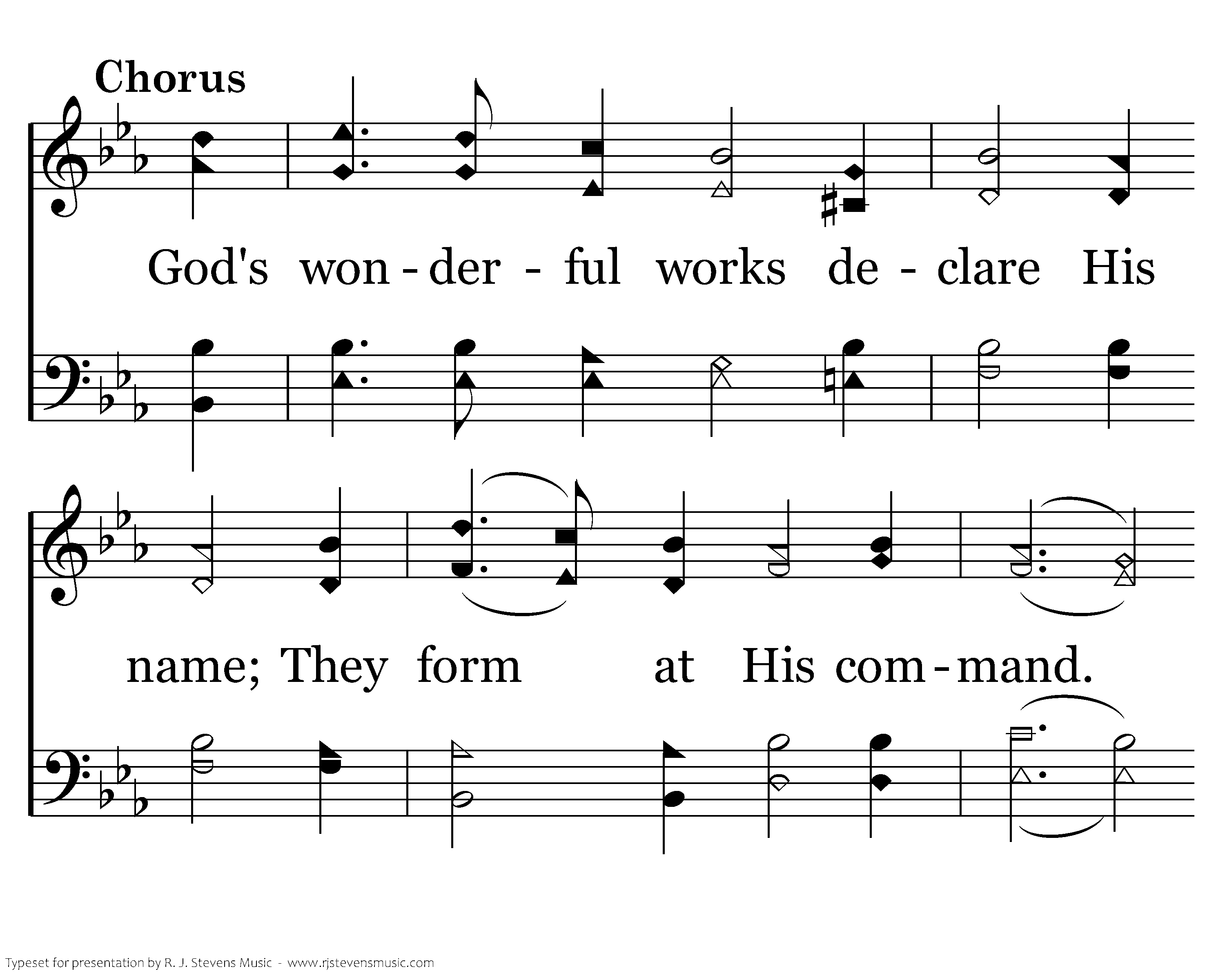 God's wonderful works declare His name; They form at His command. His power let the world proclaim Too great to understand.