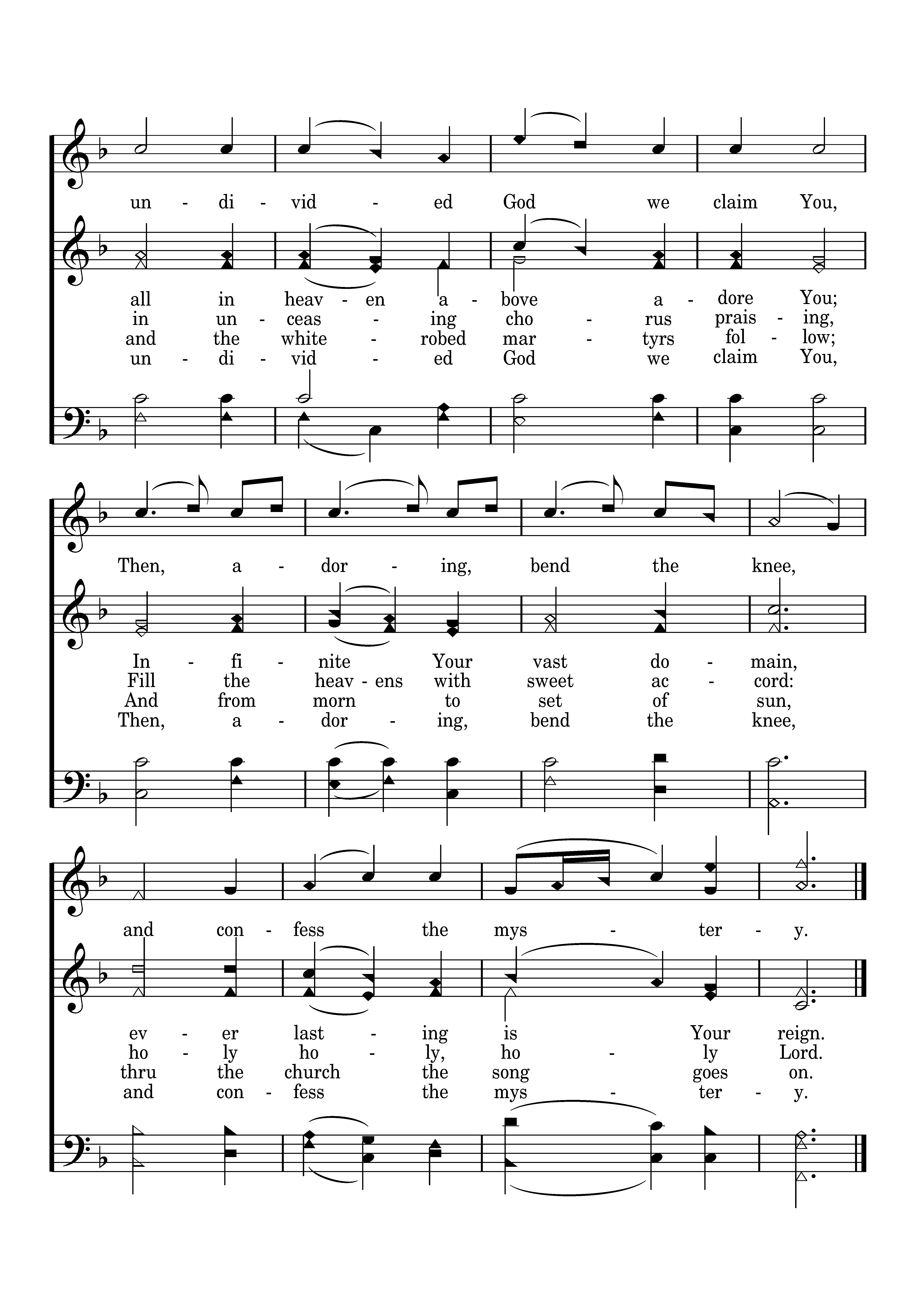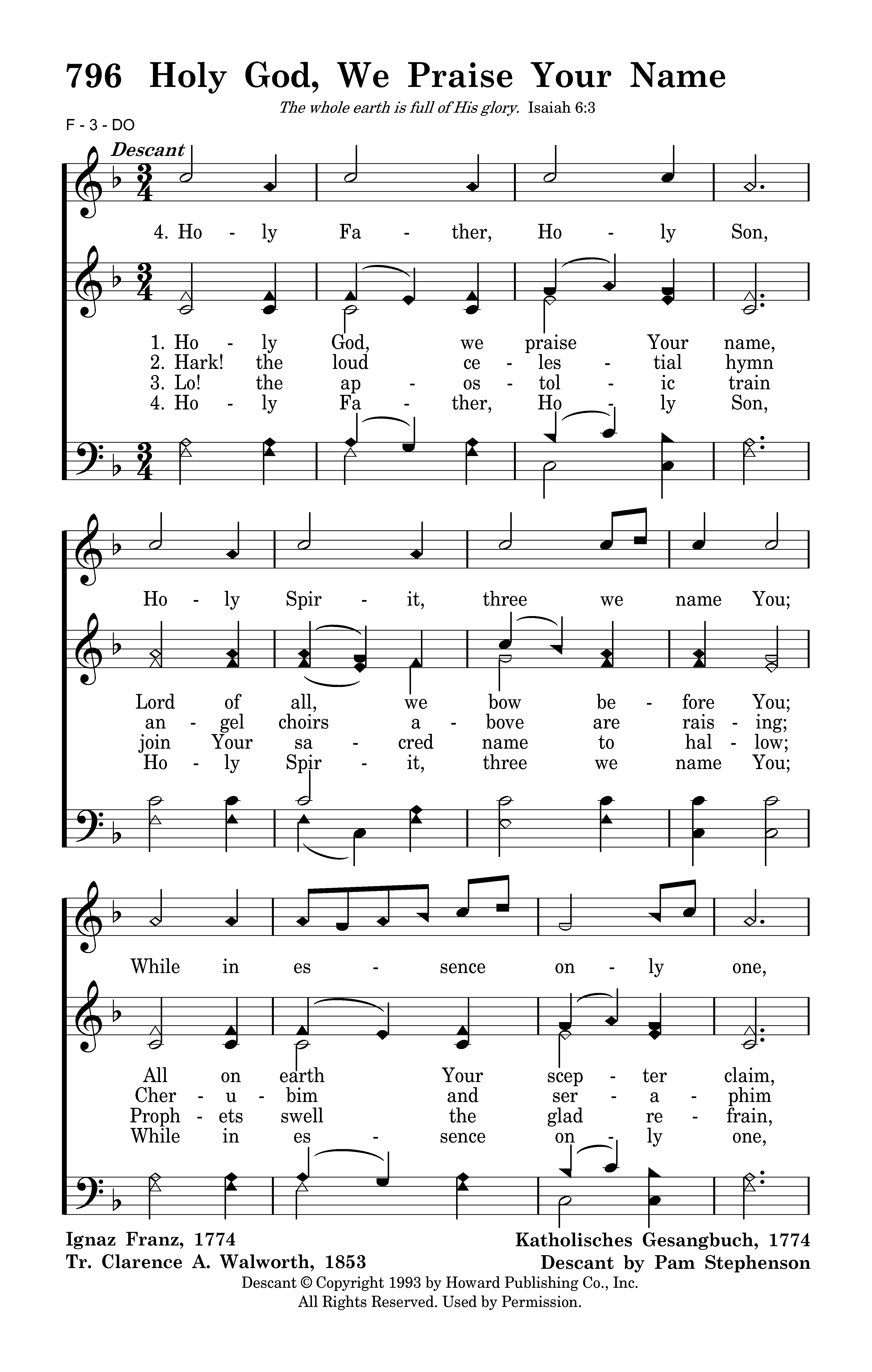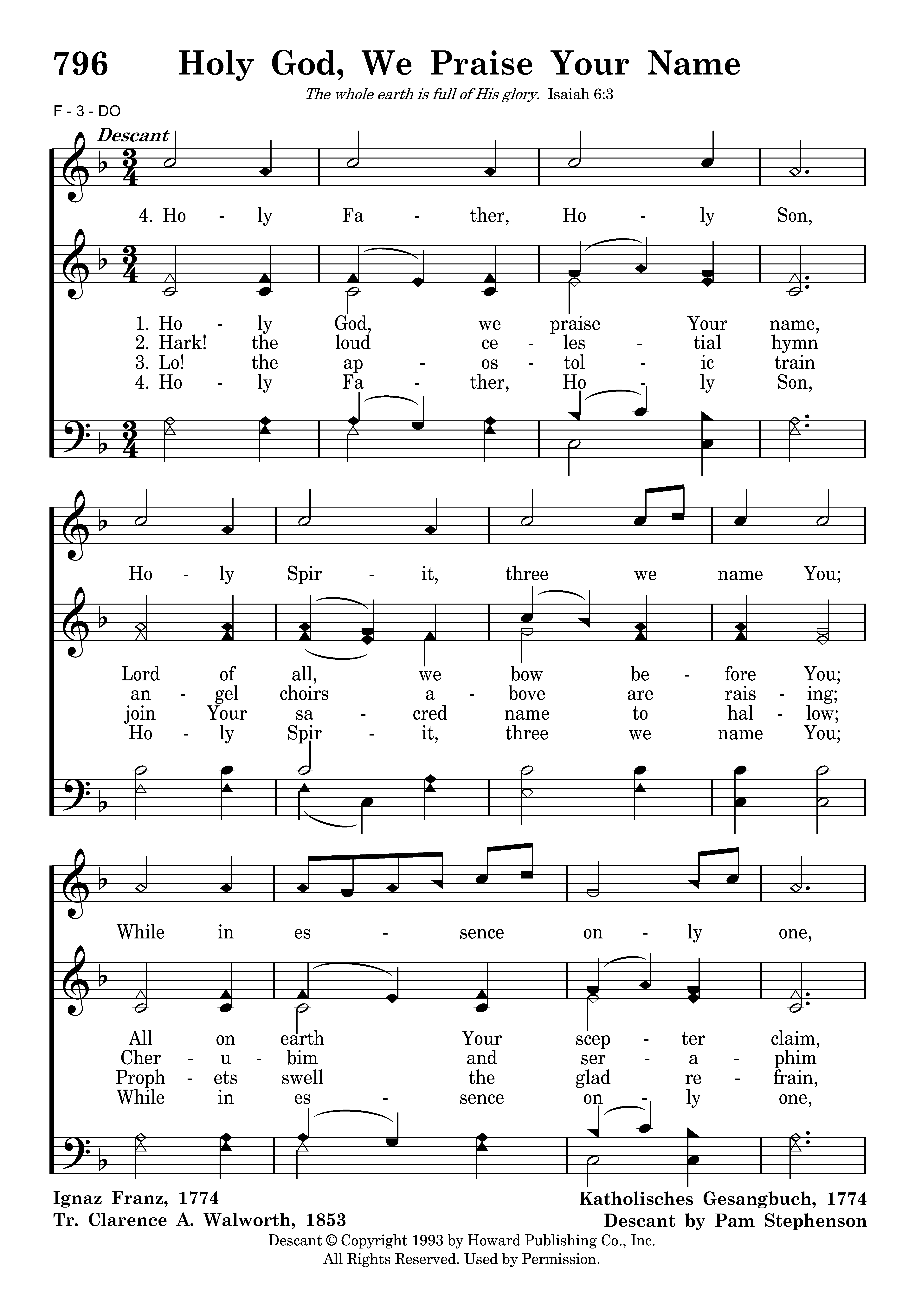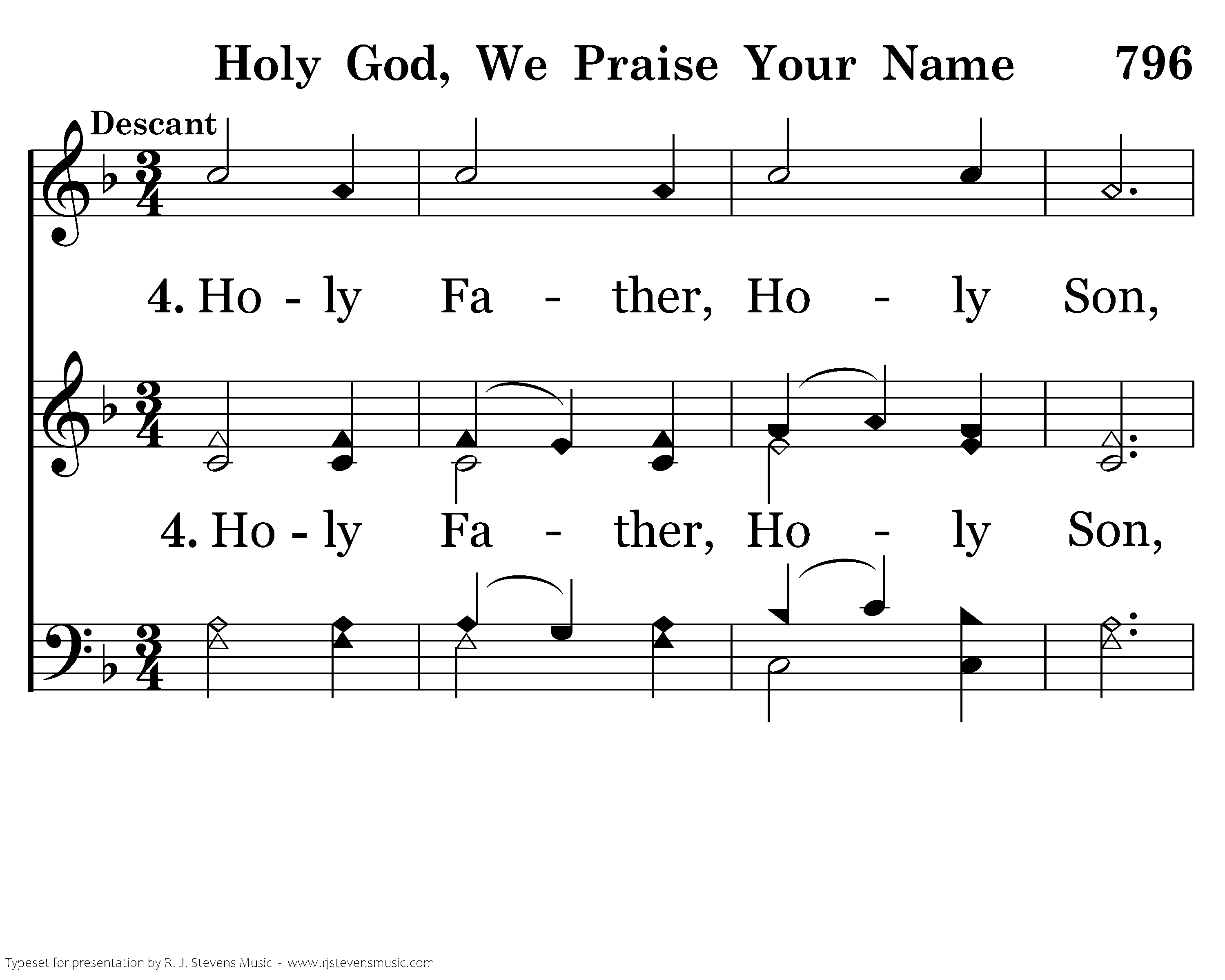 Holy God we praise Your name, Lord of all, we bow before you All the earth Your scepter claim All in heaven above adore You; Infinite Tour vast domain, ever lasting is Your reigh. Holy Father, Holy Son Holy Spirit, three we name You While in essence only one, undivided God we claim You, Then adoring bend the knee, and confess the mystery.