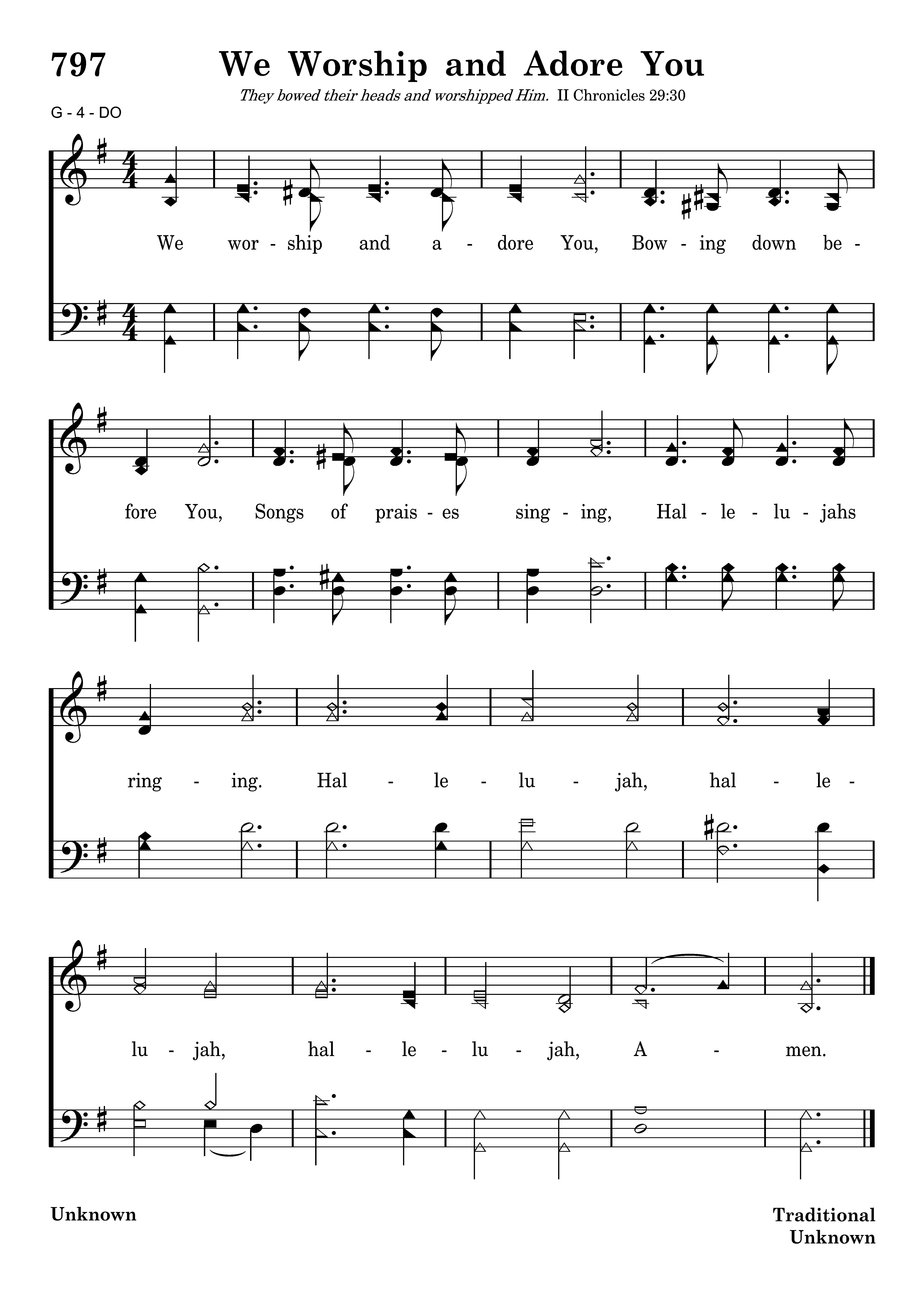 We worship and adore You, Bowing down beforeYou, Song of praises singing, Hallelujahs ringing, Hallelujah, hallelujah, hallelujah, Amen.