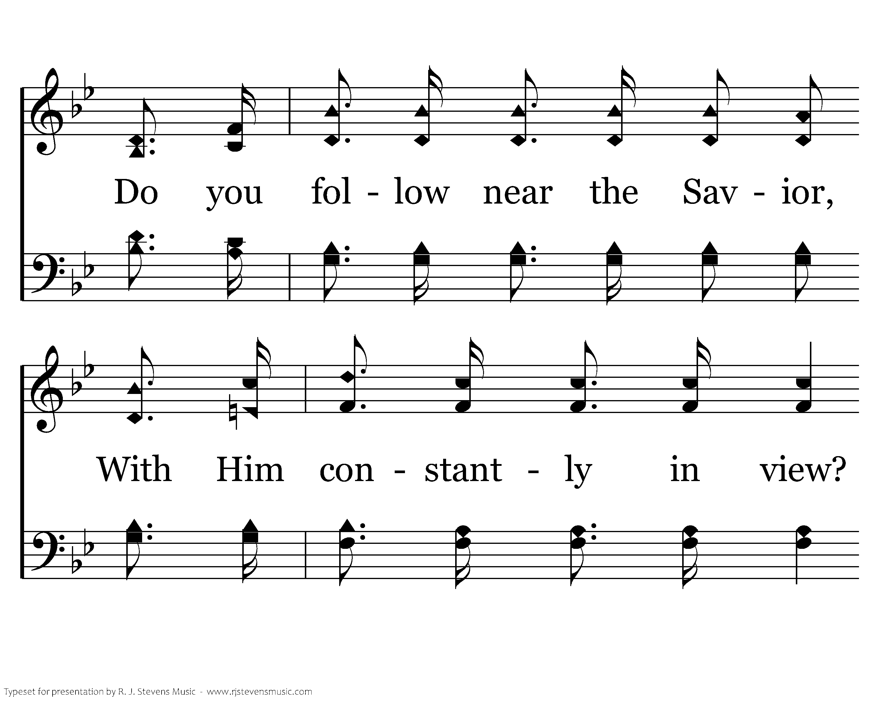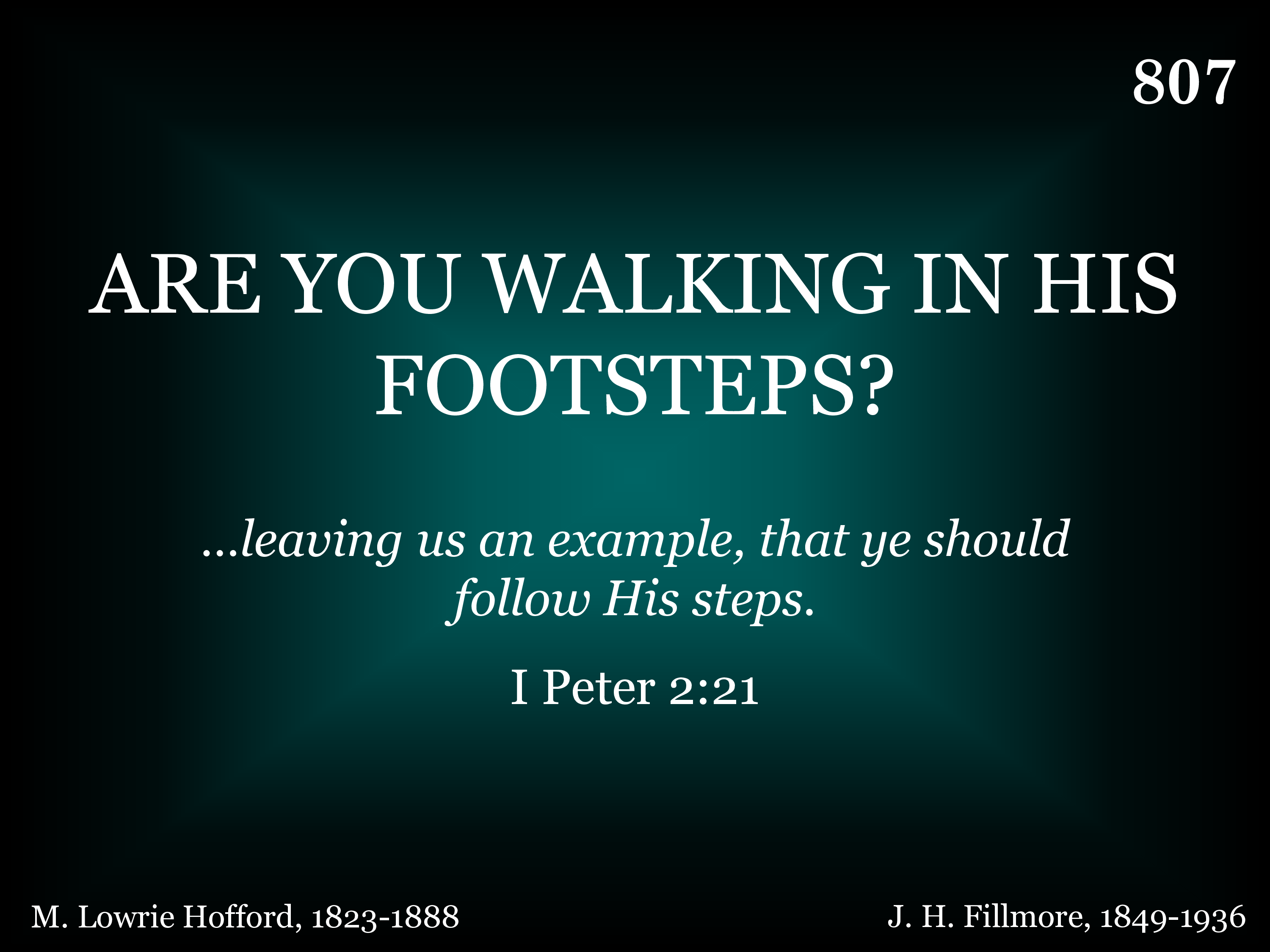 Are you walking in His footsteps, As He bids you daily do; Do you follow near the Savior, With Him constantly in view? In the sunshine and the shadow, In the darkness and the light, Are you pressing in your journey To the land of pure delight?