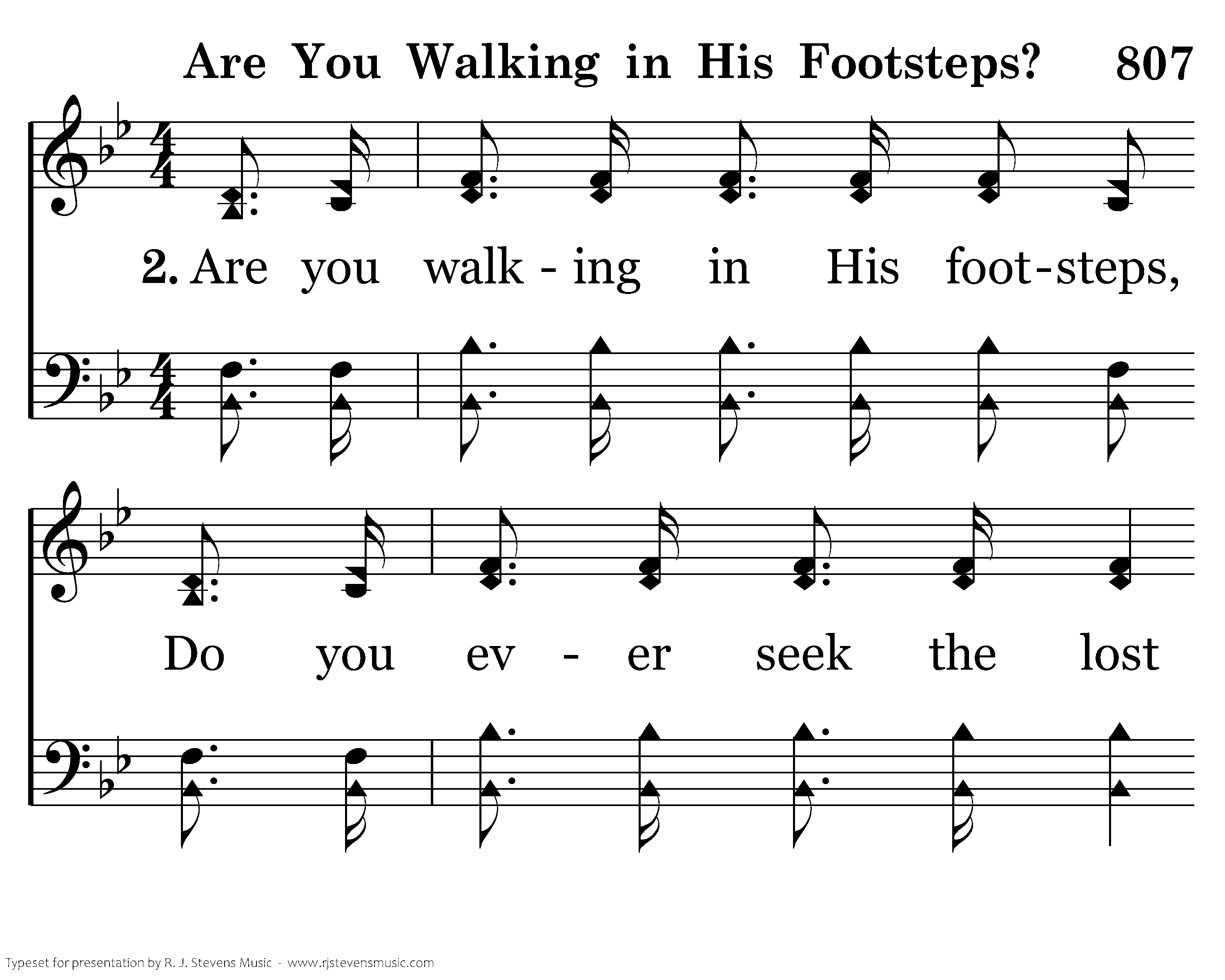 Are you walking in His footsteps, Do you ever seek the lost In the mountainss and the desert, Whatsoe'er may be the cost? In the highway and the byways, Are your footsteps ever found, Where His weary feet so footsore, Left their marks upon the ground?
