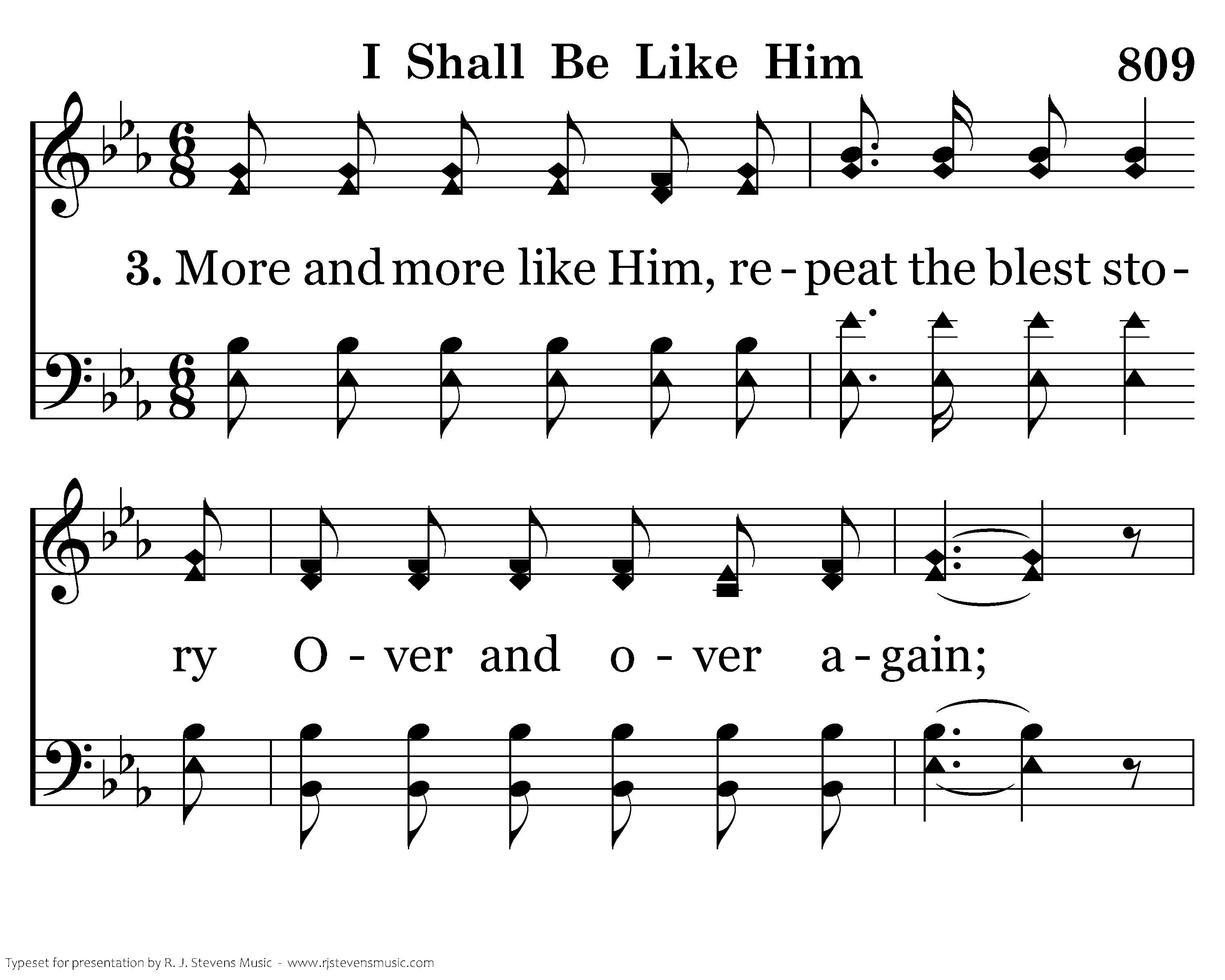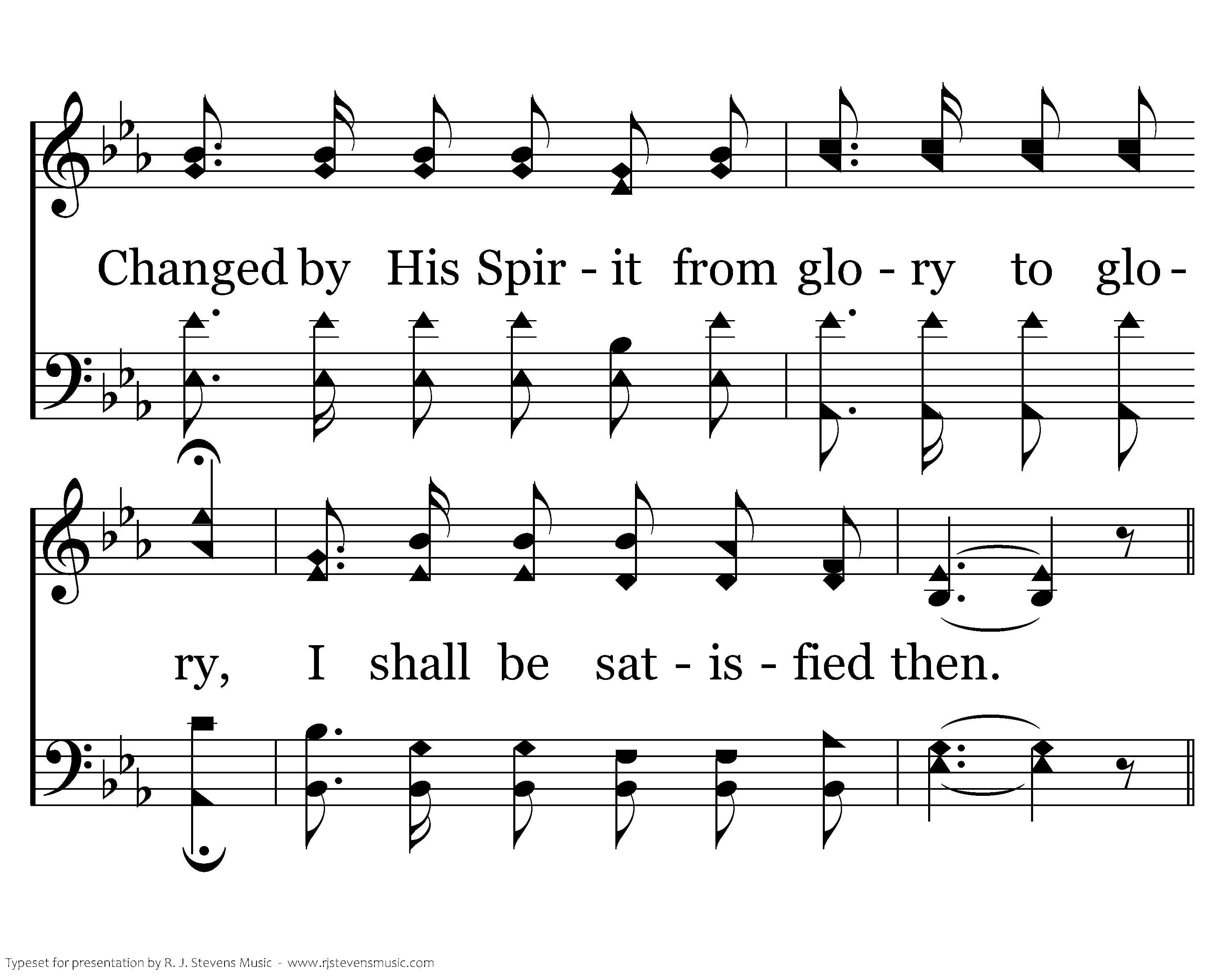 More and more like Him, repeat the blest story Over and over again; Changed by His Spirit from glory to glory, I shall be satisfied then.